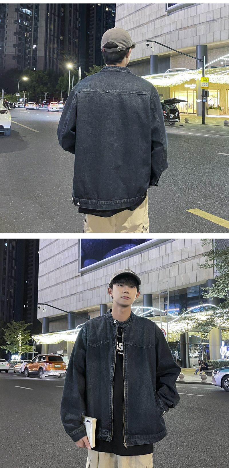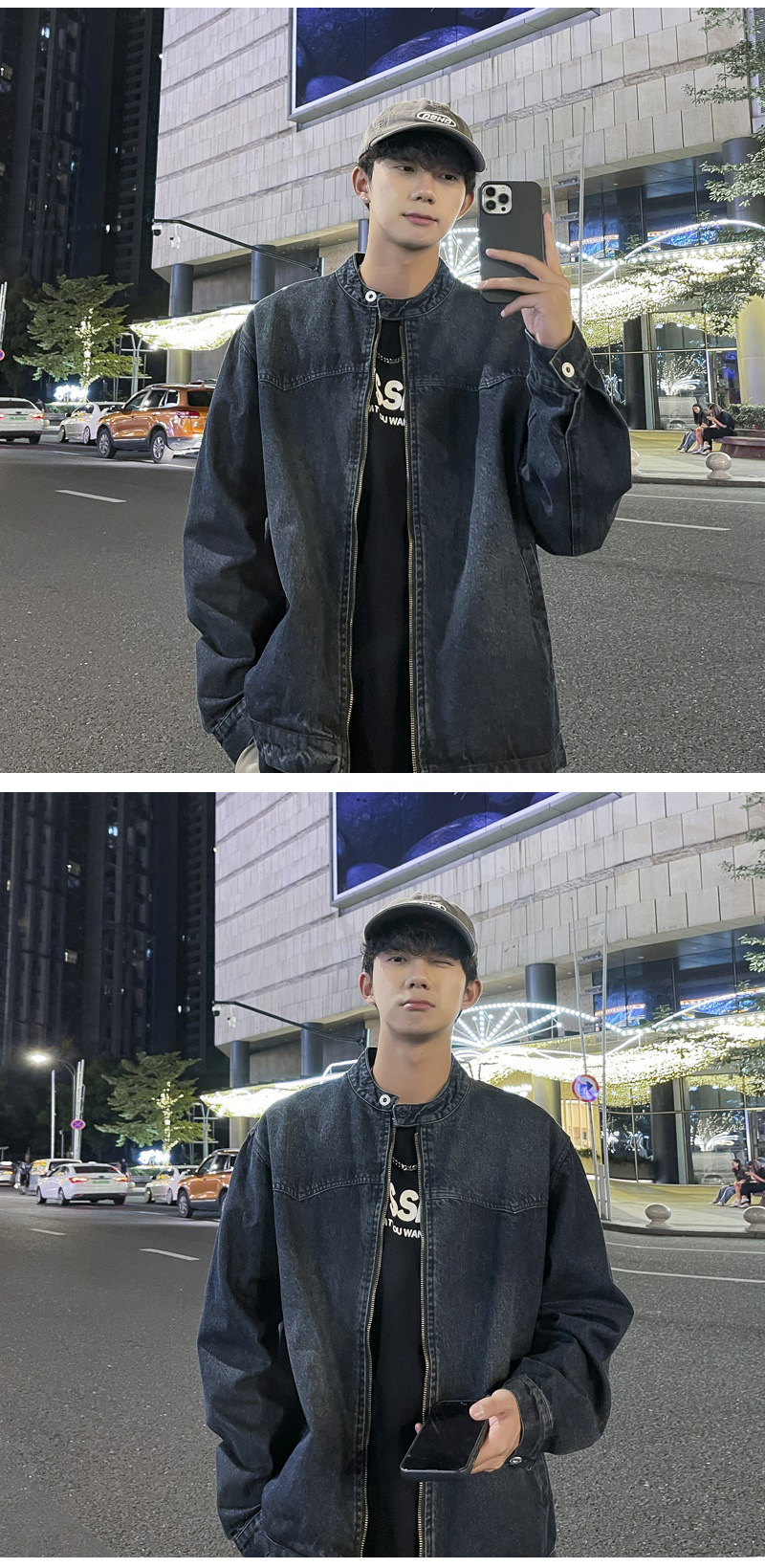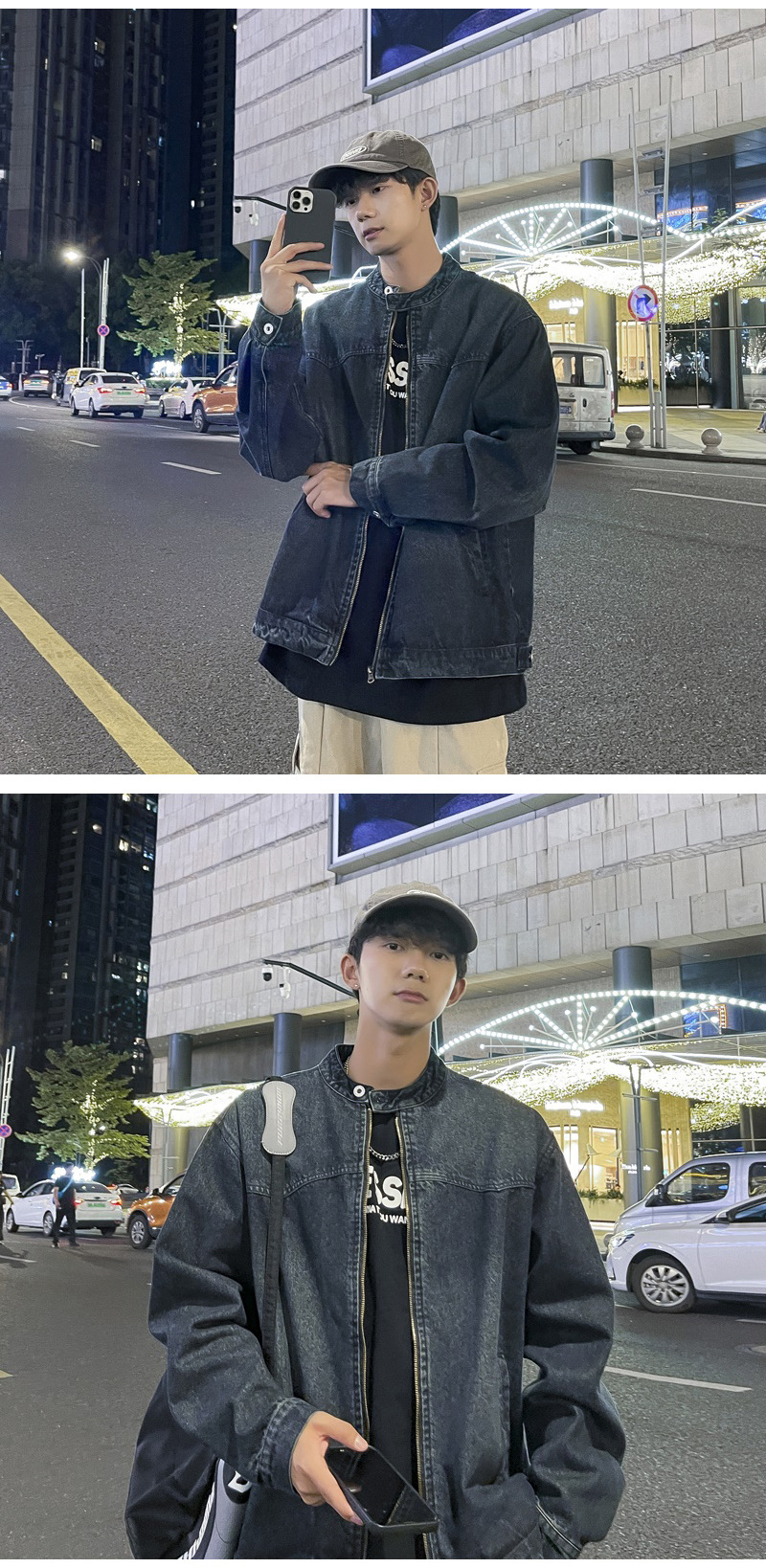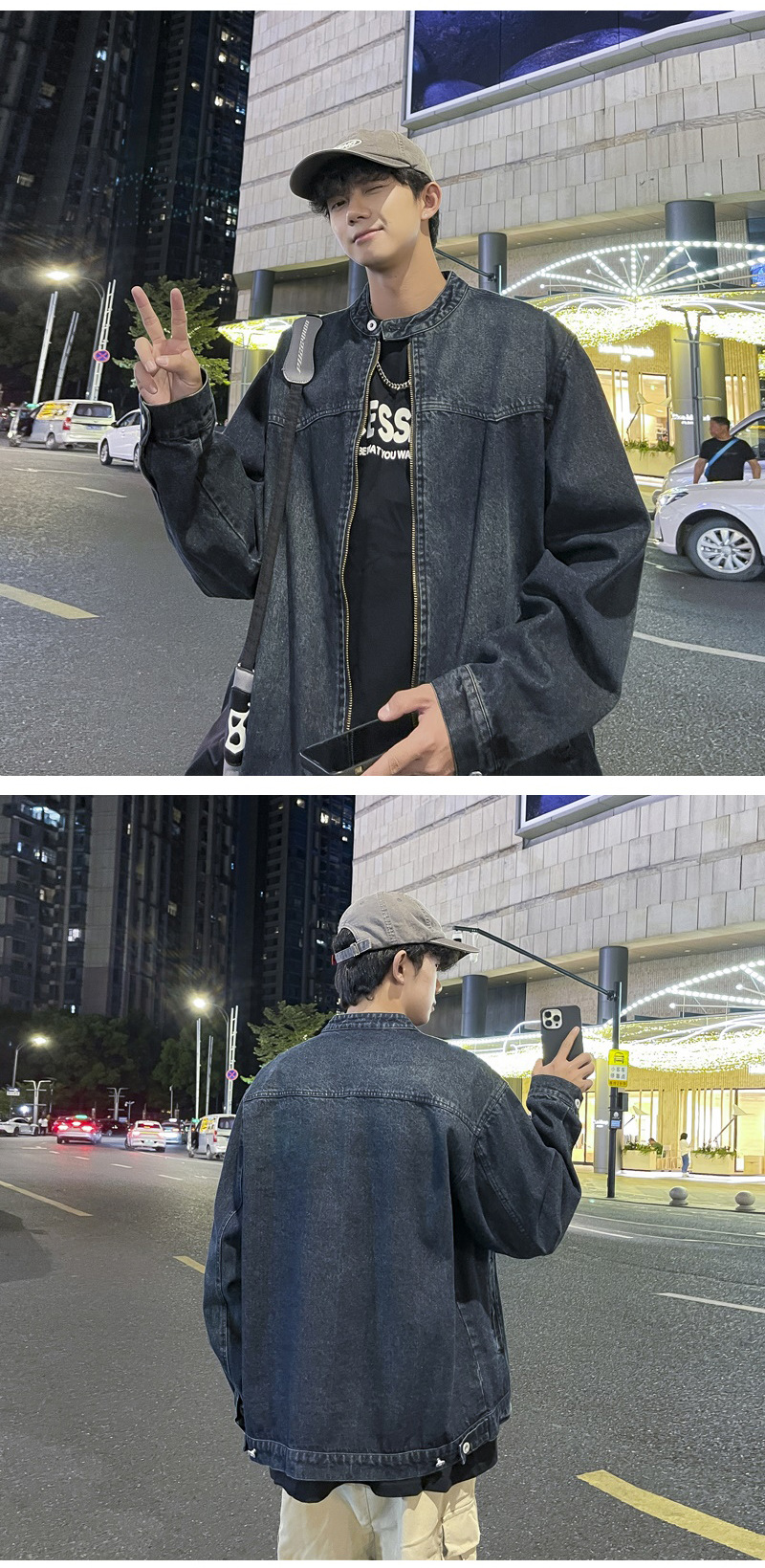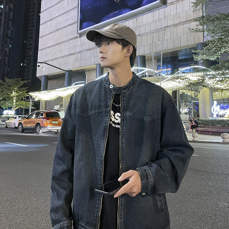 아메리칸 스타일 빈티지 데님 재킷 남자의 봄과 가을 유행 브랜드 통통 잘 씻은 오래된 수직 칼라 툴링 재킷