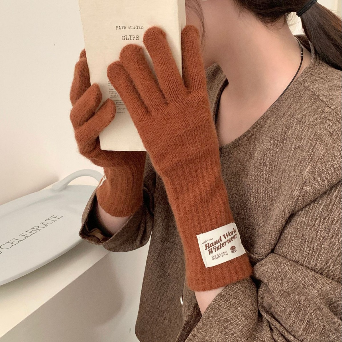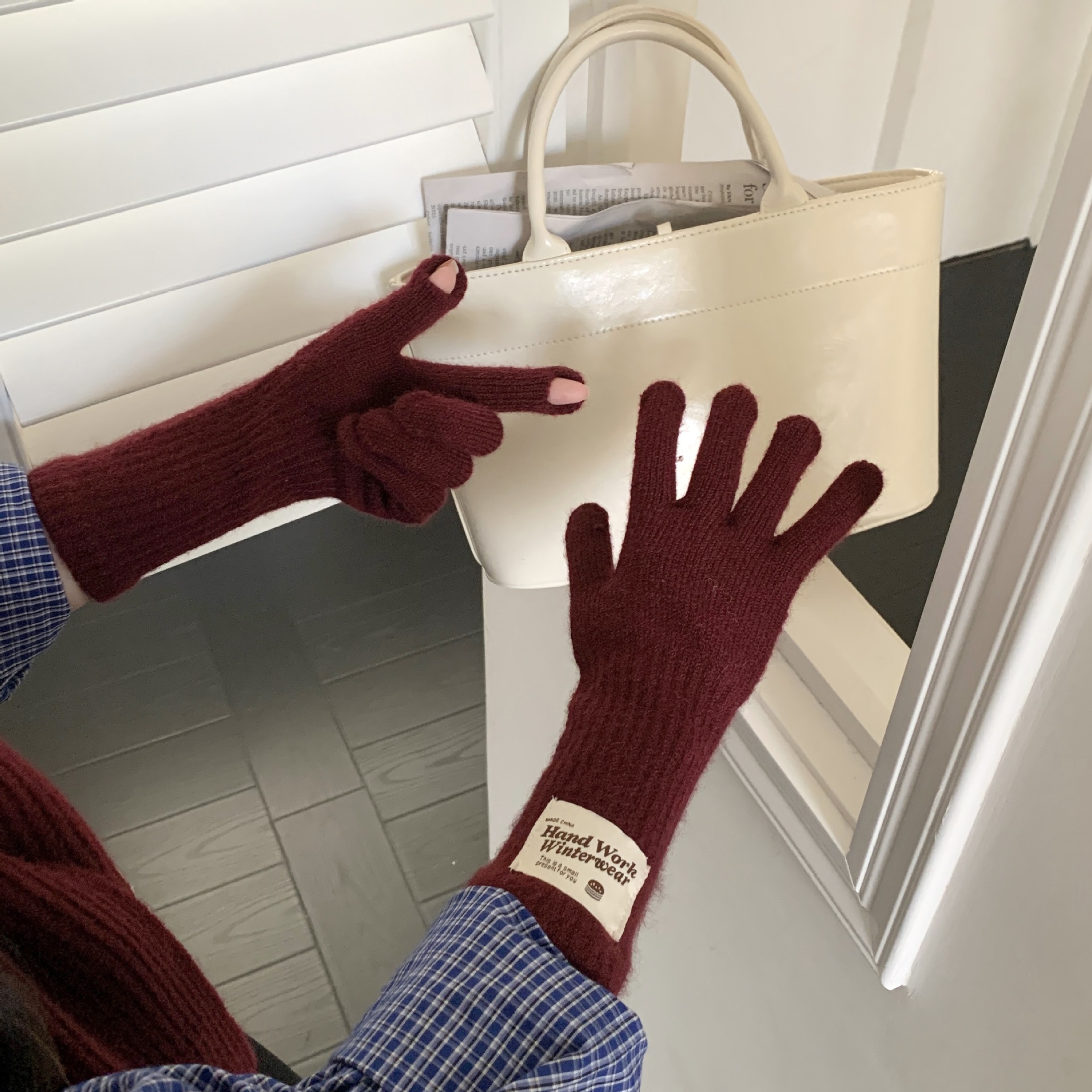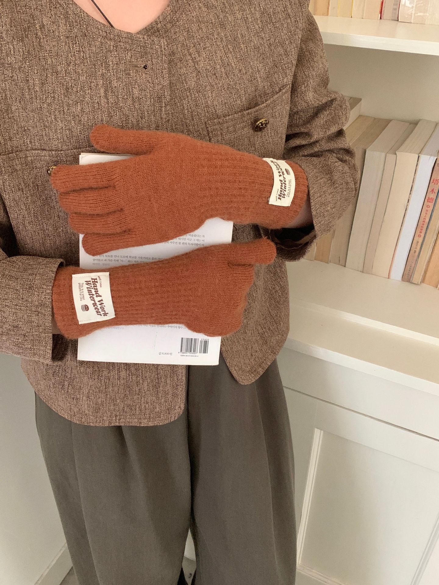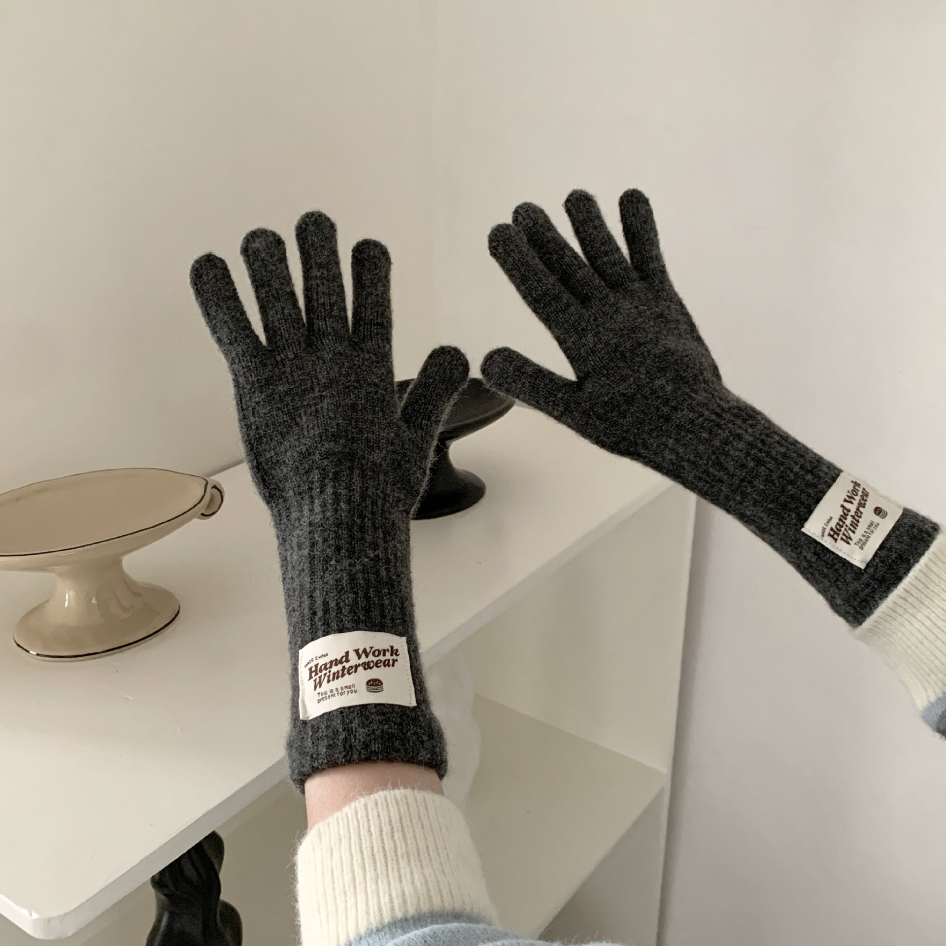 겨울 한국 여성 장갑 단색 따뜻한 니트 긴 터치 스크린 핑거리스 방풍 다섯 손가락 사이클링 유행 커플 다목적스토어 가기