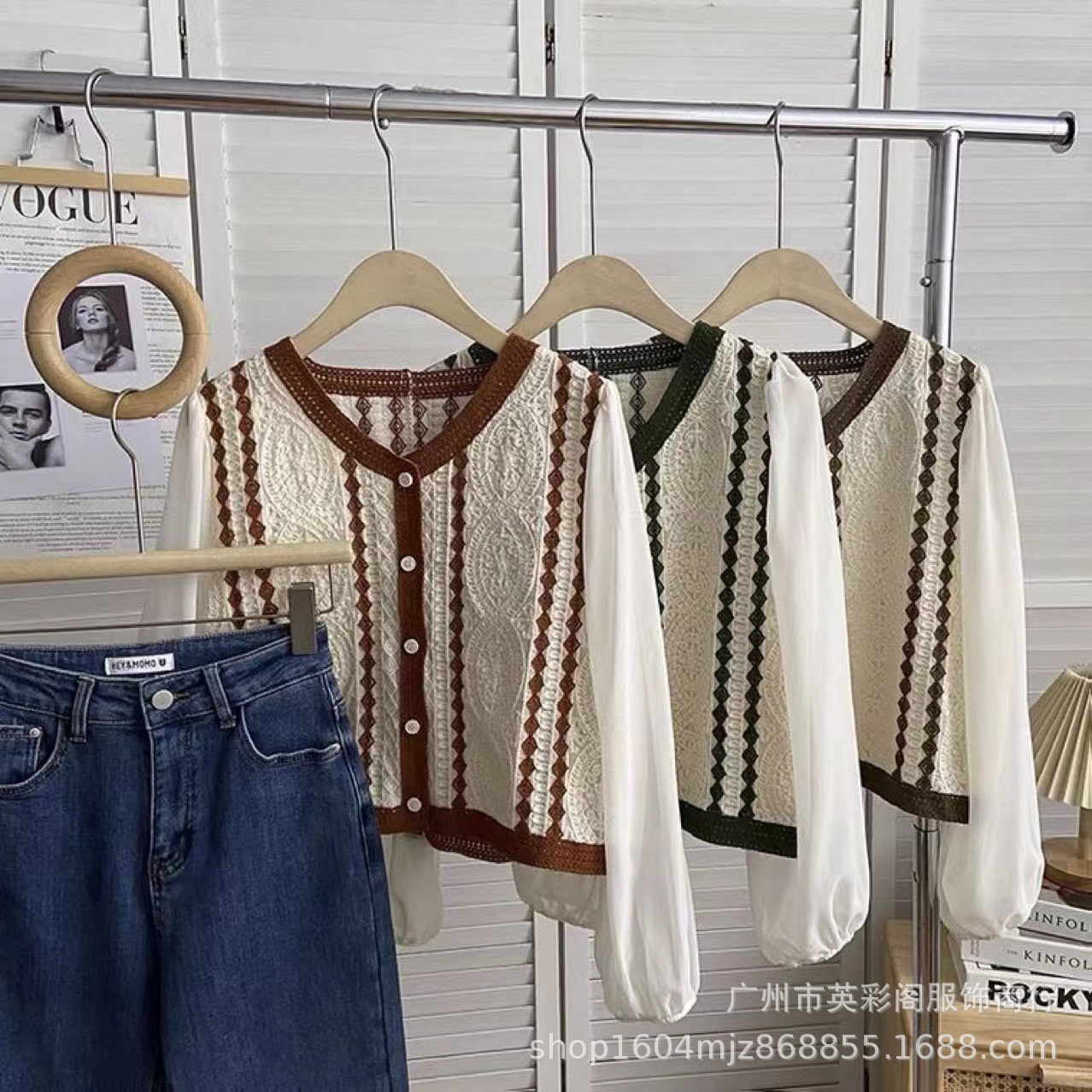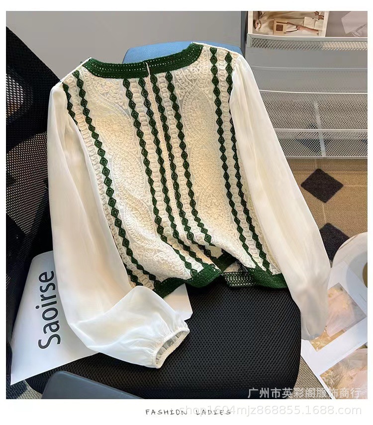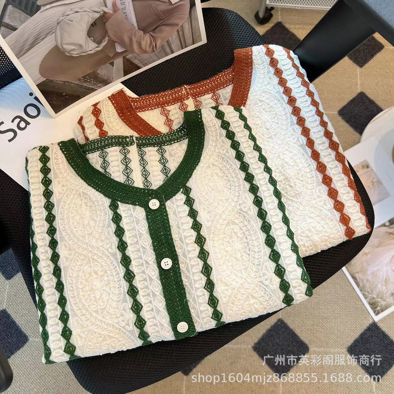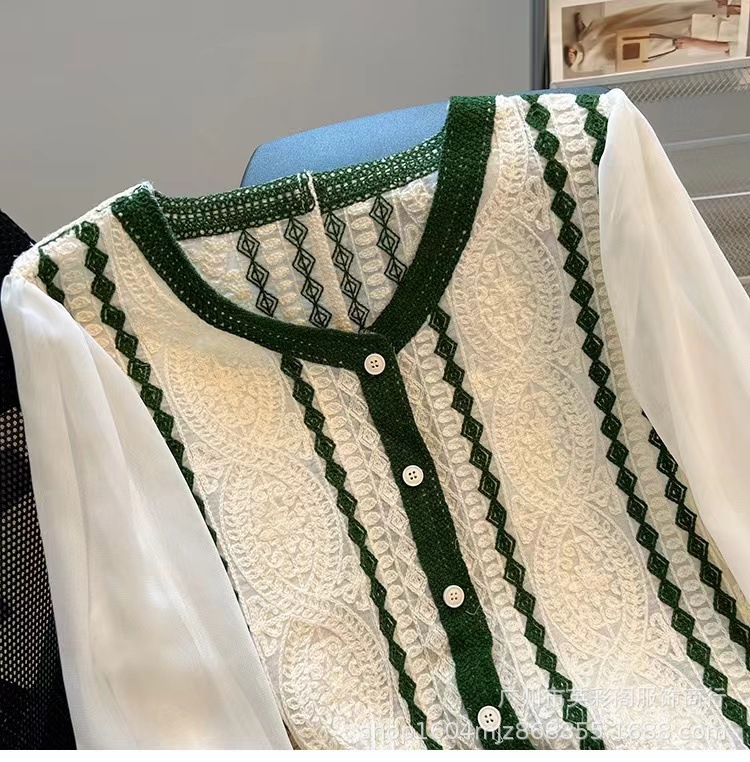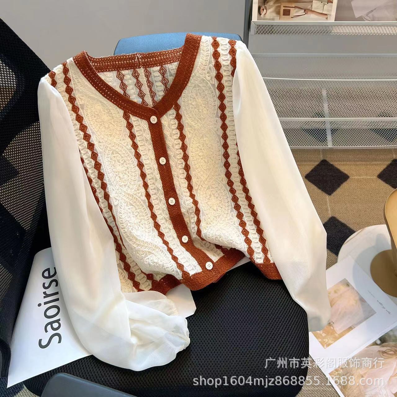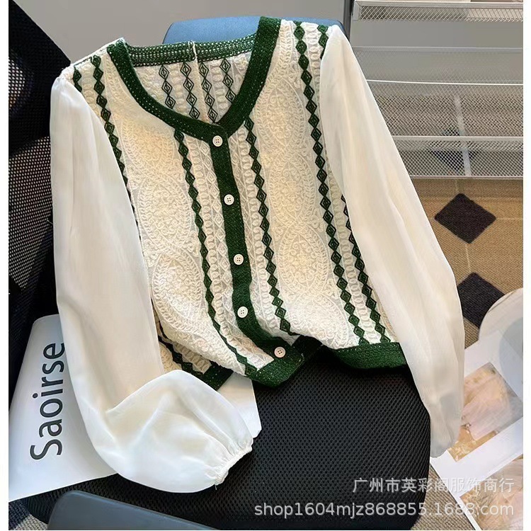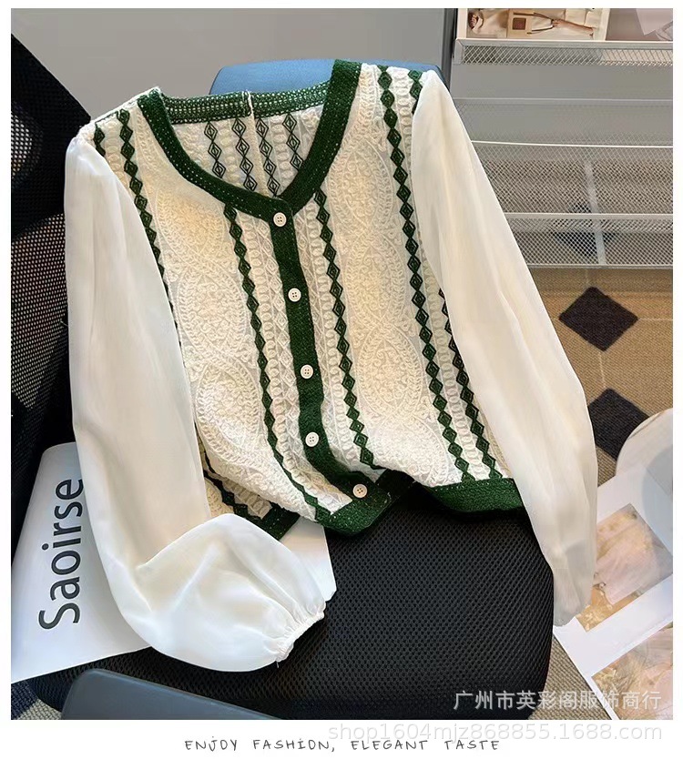 프랑스 대비 V 넥 자카드 니트 카디건 짧은 긴팔 쉬폰 셔츠 작은 여성을위한 얇은 이른 봄 코트스토어 가기