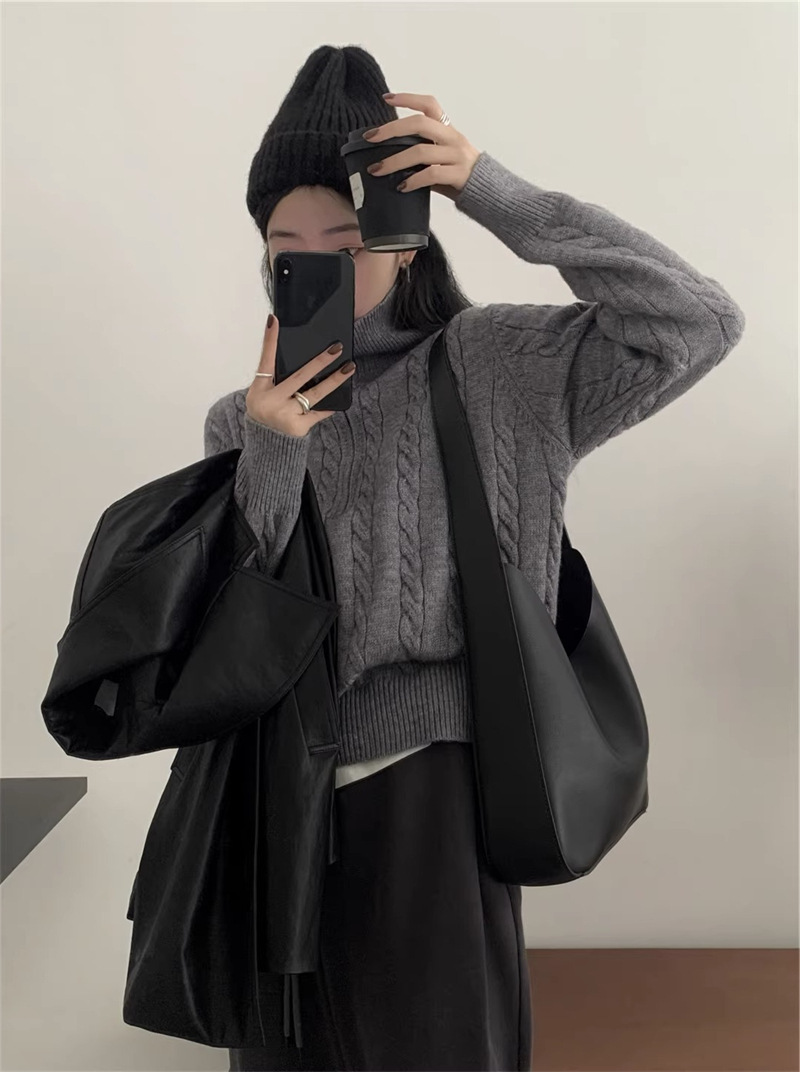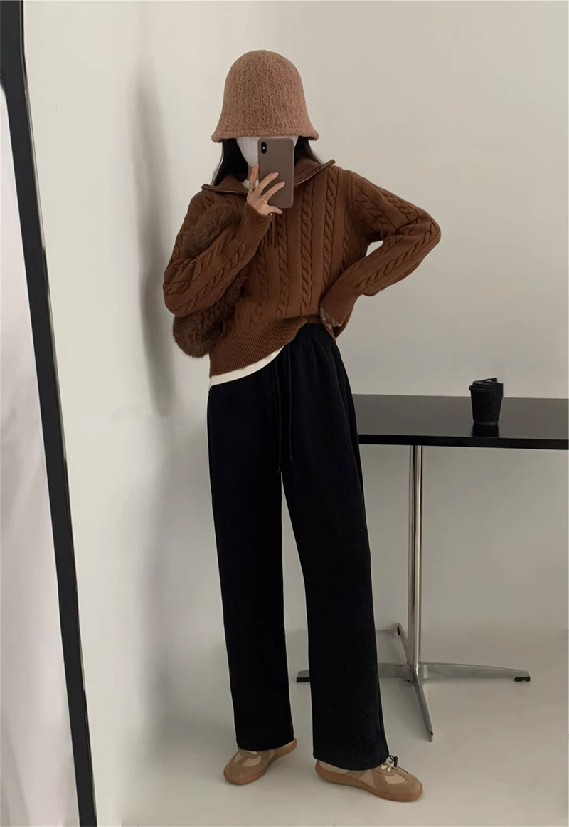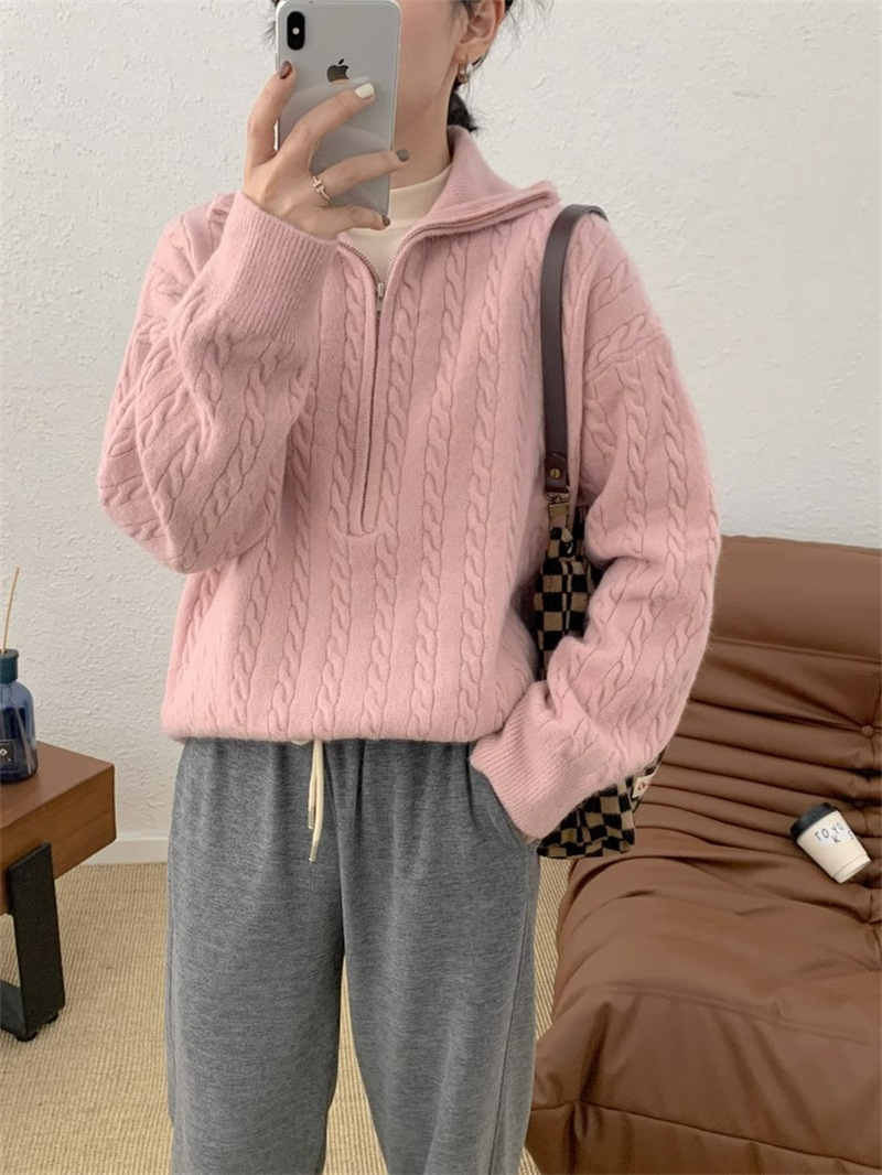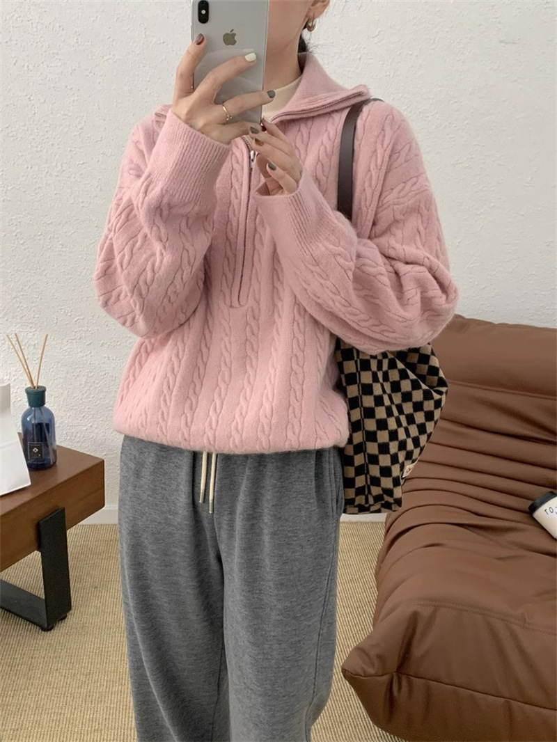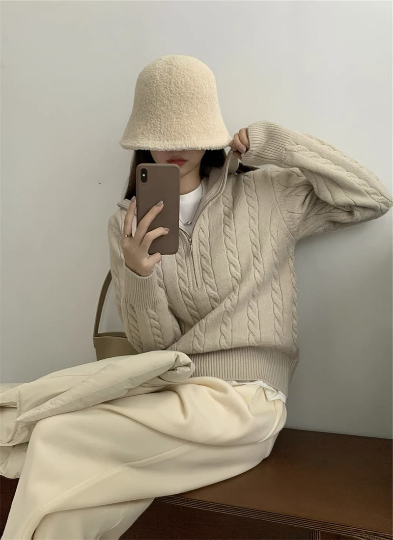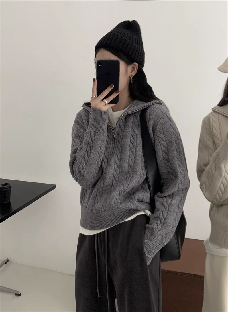 한국 스타일 옷깃 니트 풀오버 2024 가을 겨울 새로운 빈티지 올 매치 트위스트 하이 칼라 지퍼 솔리드 컬러 스웨터