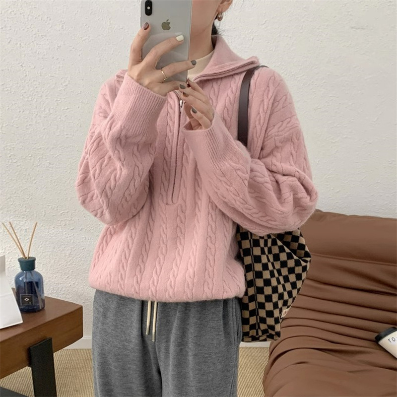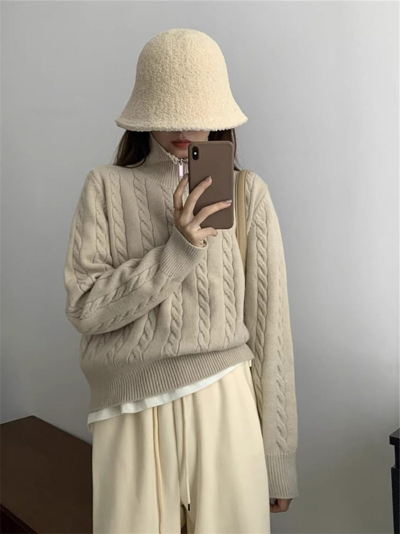 한국 스타일 옷깃 니트 풀오버 2024 가을 겨울 새로운 빈티지 올 매치 트위스트 하이 칼라 지퍼 솔리드 컬러 스웨터스토어 가기