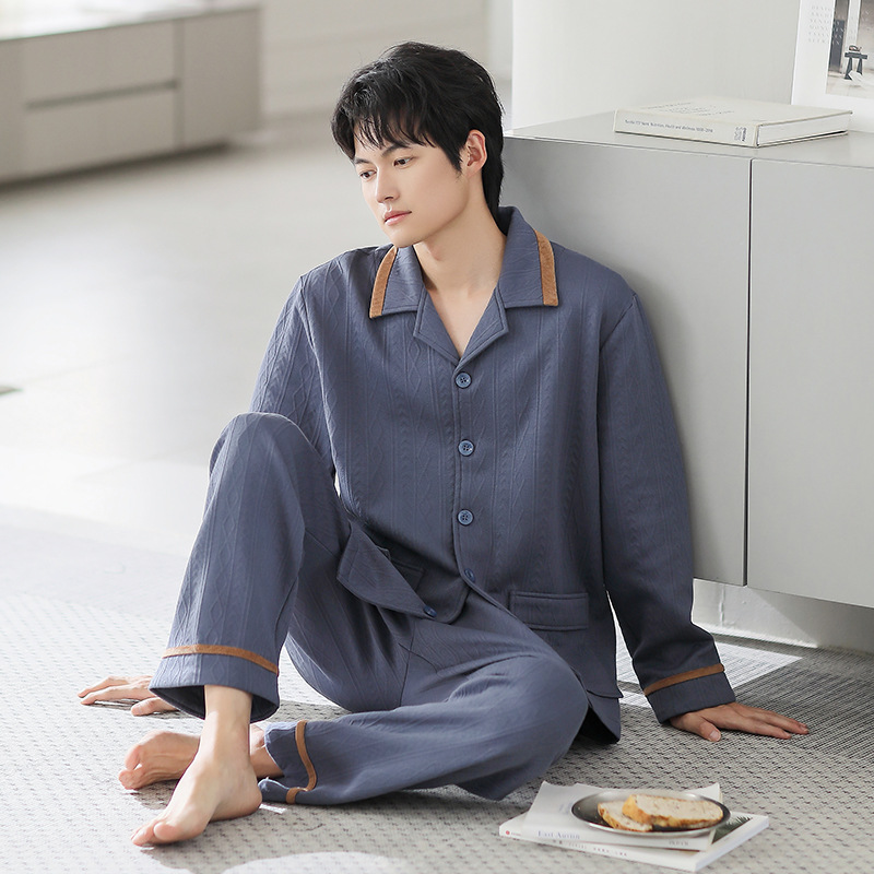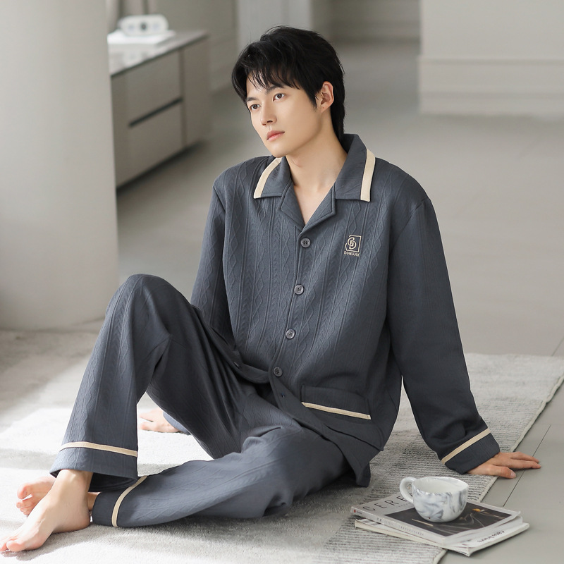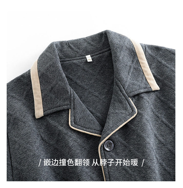 [에어코튼] 가을과 겨울 옷깃 남성용 파자마 코튼 인터레이어 두껍게 따뜻한 느슨한 플러스 사이즈 홈 의류 세트