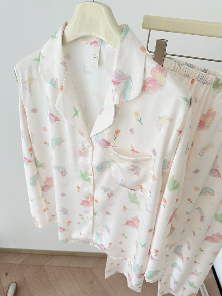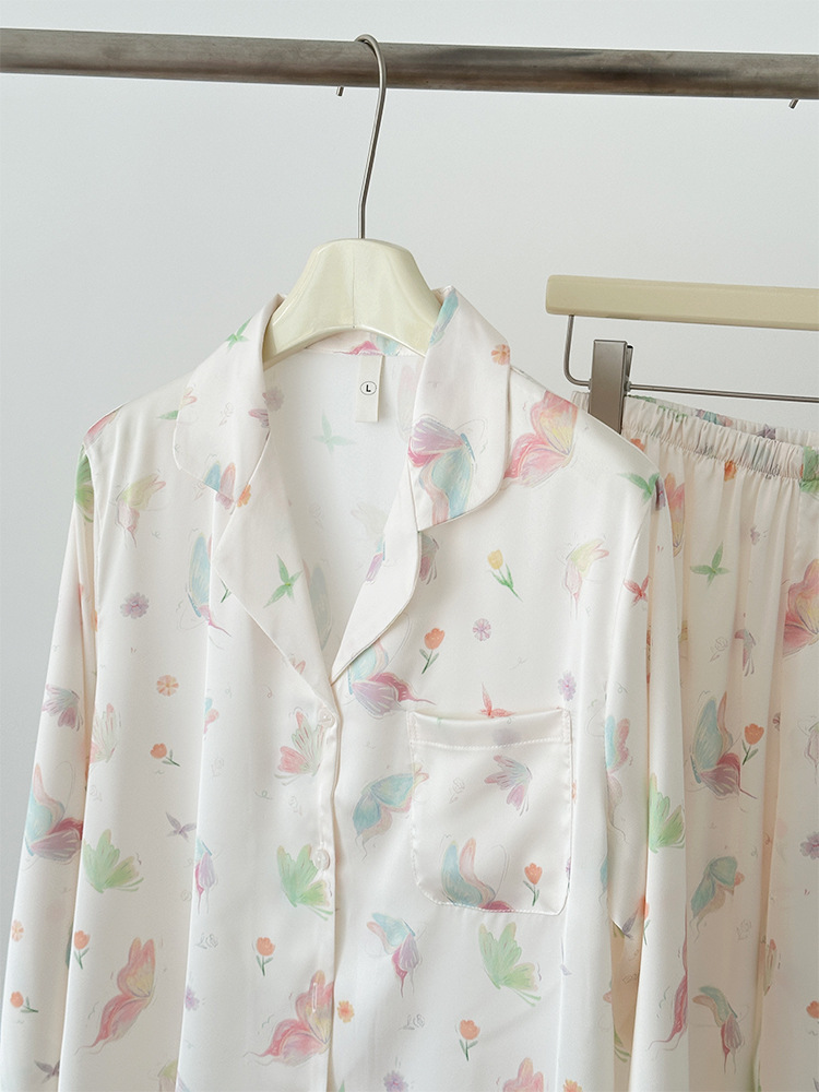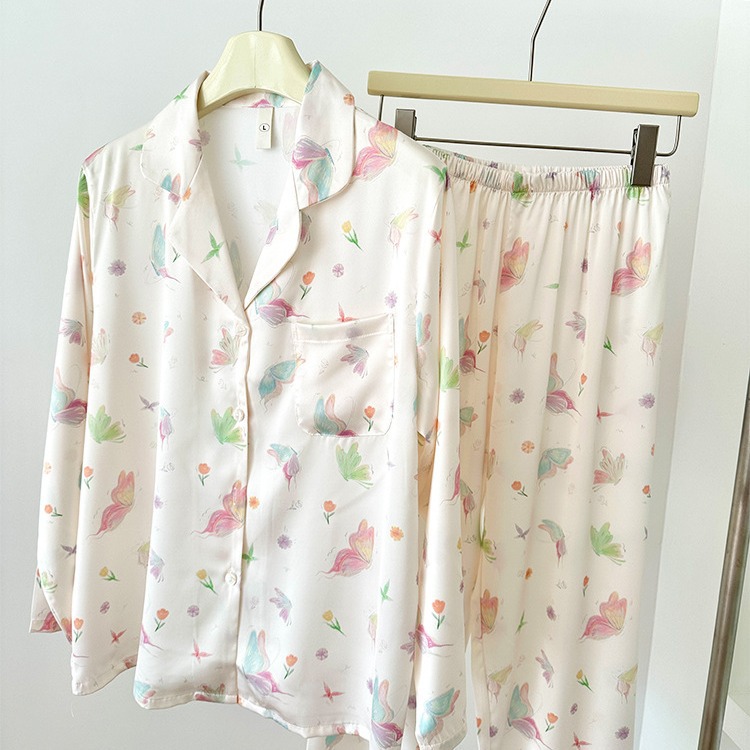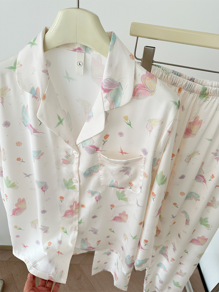 2024 소녀의 가을 아이스 실크 파자마 여성용 긴팔 바지 나비 그린 헤일로 염색 여름 홈 의류 세트 새로운스토어 가기