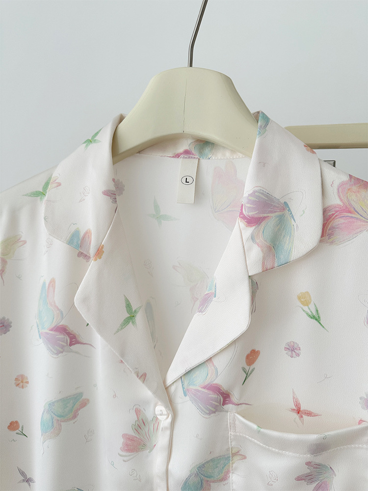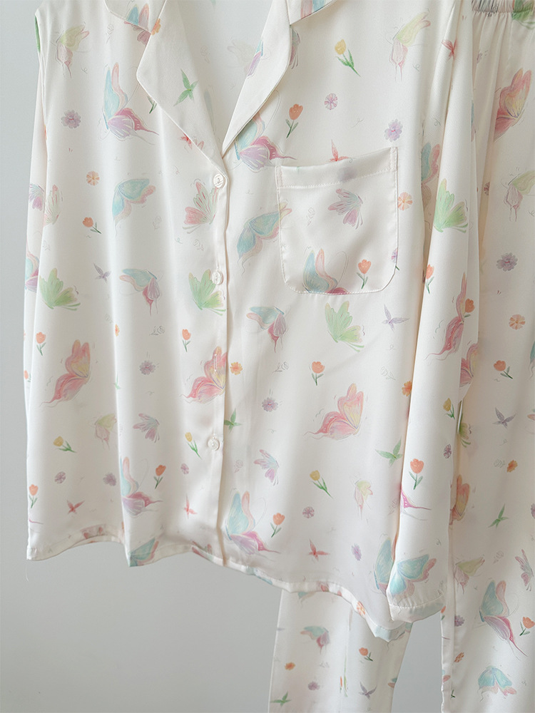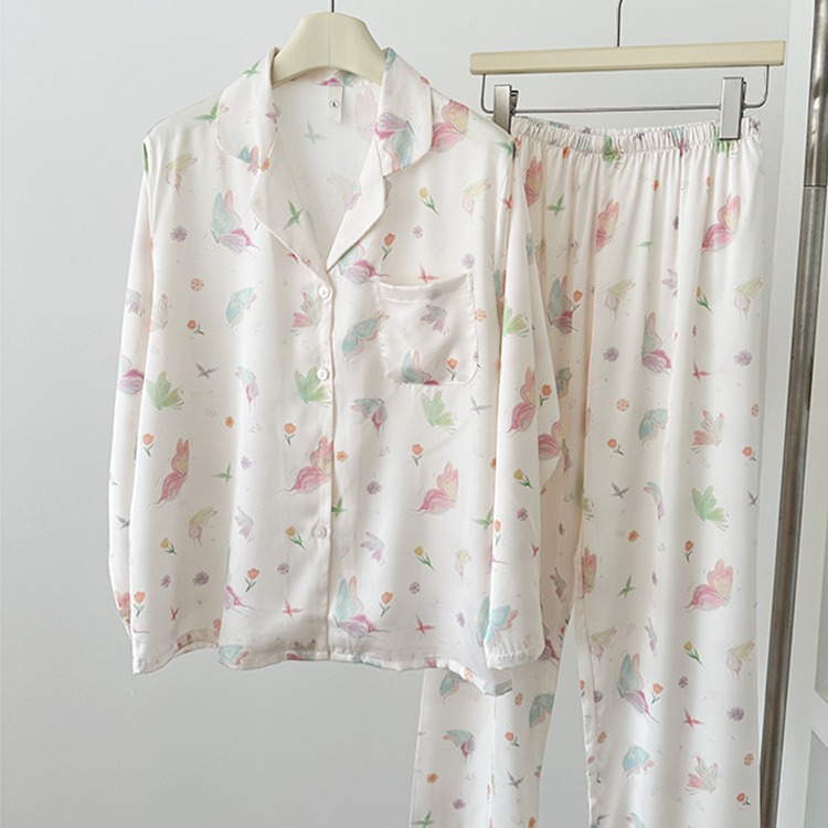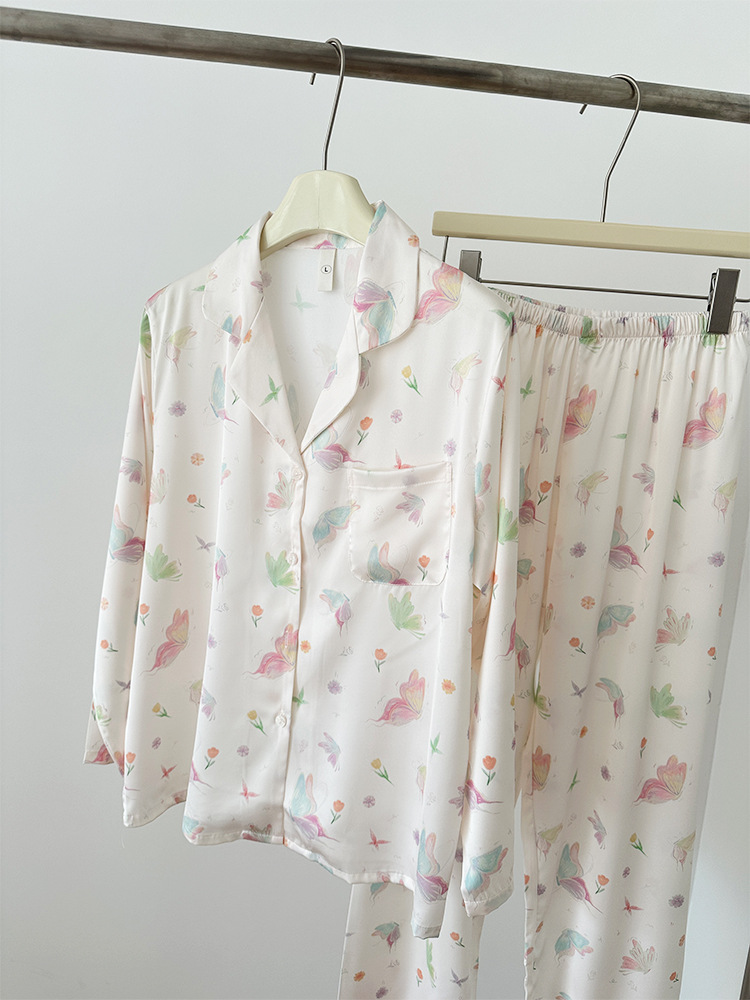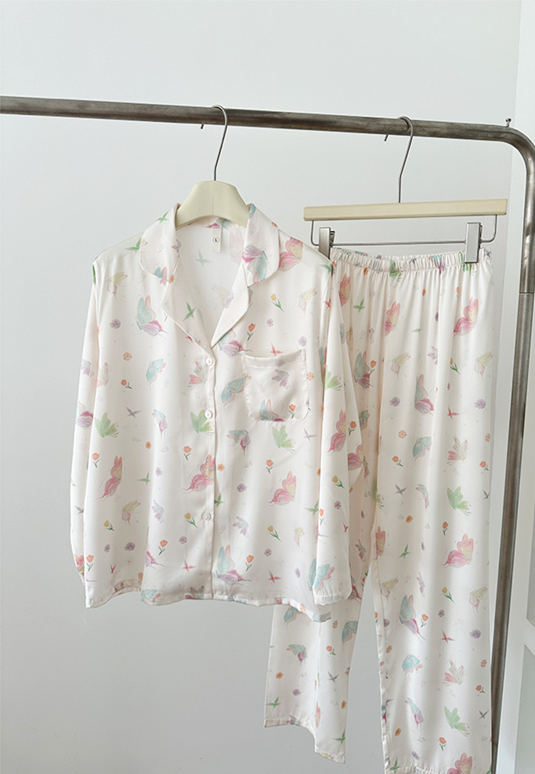 2024 소녀의 가을 아이스 실크 파자마 여성용 긴팔 바지 나비 그린 헤일로 염색 여름 홈 의류 세트 새로운스토어 가기