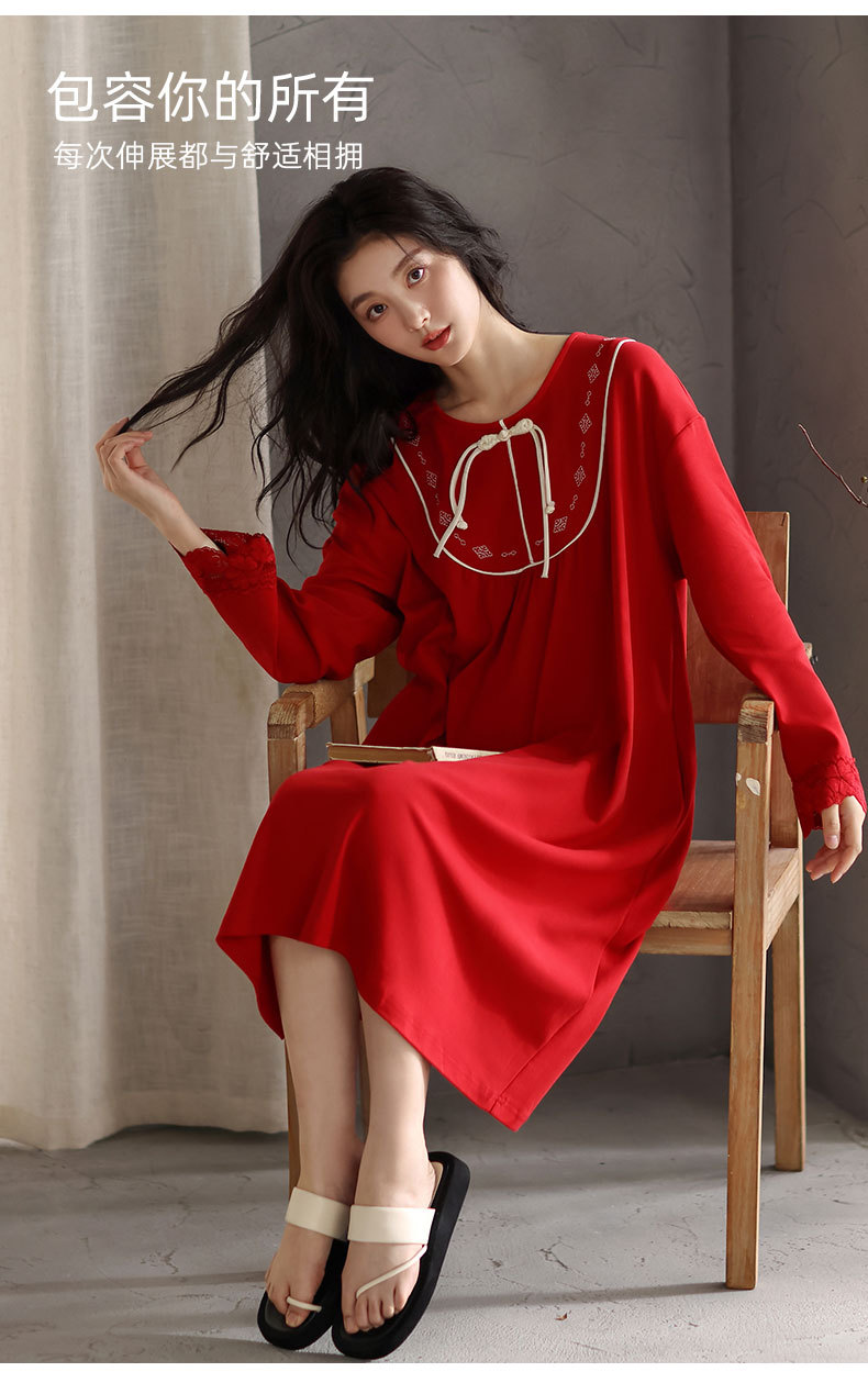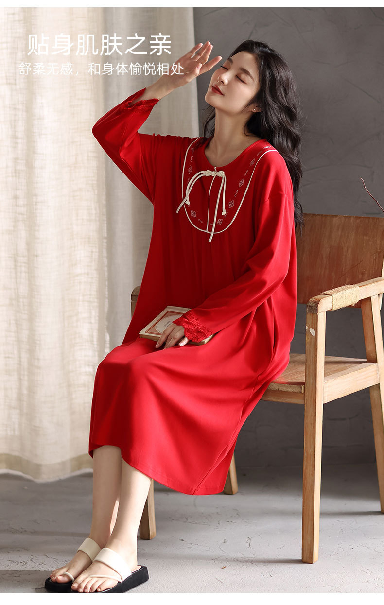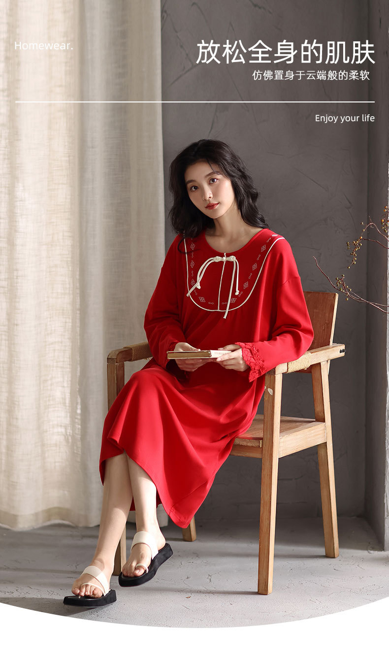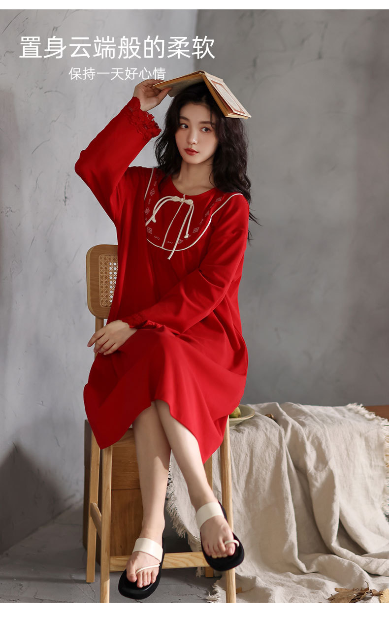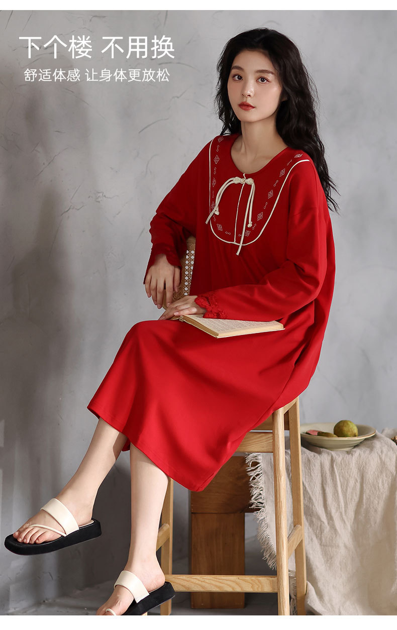 2024 새로운 큰 빨간 중간 길이 코튼 잠옷 중국 스타일 결혼식 신년 코튼 홈 의류스토어 가기