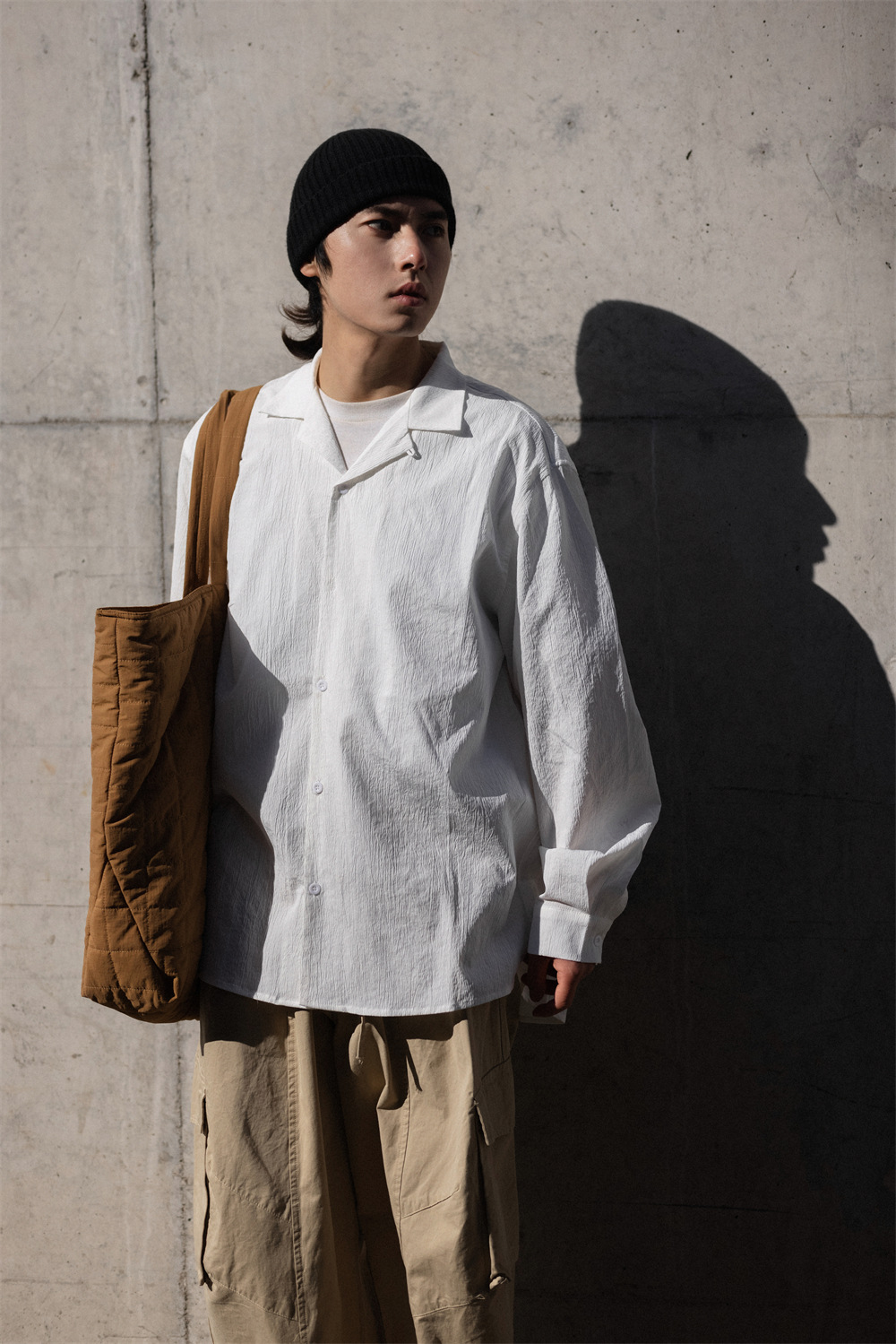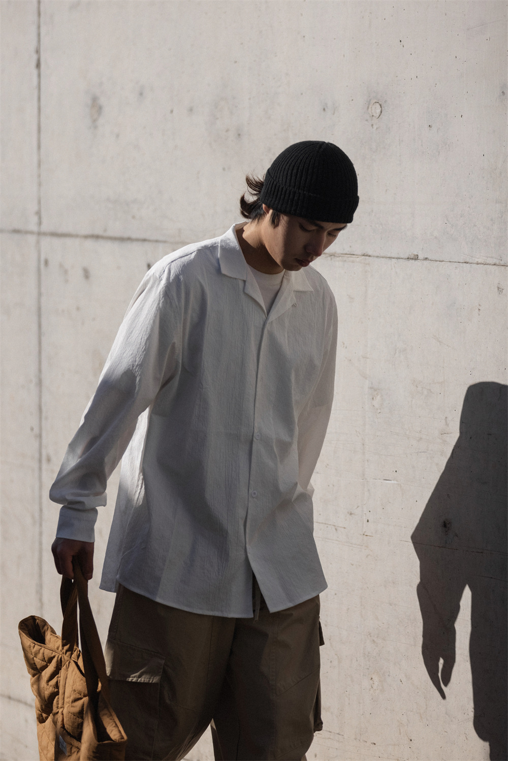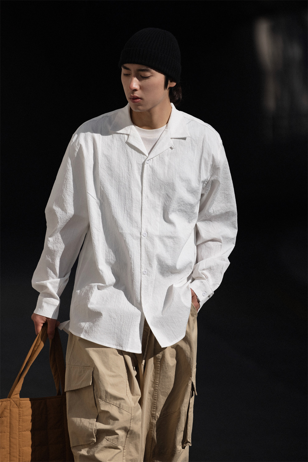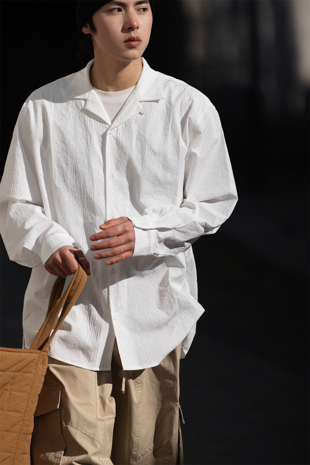 일본 복고풍 봄과 가을 도시 화이트 셔츠 남성 디자인 감각 느슨한 쿠바 옷깃 긴팔 셔츠 재킷스토어 가기