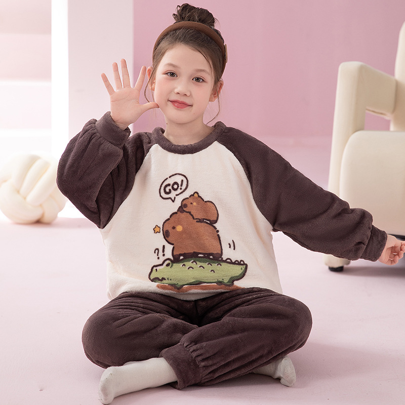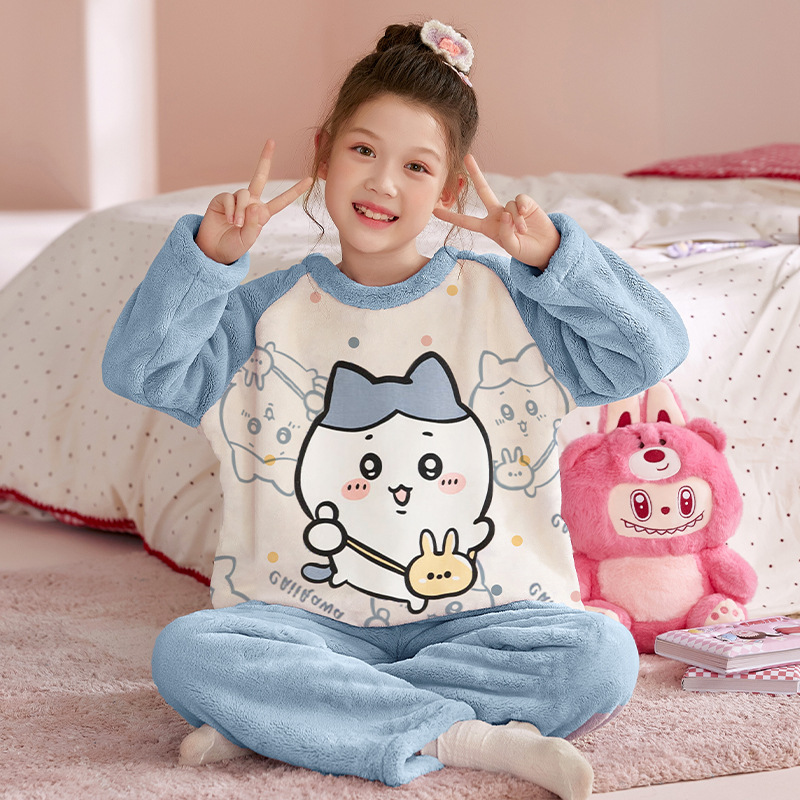 플란넬 어린이 잠옷 소녀 가을과 겨울 새로운 만화 아기 서양 스타일 귀여운 산호 양털 집 옷을 교체 할 수 있습니다