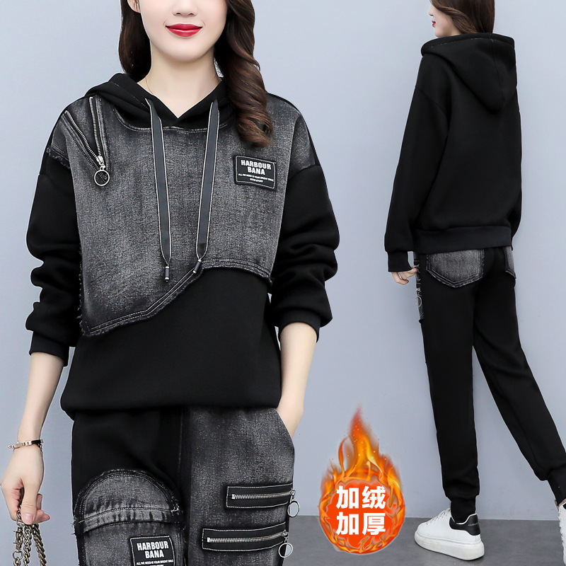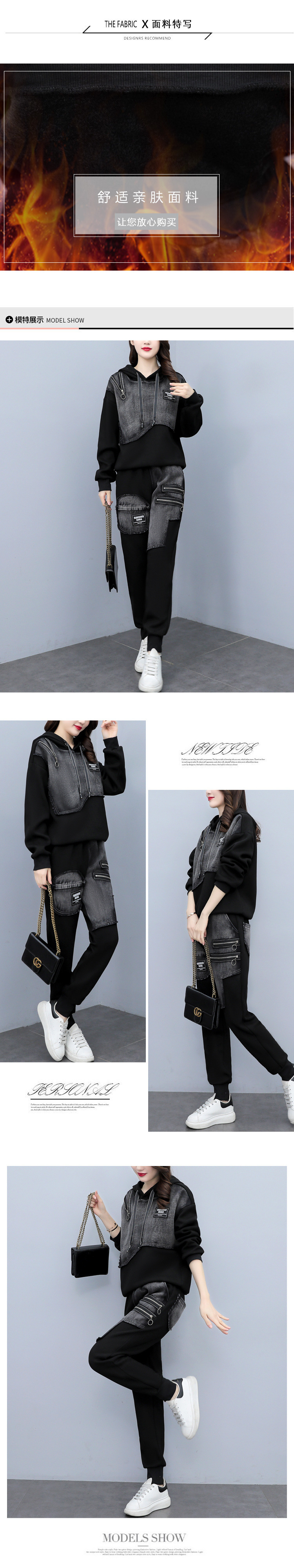 진짜 샷 봄 새로운 세트 여성 패션 스티칭 데님 인쇄 긴 소매 투피스 느슨한 플러스 사이즈 여성 의류스토어 가기