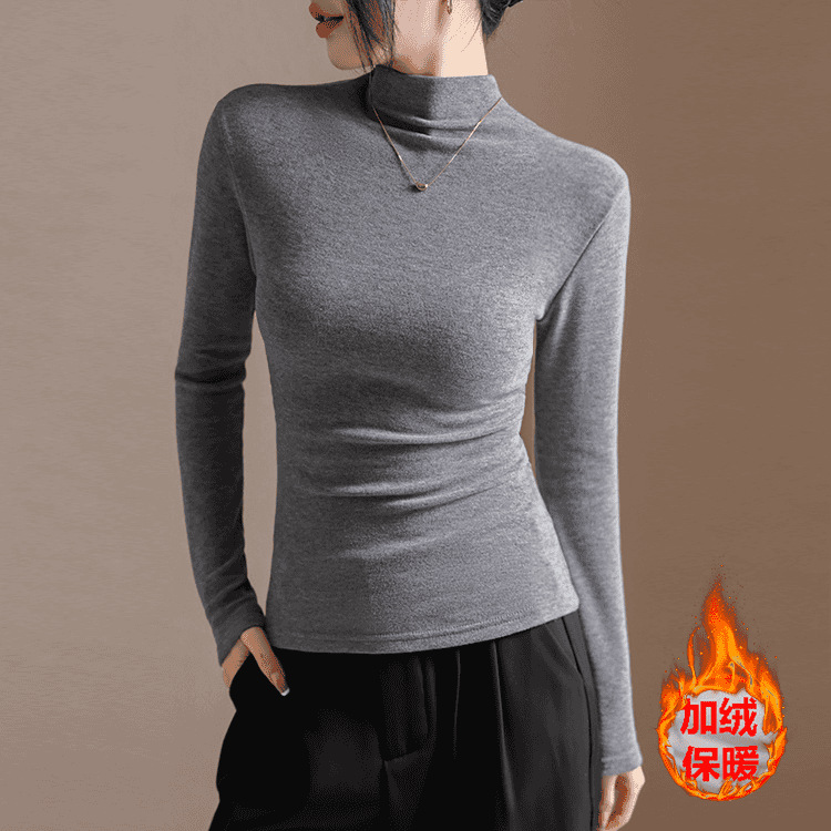 하프 하이 칼라 디자인 주름 서양식 긴팔 여성용 티셔츠 가을과 겨울 새로운 슬림 핏 벨벳 내베이스 셔츠 탑