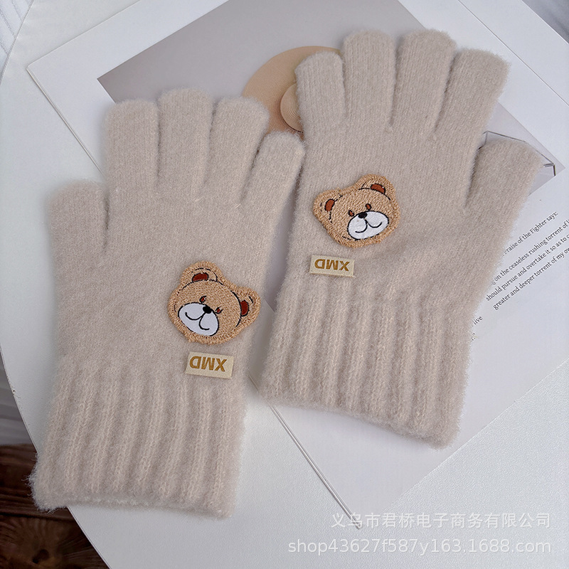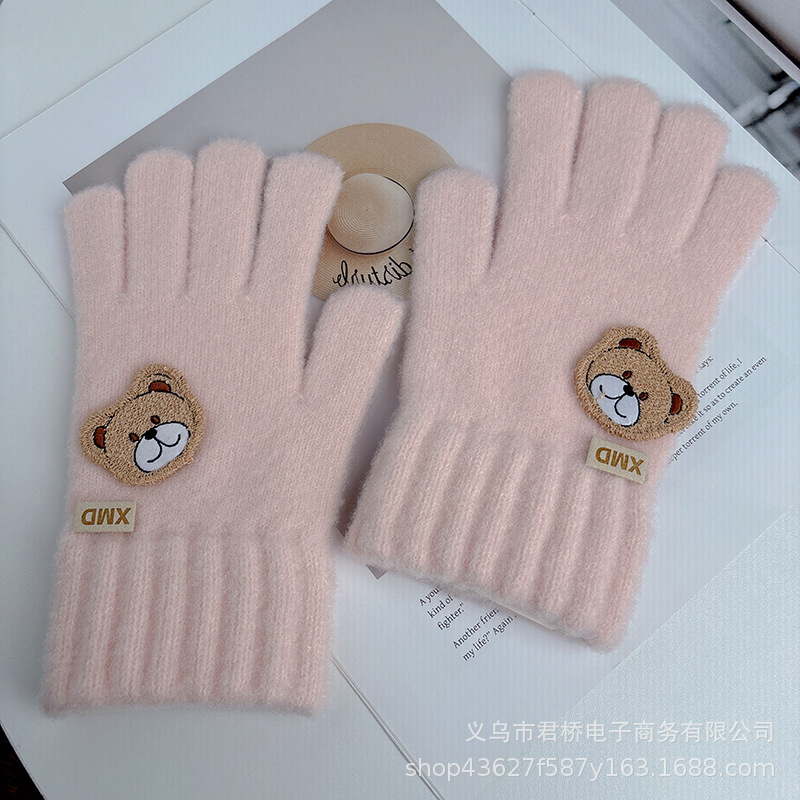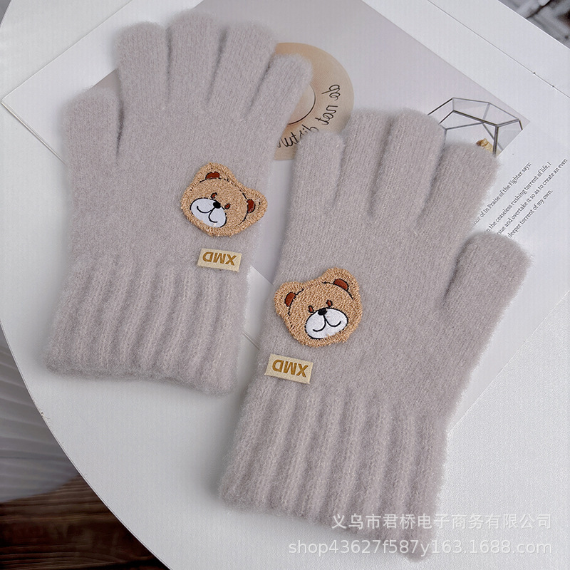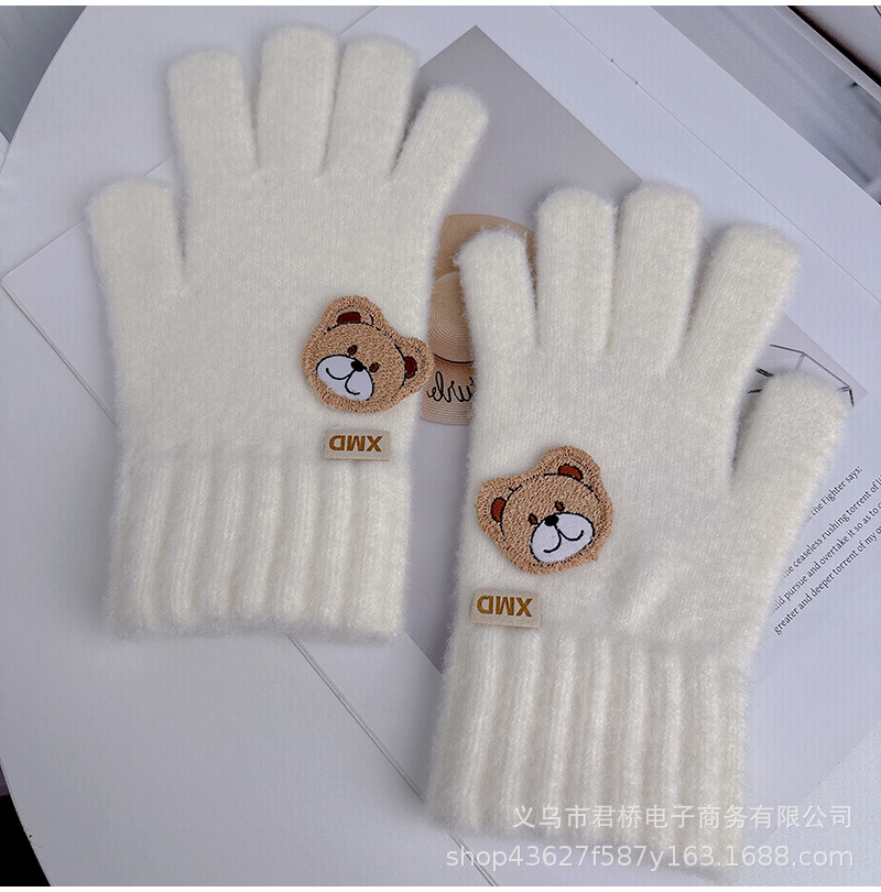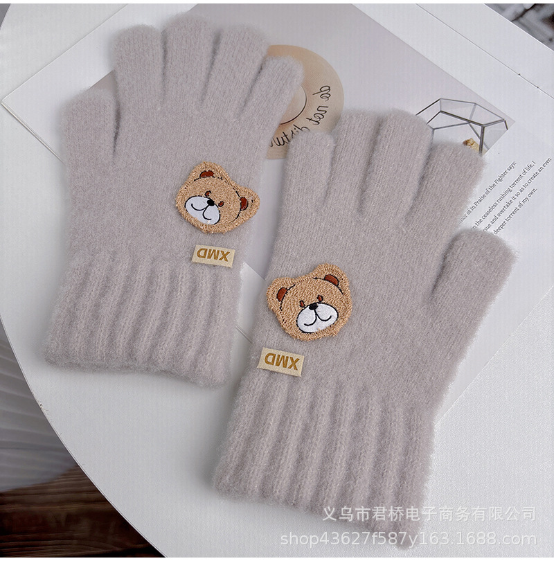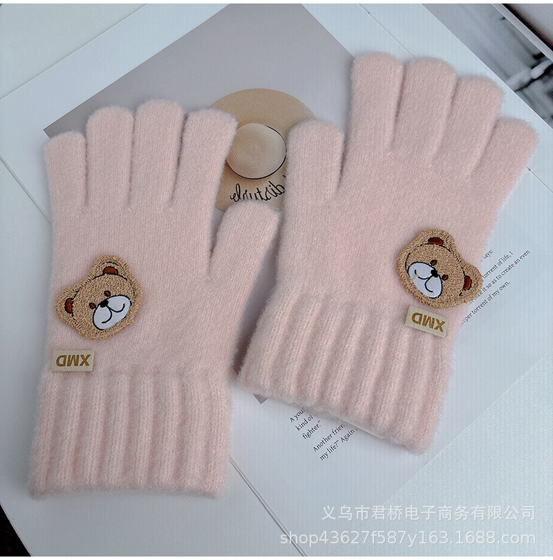 다섯 손가락 장갑 여성의 가을과 겨울 사이클링 따뜻한 니트 두꺼운 손가락 학생 귀여운 만화 곰 터치 스크린