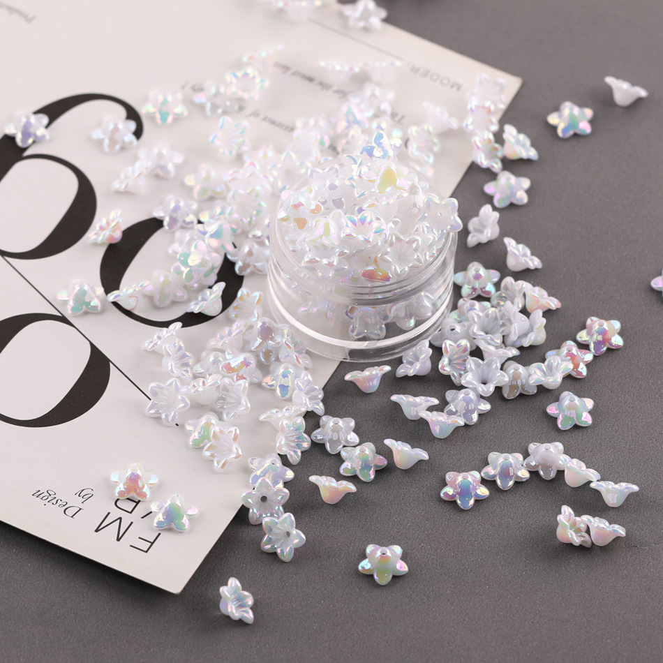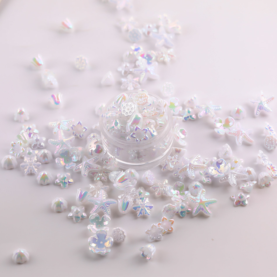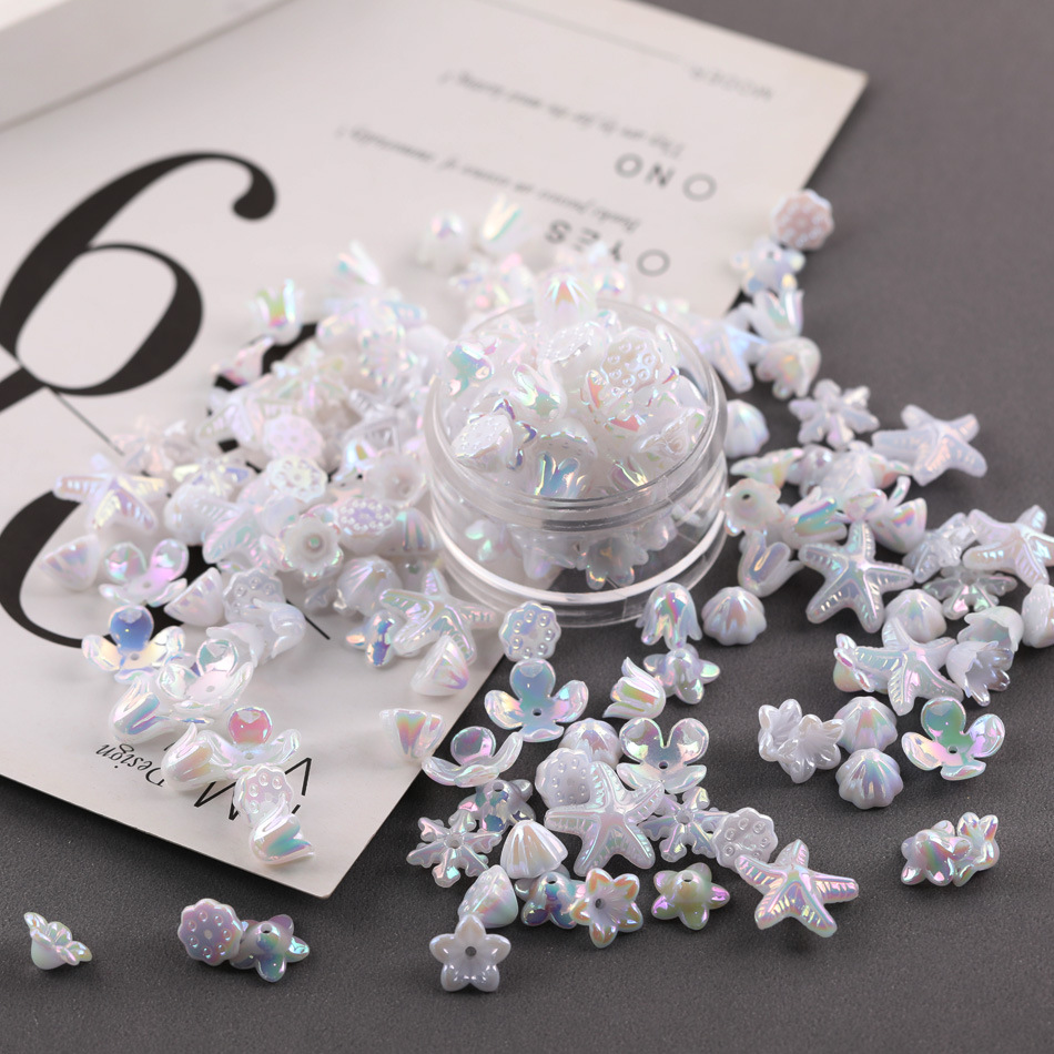 产品包装:50克/包 混款尺寸无法计算哦 雪花约160个 海星约60个 莲蓬约125个 喇叭花约235个 开口小花约240个 四叶花约180个