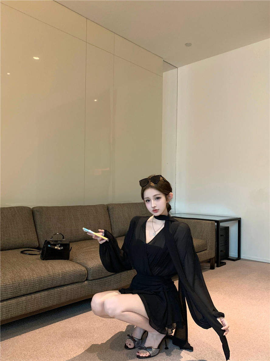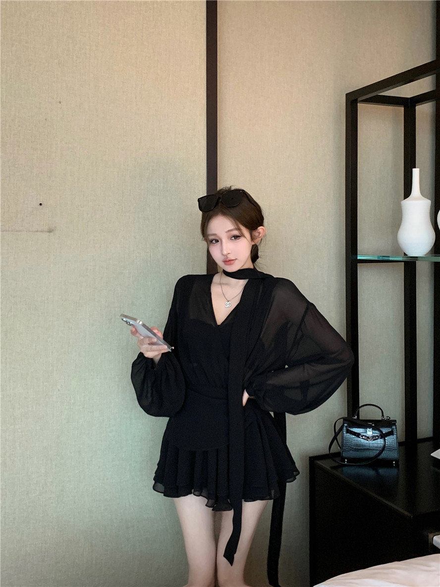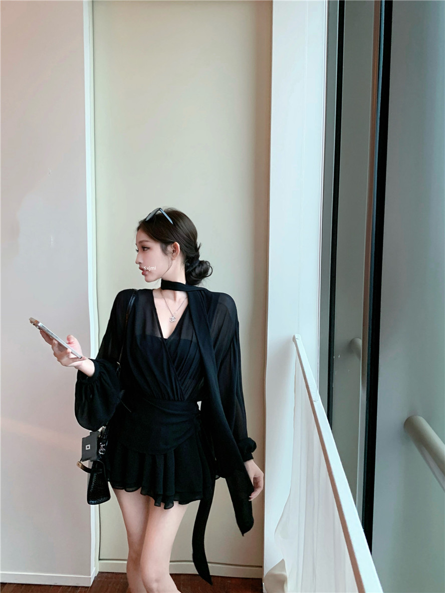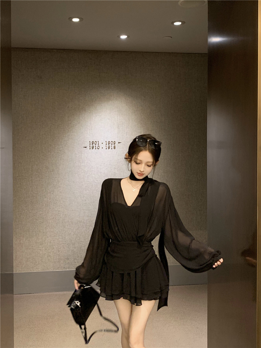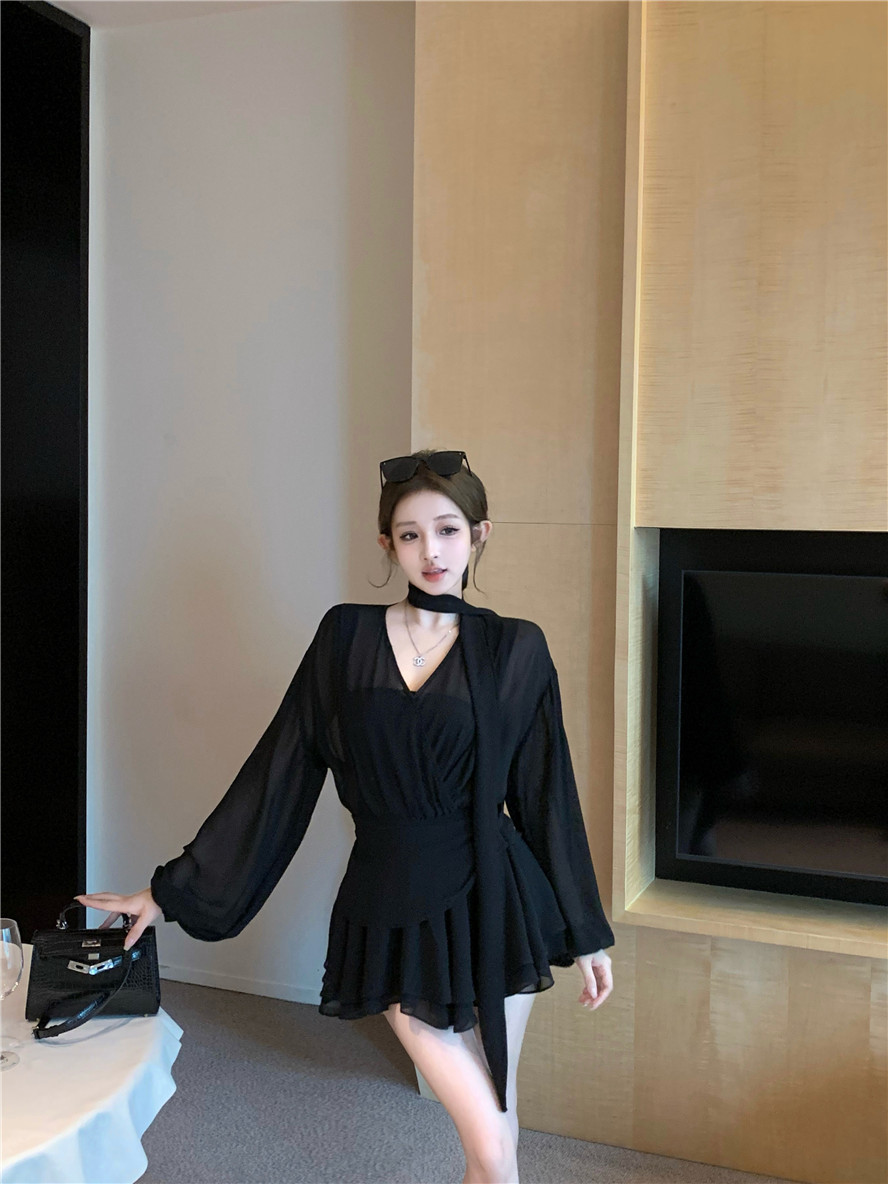 프랑스 우아한 사교계 스타일 교수형 목 V-목 긴 소매 원피스 여성의 이른 가을 새 스타일 메쉬 짧은 패션 하이 엔드 스커트