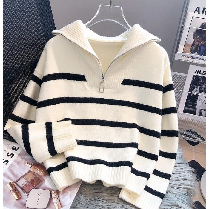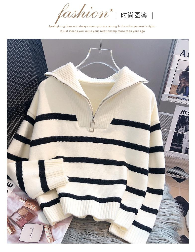 여자 스웨터 여자의 봄 옷 내부로 두껍게 2024 새로운 지퍼 스트라이프베이스 셔츠 짧은스토어 가기