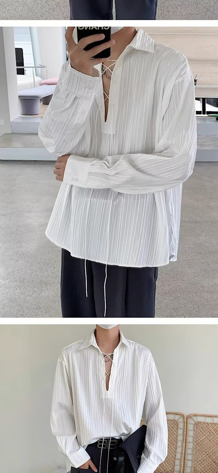 한국 틈새 금욕 스타일 화이트 주름 드로우 스트링 디자인 셔츠 남성용 캐주얼 루즈 올 매치 긴팔 셔츠