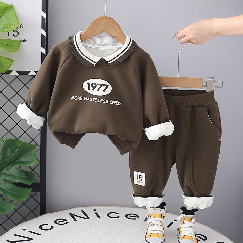 아동복 남성용 아기의 가을과 겨울복 세트 2024 년 새 겨울 어린이 원피스 벨벳 옷깃 스웨트 캐주얼 투피스 세트스토어 가기