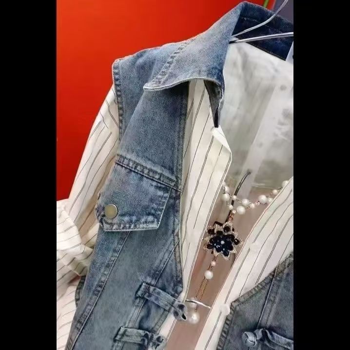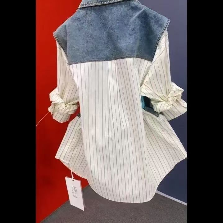 디자인감 있는 페이크 투피스 데님 셔츠 여성용 2026 한국판 초봄 캐주얼 스타일 다용도 배색 스트라이프 탑