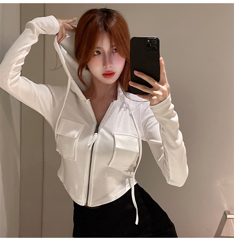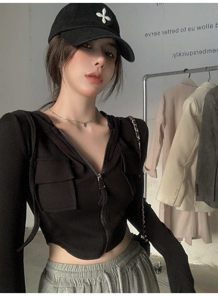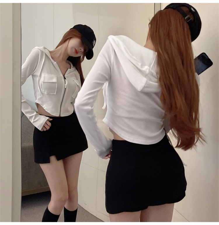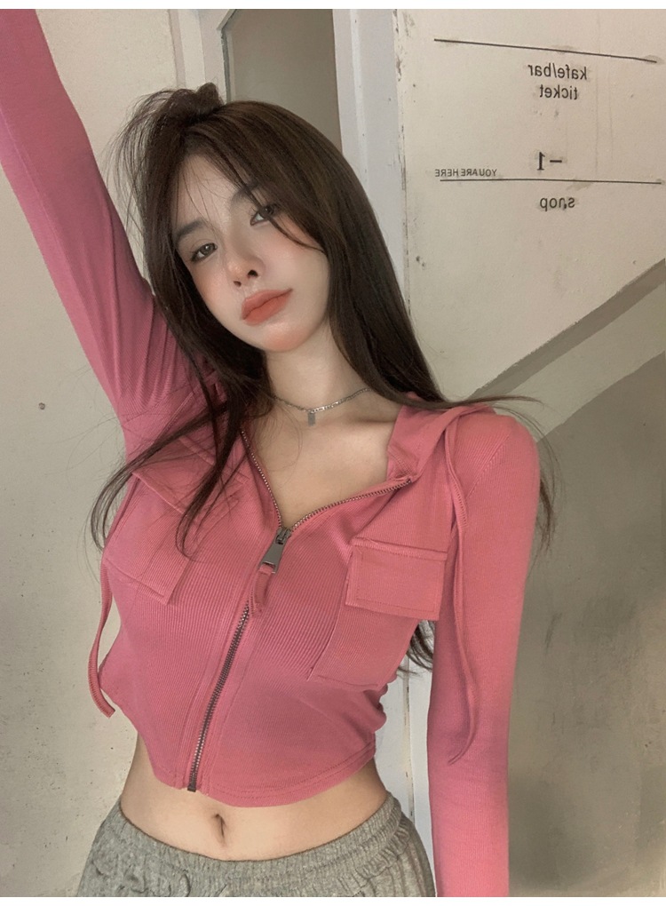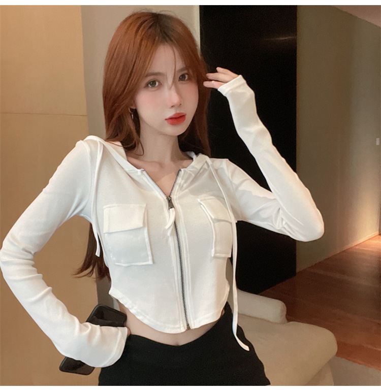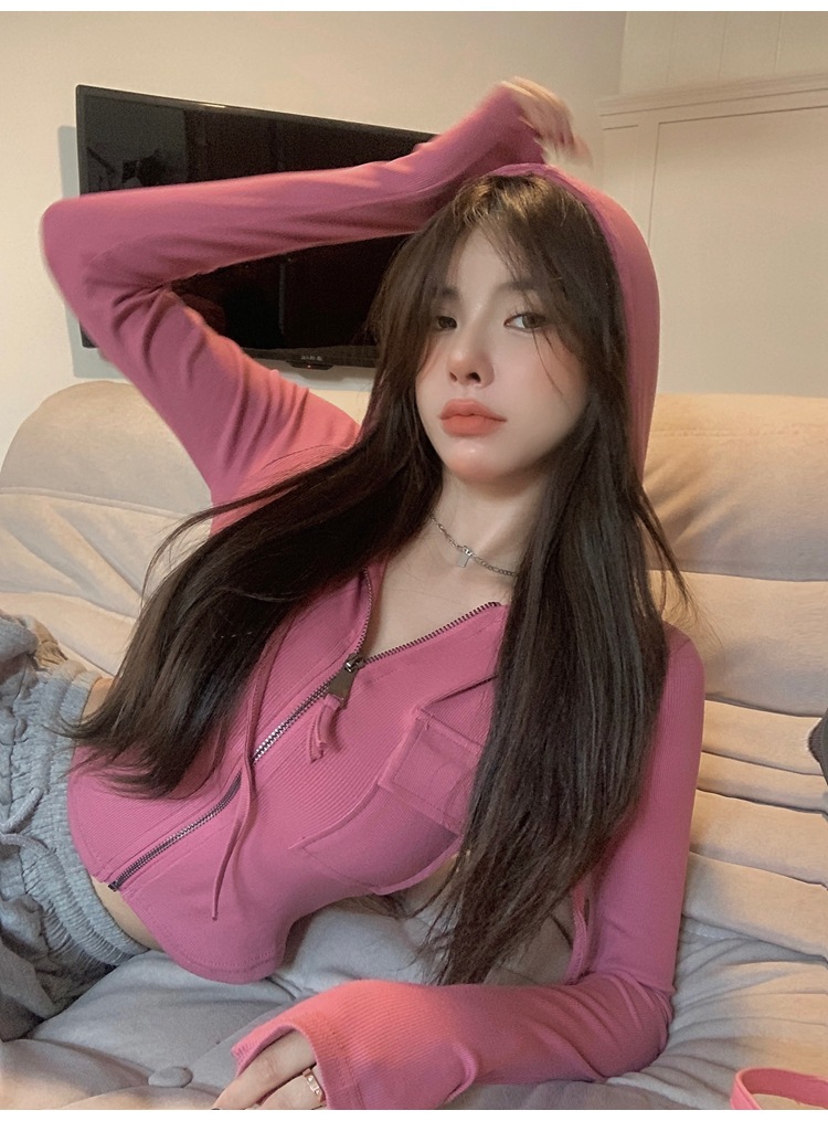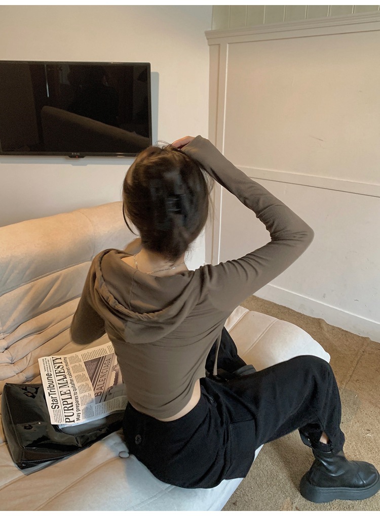 봄과 가을 후드 짧은 어본 디자인 센스 탑 여성용 달콤하고 뜨거운 높은 허리 슬리밍 긴팔 티셔츠 트렌디 카디건스토어 가기
