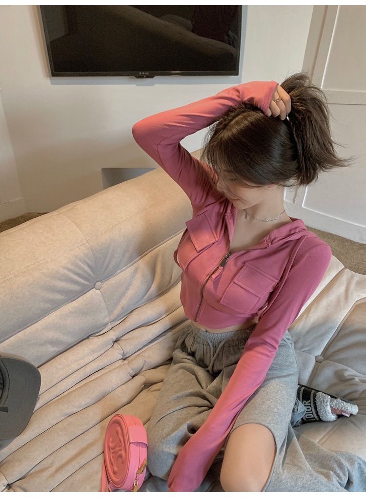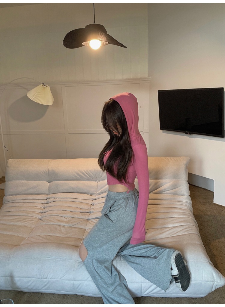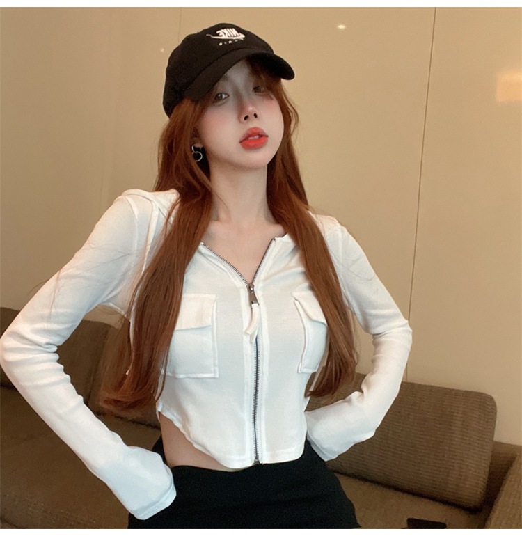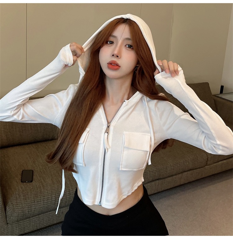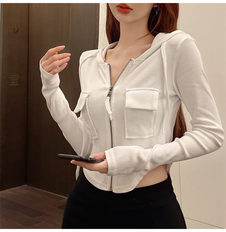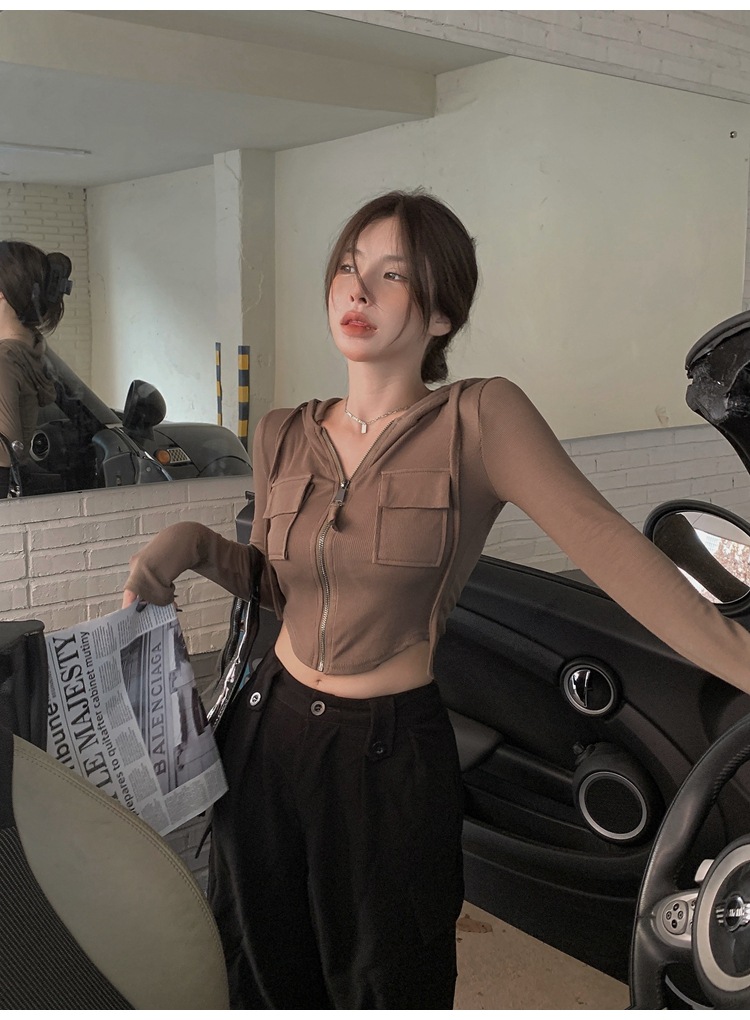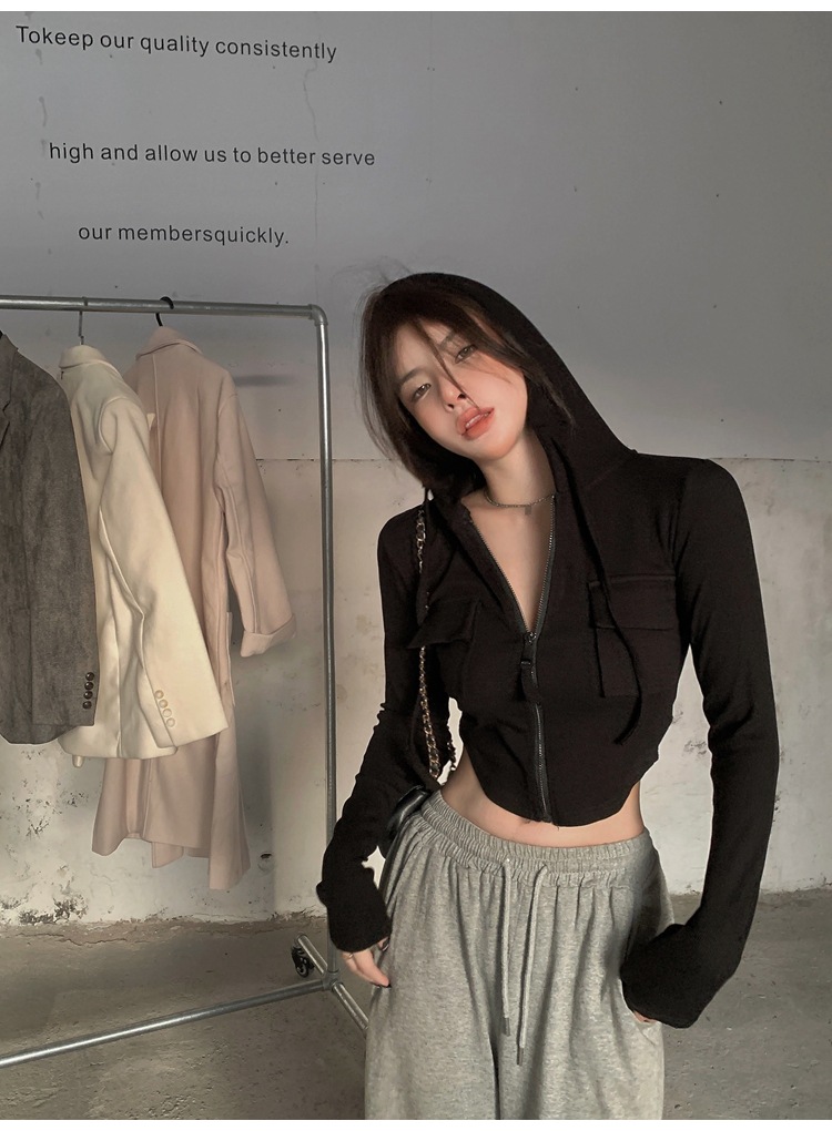 봄과 가을 후드 짧은 어본 디자인 센스 탑 여성용 달콤하고 뜨거운 높은 허리 슬리밍 긴팔 티셔츠 트렌디 카디건스토어 가기