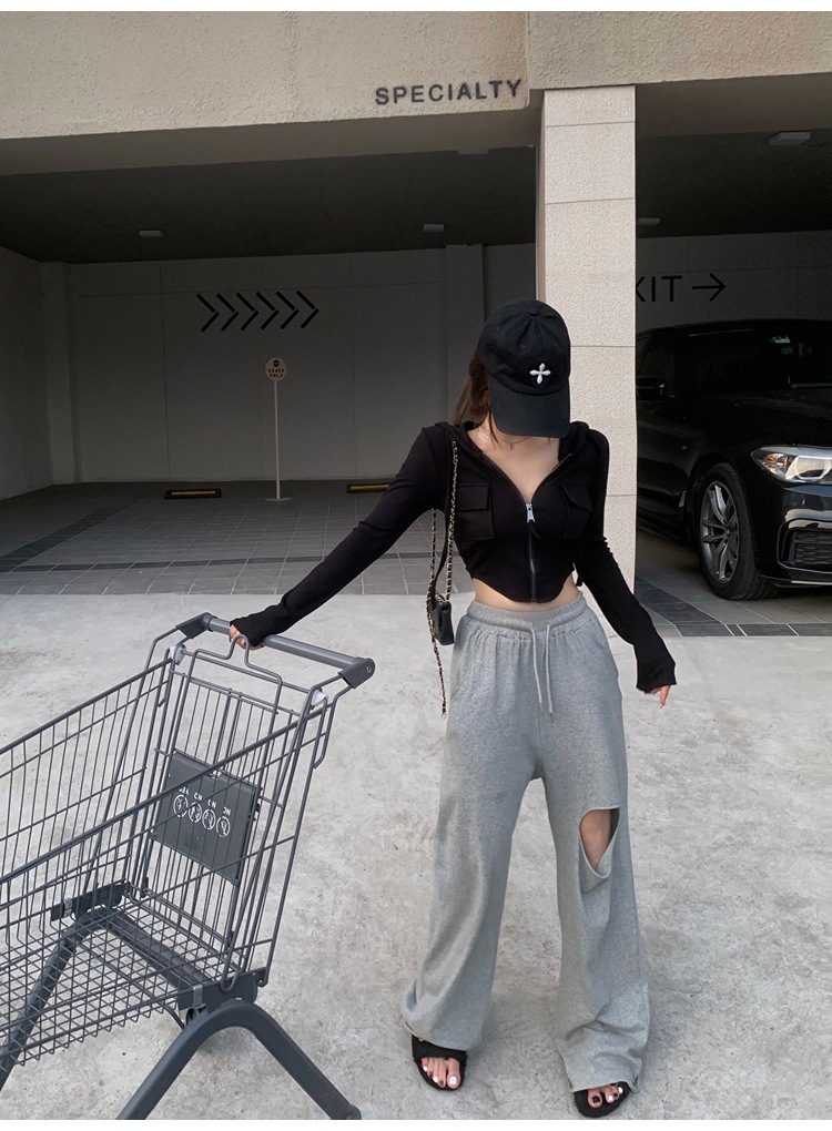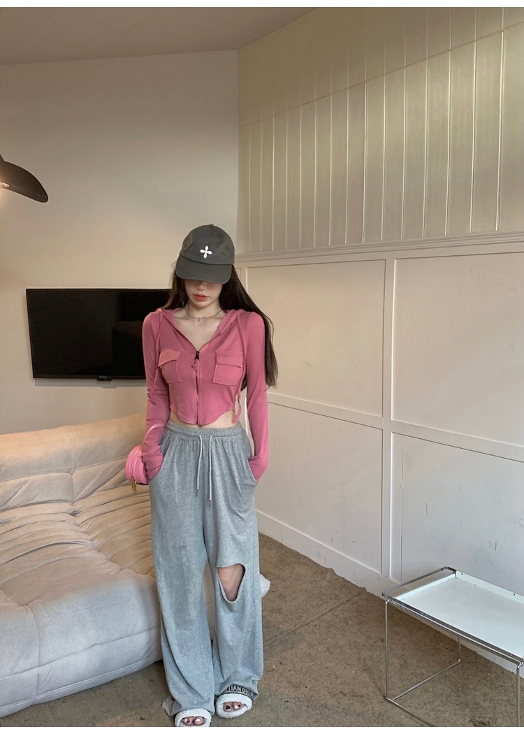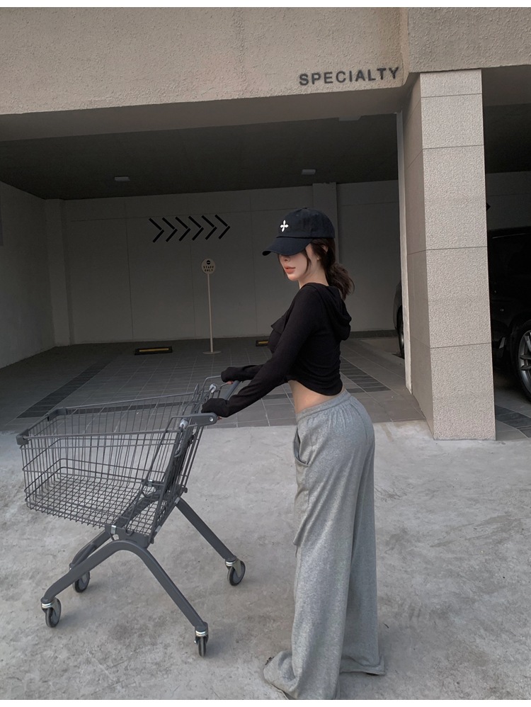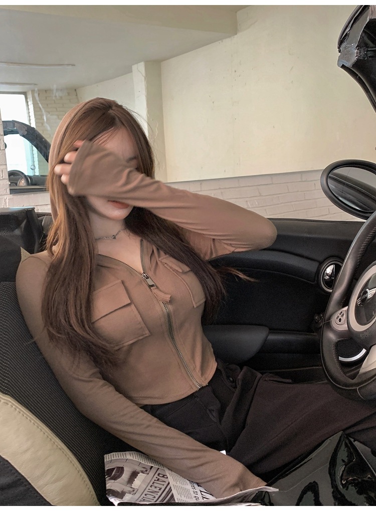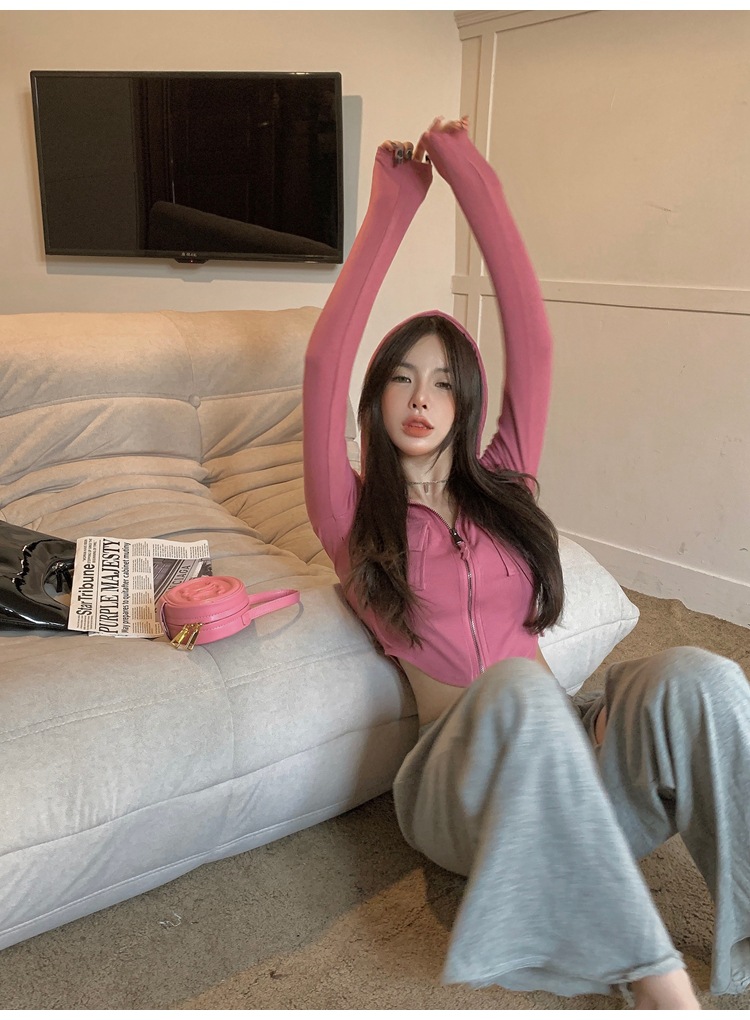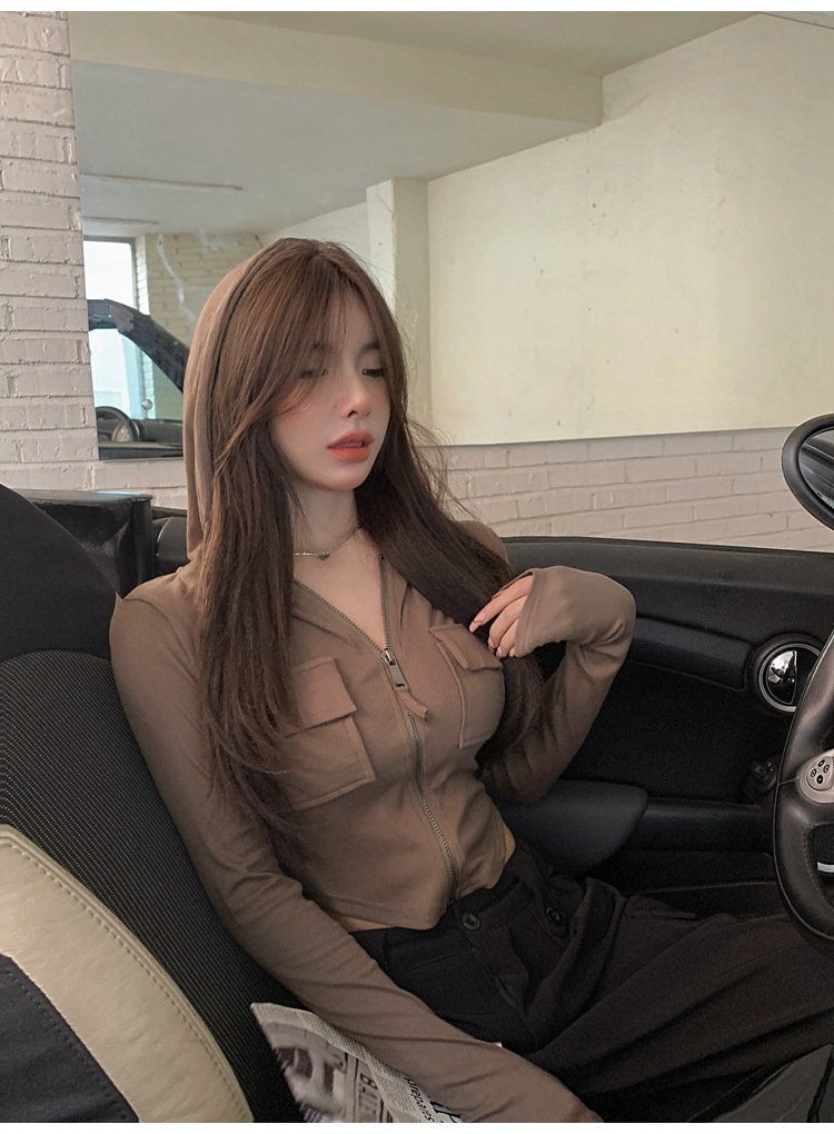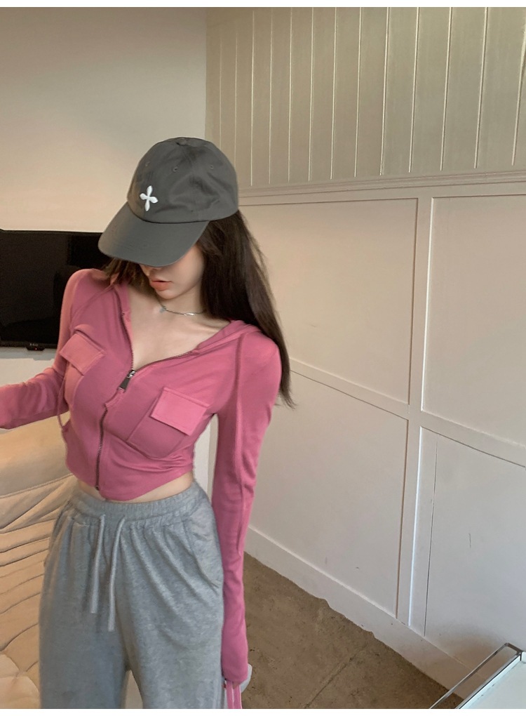 봄과 가을 후드 짧은 어본 디자인 센스 탑 여성용 달콤하고 뜨거운 높은 허리 슬리밍 긴팔 티셔츠 트렌디 카디건스토어 가기