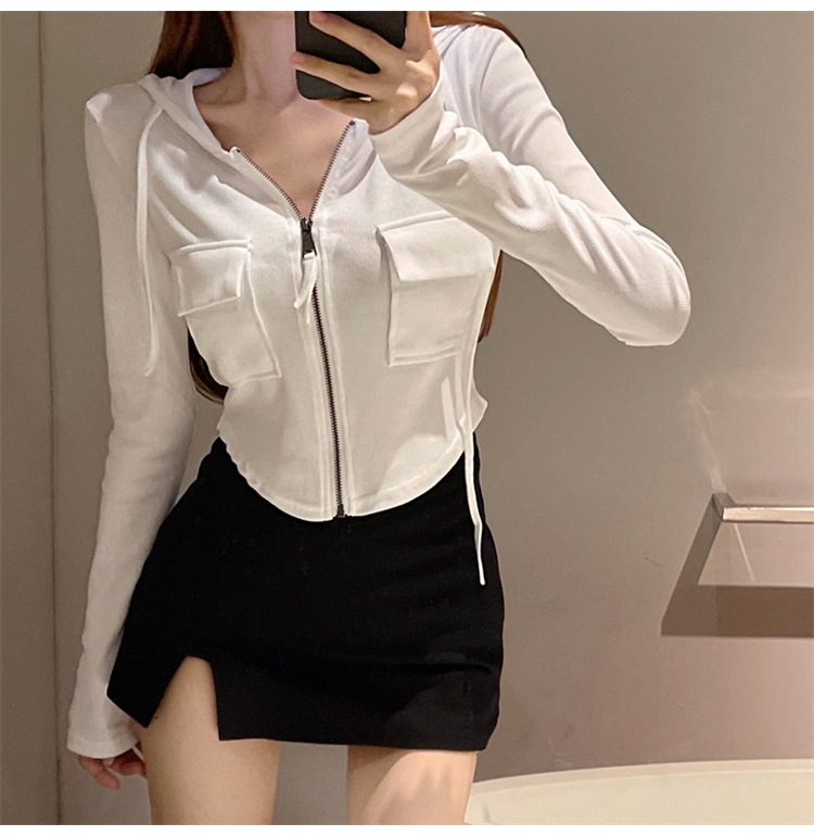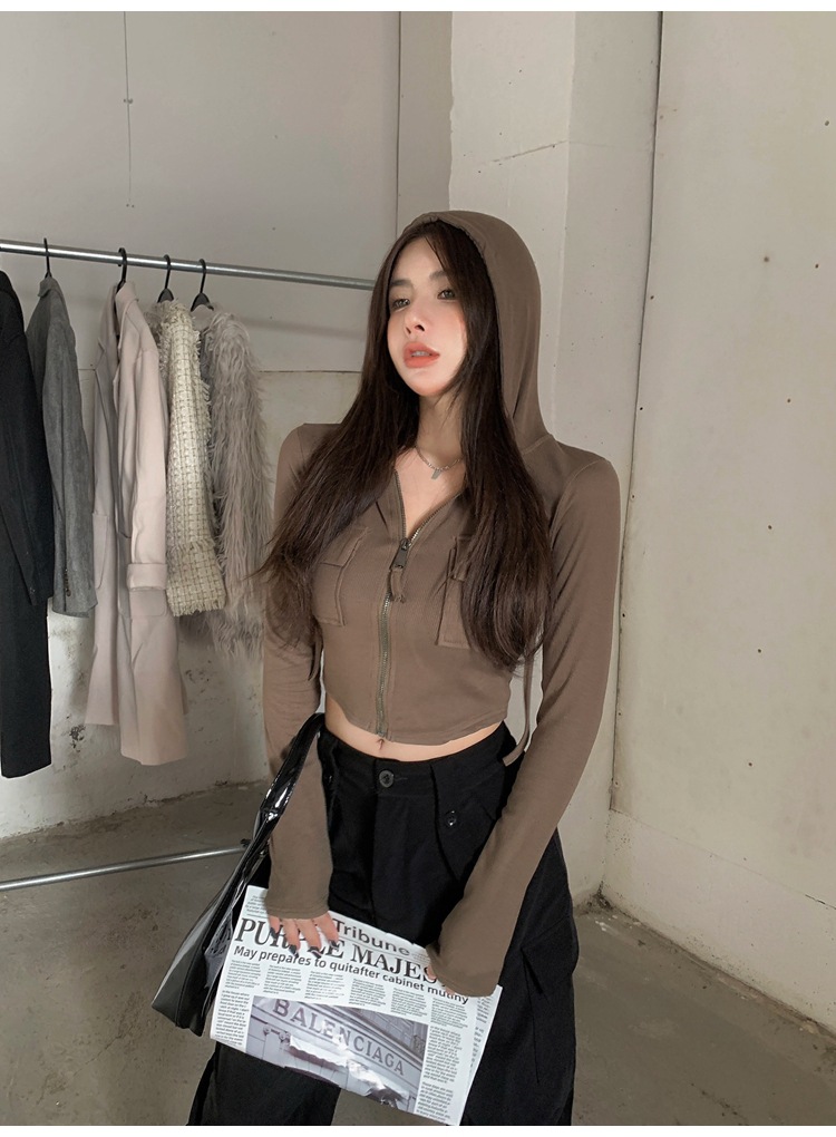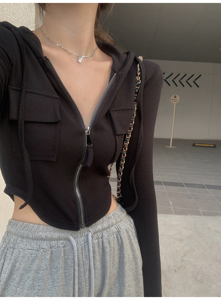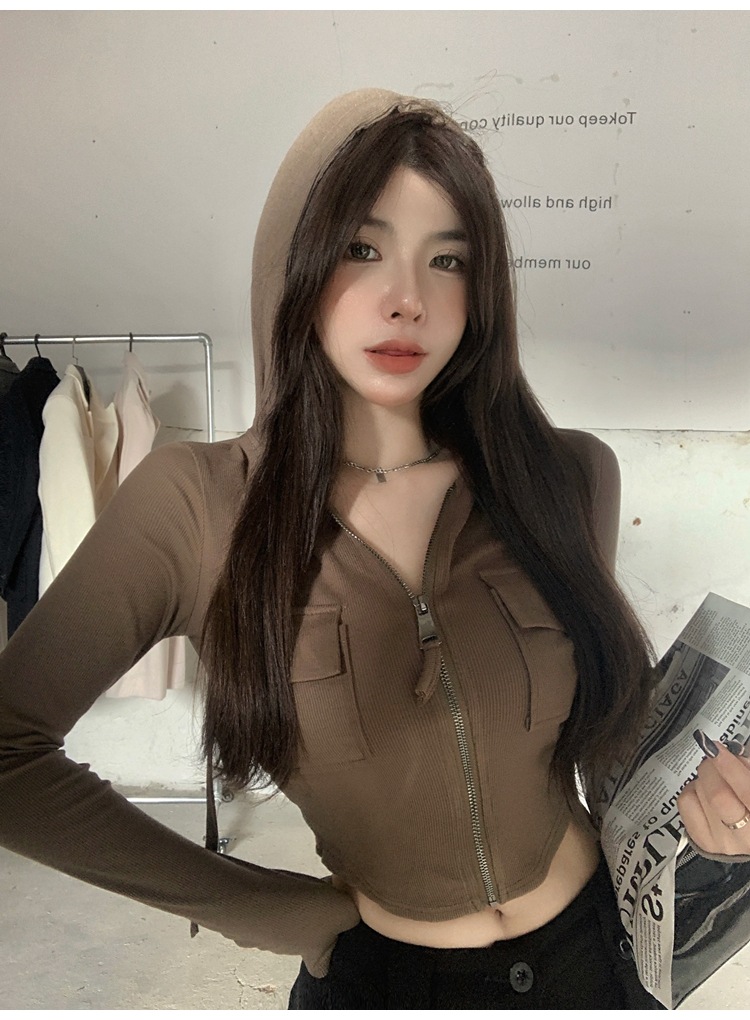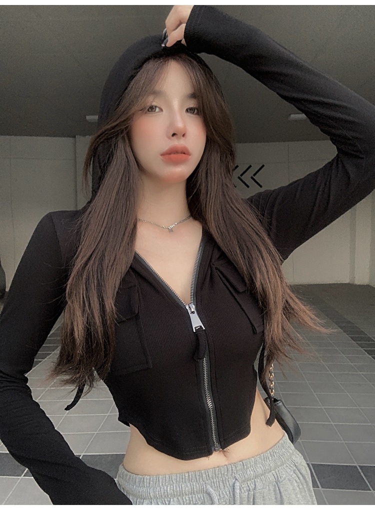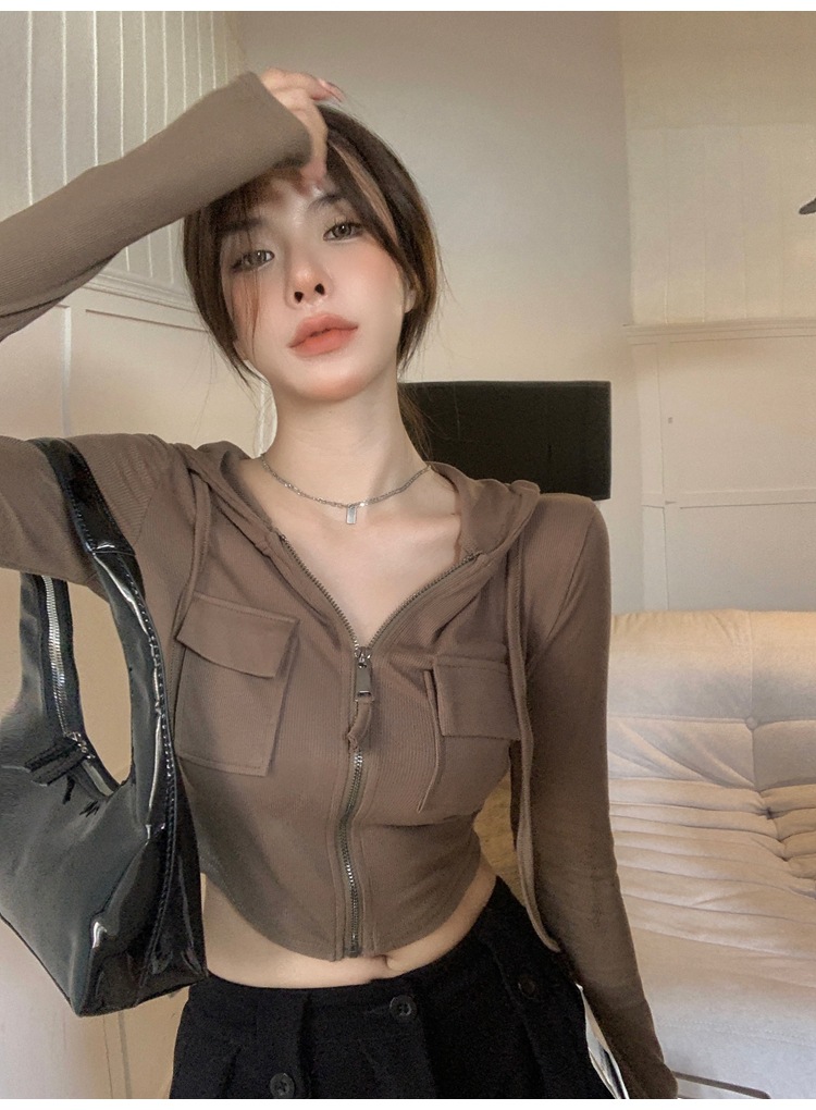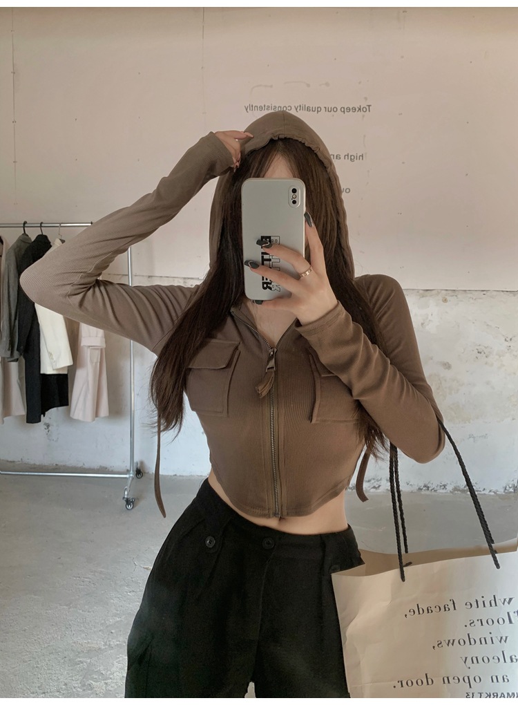 봄과 가을 후드 짧은 어본 디자인 센스 탑 여성용 달콤하고 뜨거운 높은 허리 슬리밍 긴팔 티셔츠 트렌디 카디건