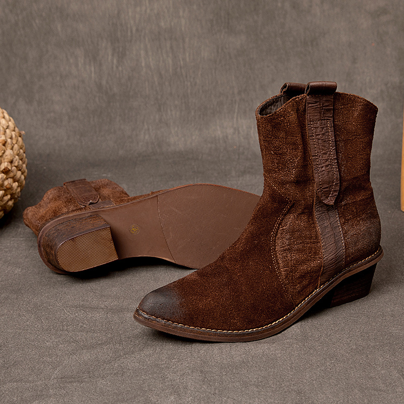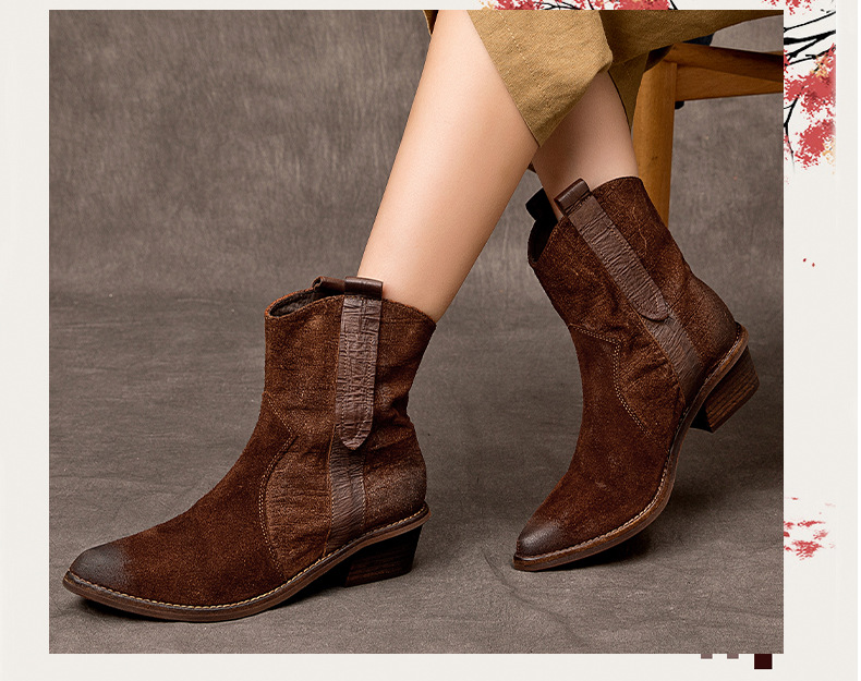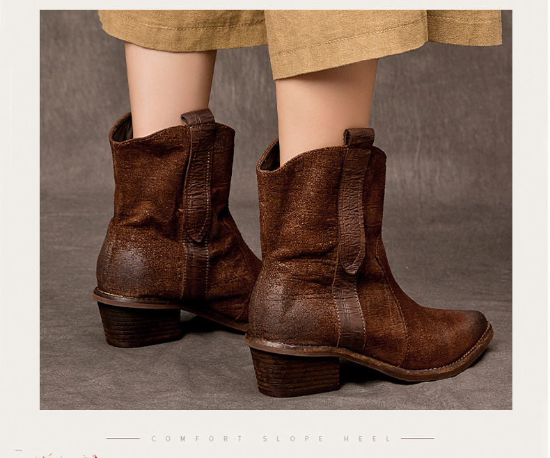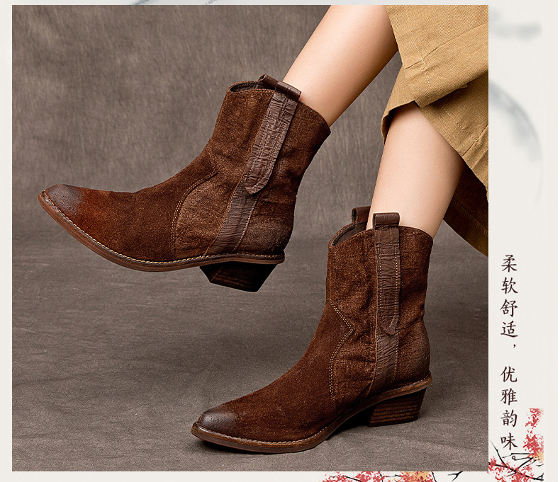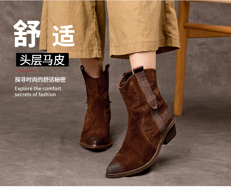 2025 새로운 가을, 겨울 정품 가죽 마틴 부츠 패션 중간 굽 뾰족한 말 가죽 여성 부츠 서양 카우보이 스타일 짧은 부츠 하이 엔드