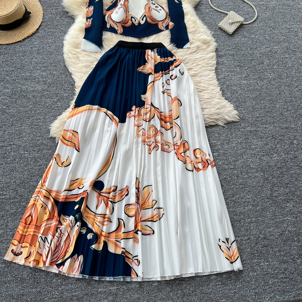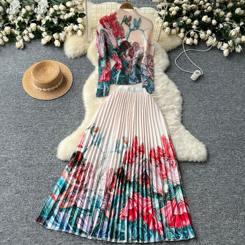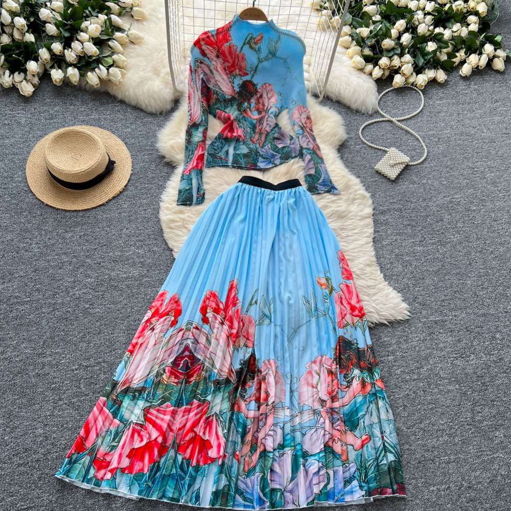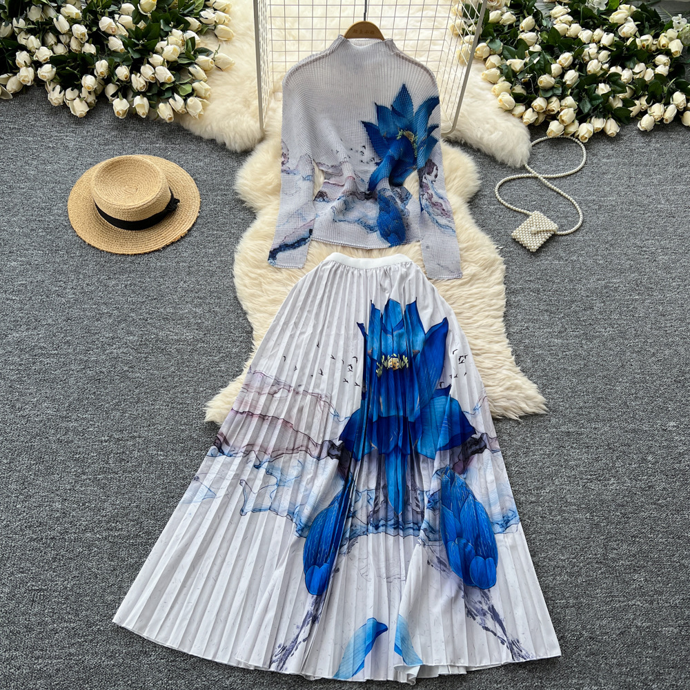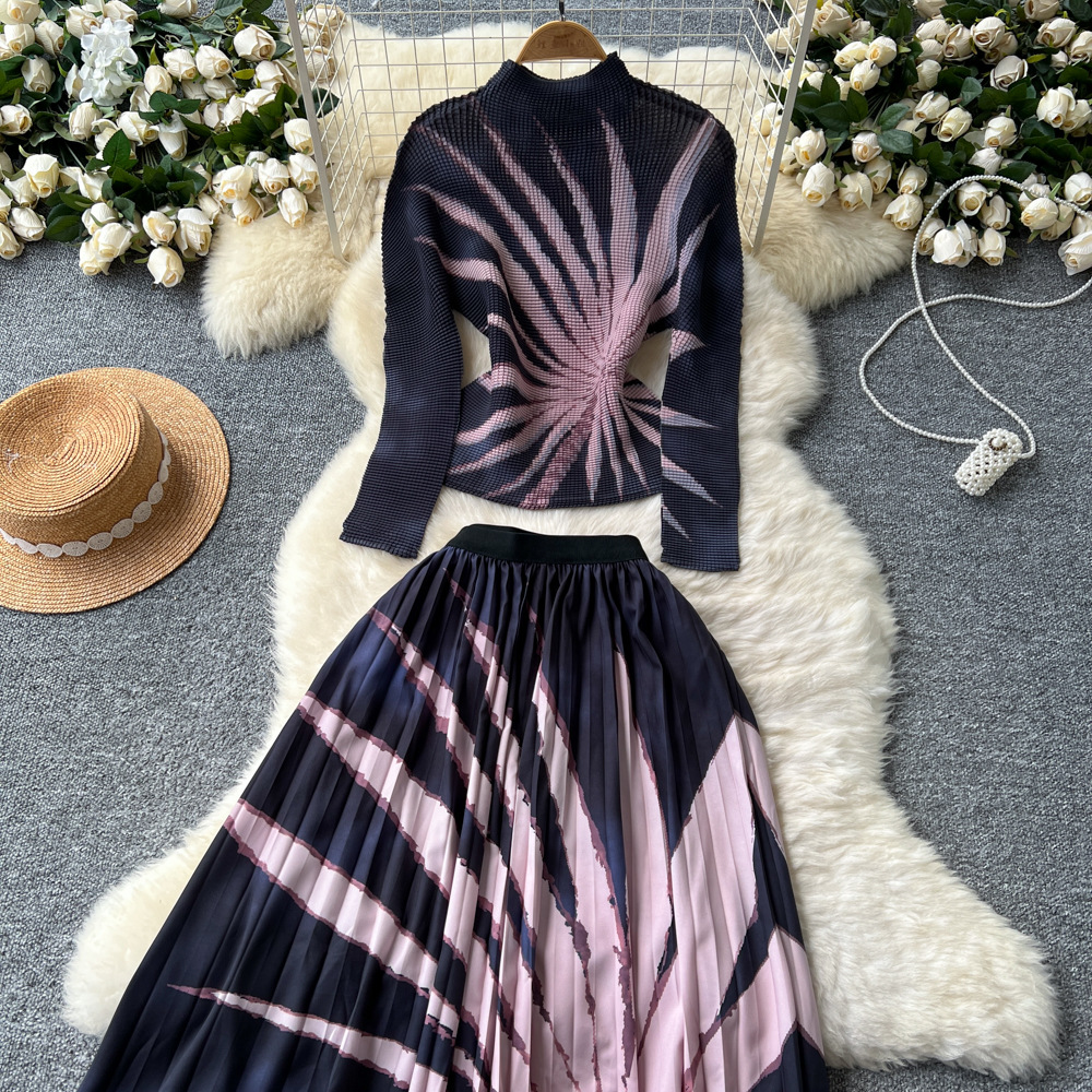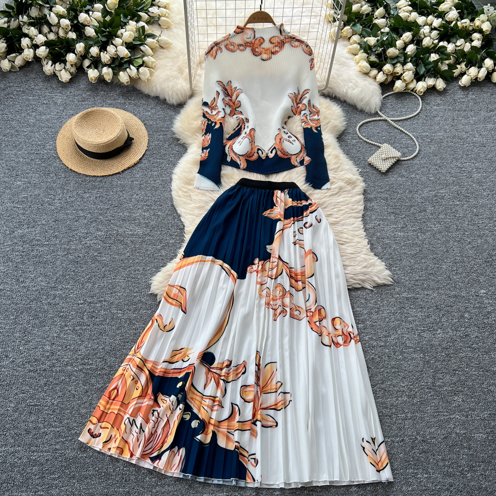 欧美名媛优雅褶皱印花中领长袖上衣女高腰显瘦百褶半身裙秋季套D