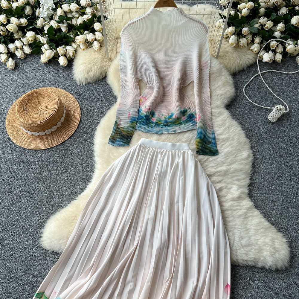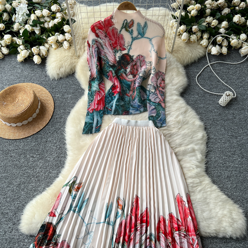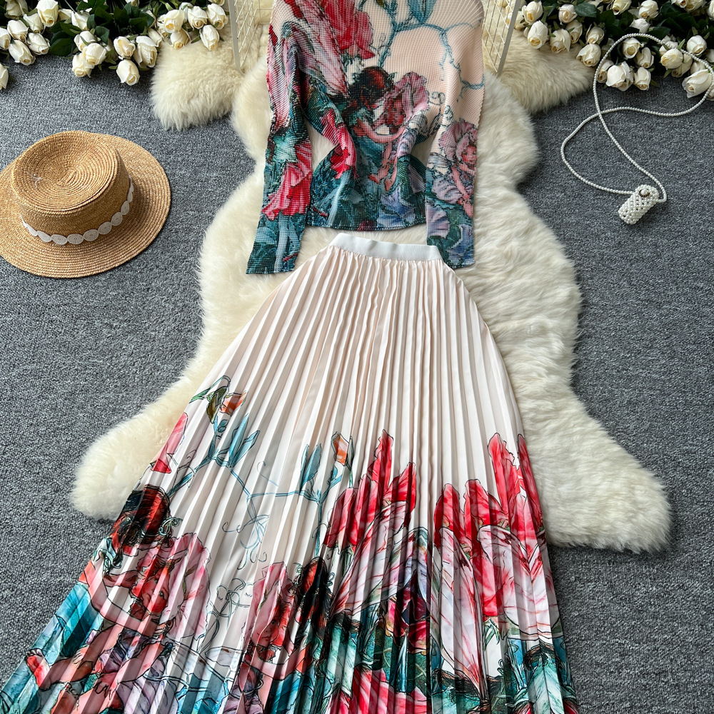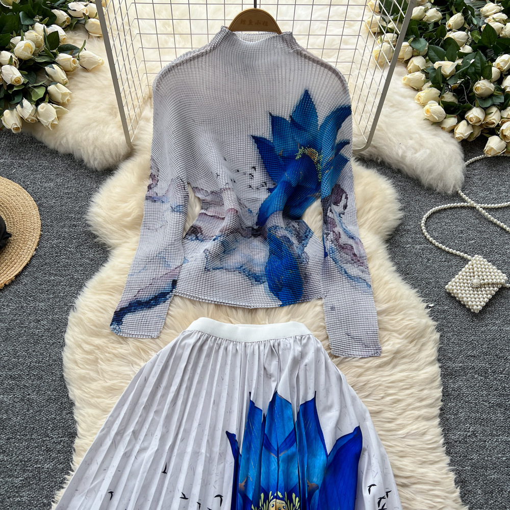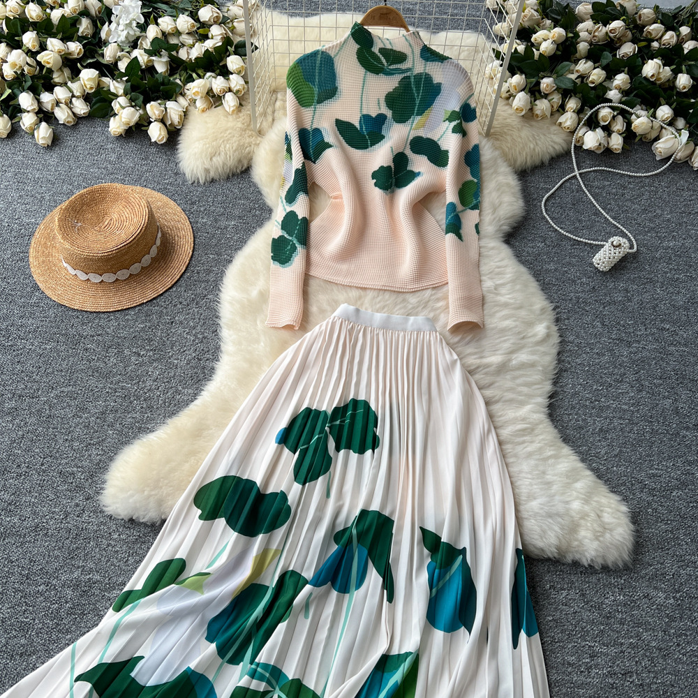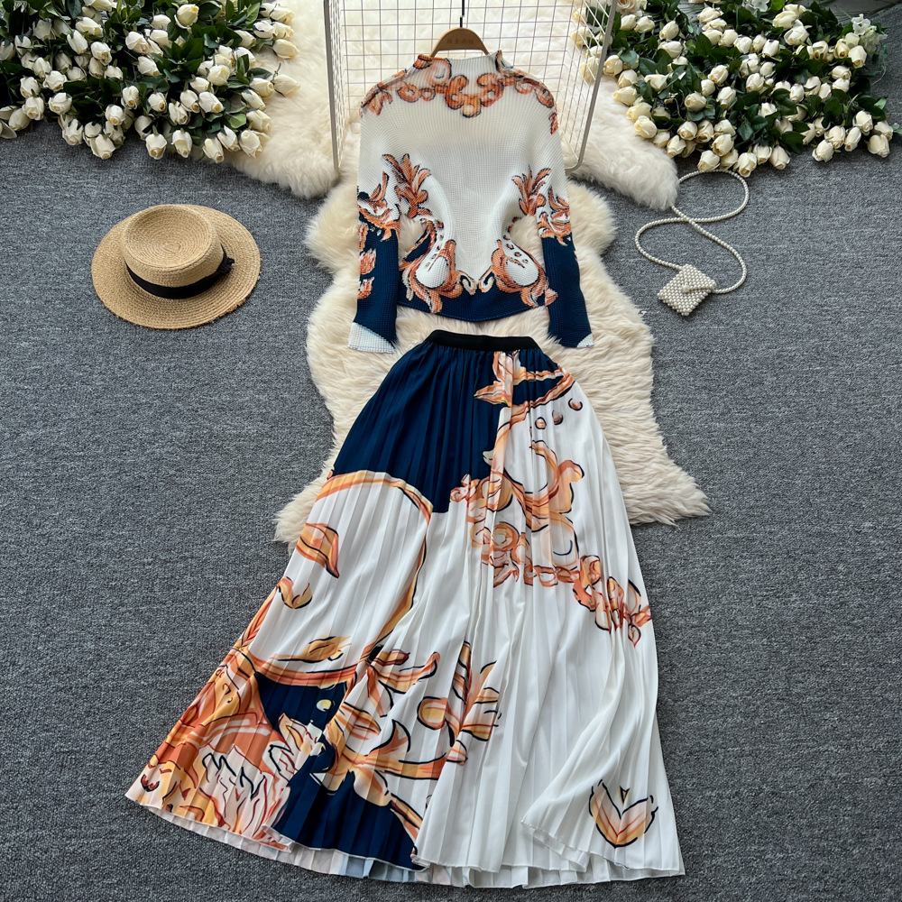 欧美名媛优雅褶皱印花中领长袖上衣女高腰显瘦百褶半身裙秋季套D