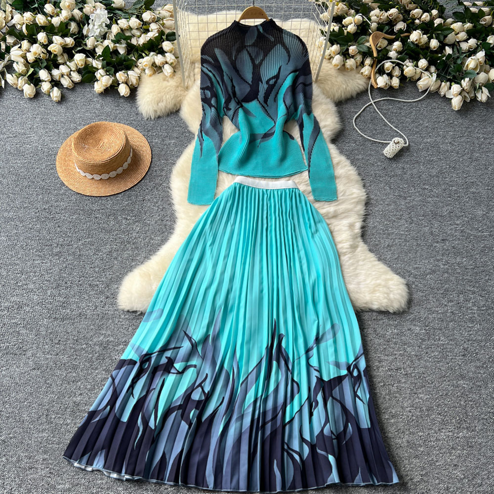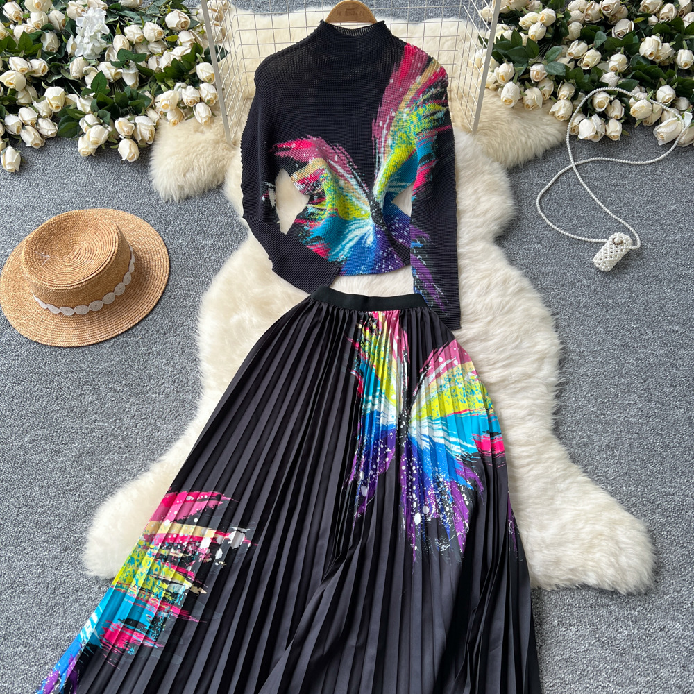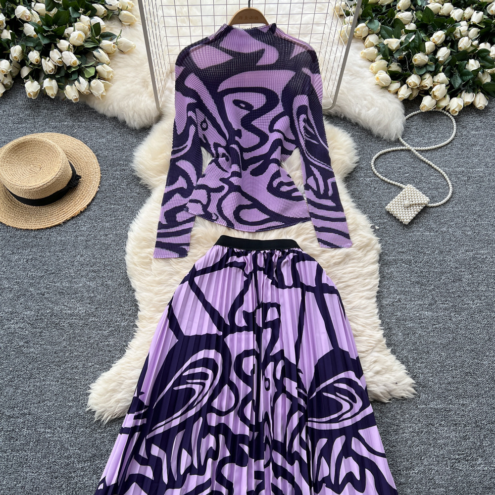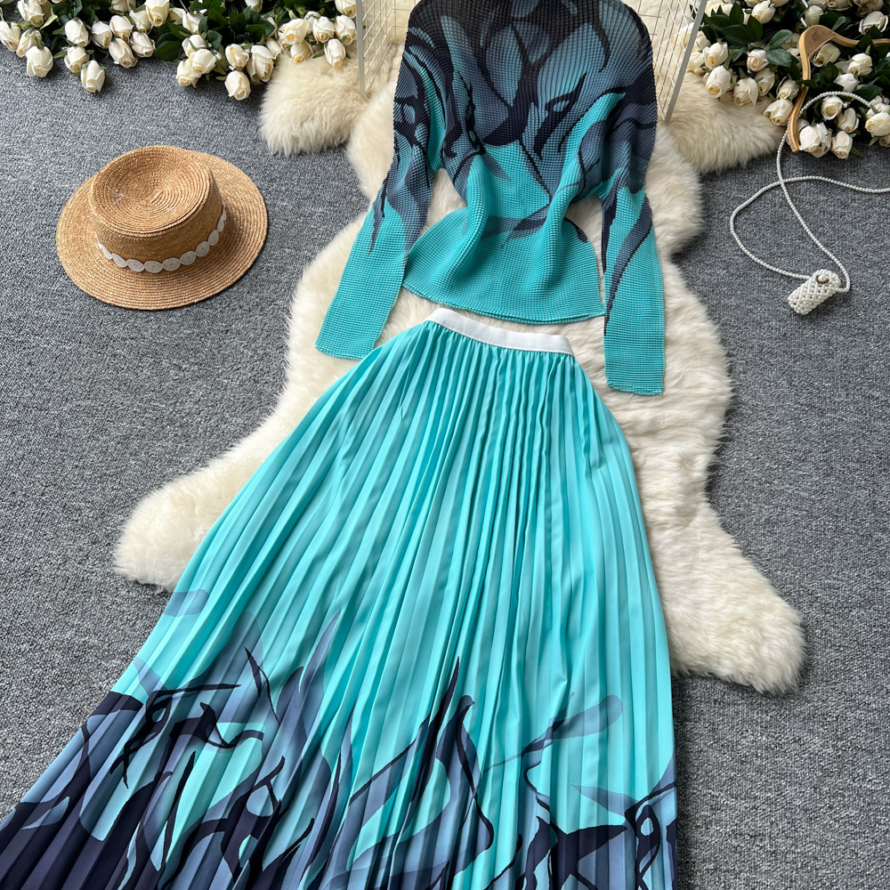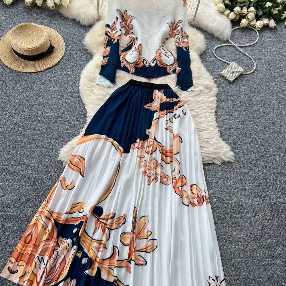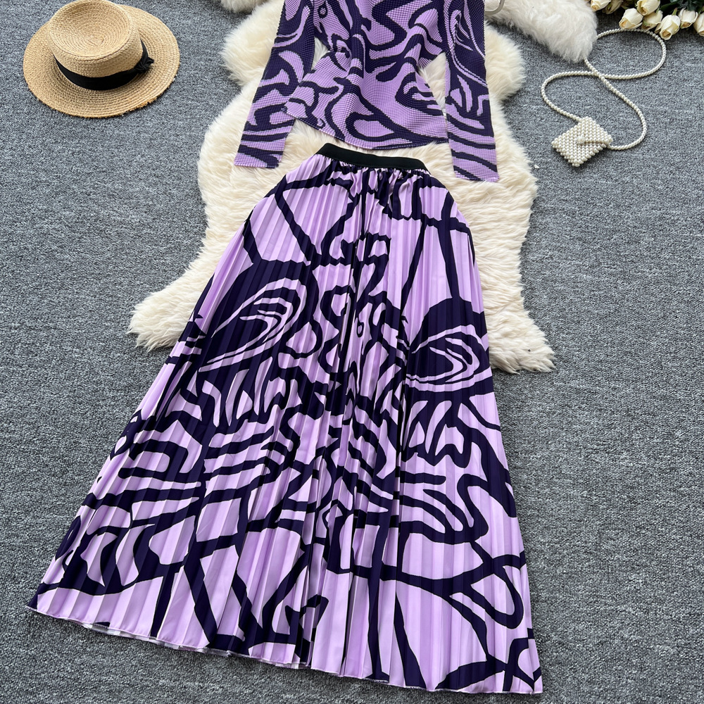 欧美名媛优雅褶皱印花中领长袖上衣女高腰显瘦百褶半身裙秋季套D