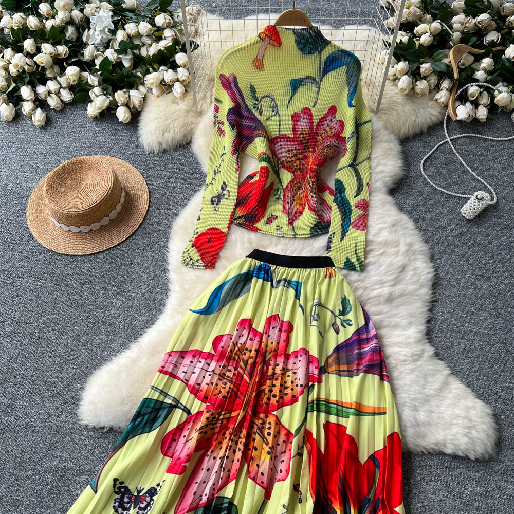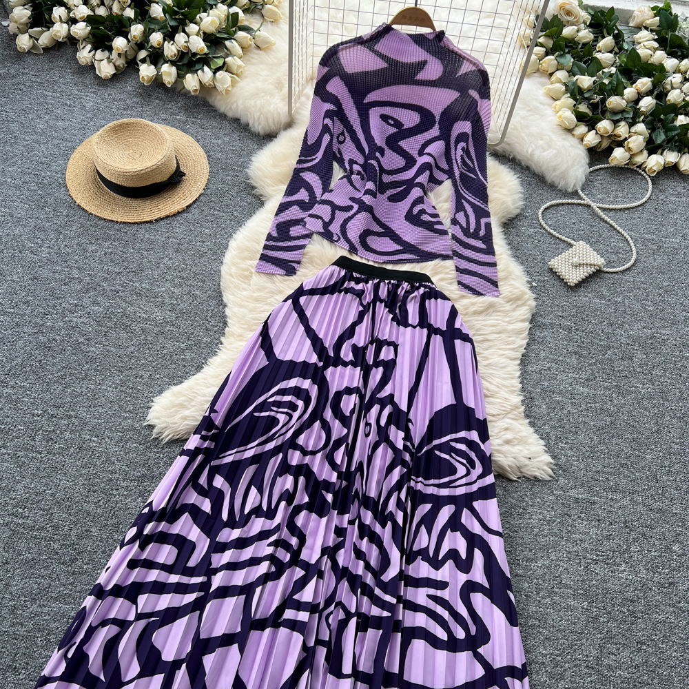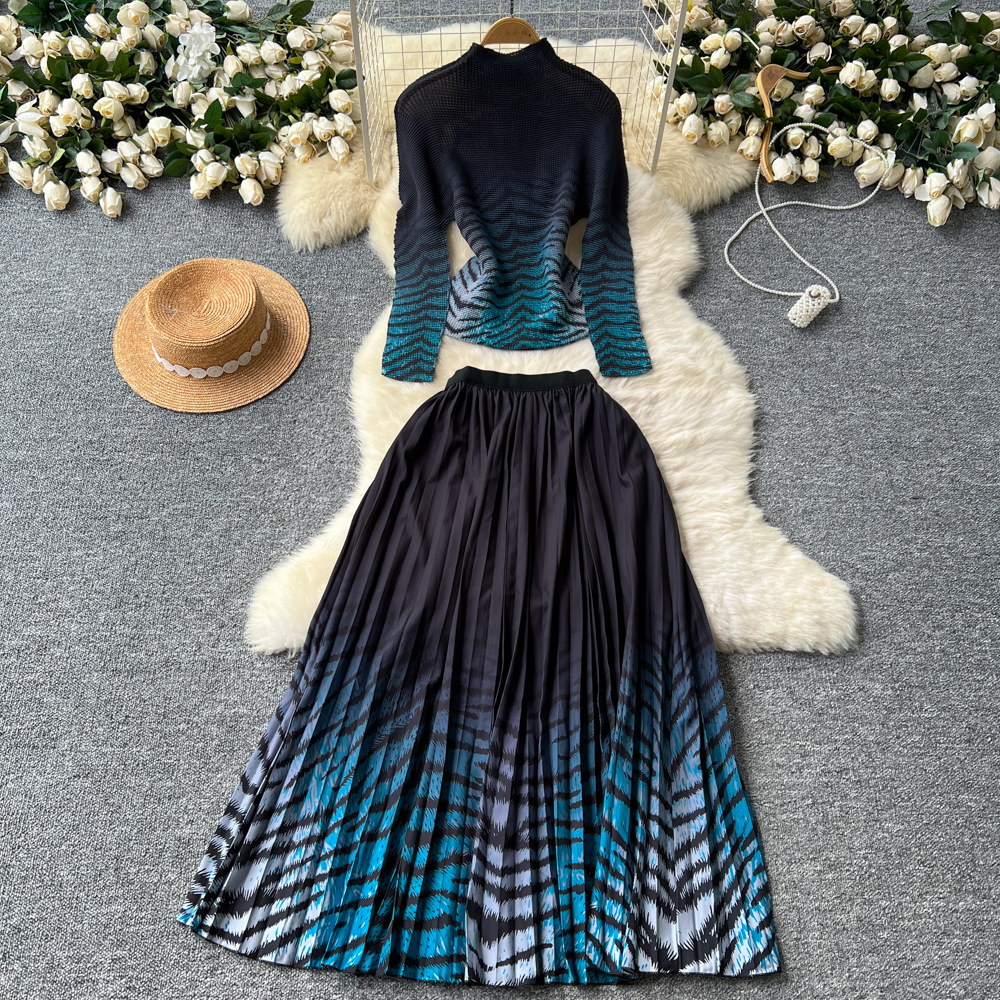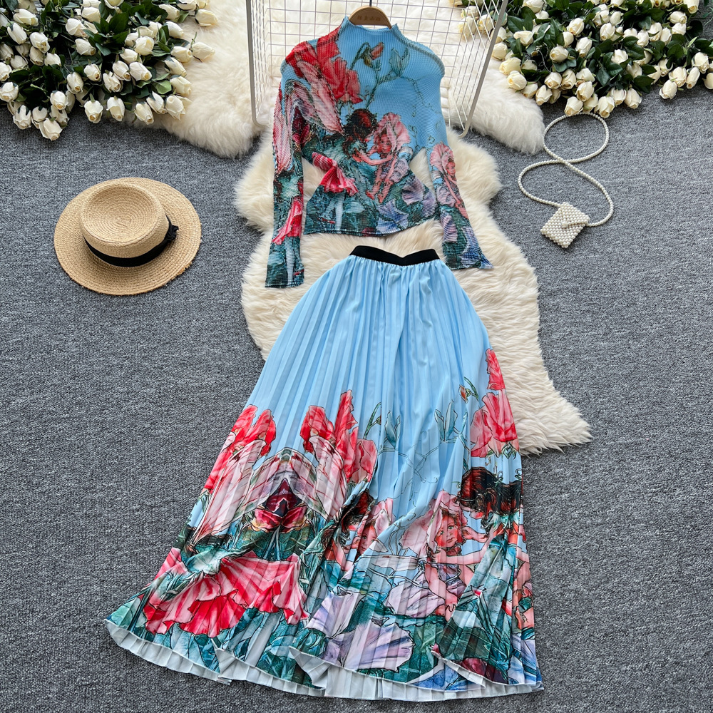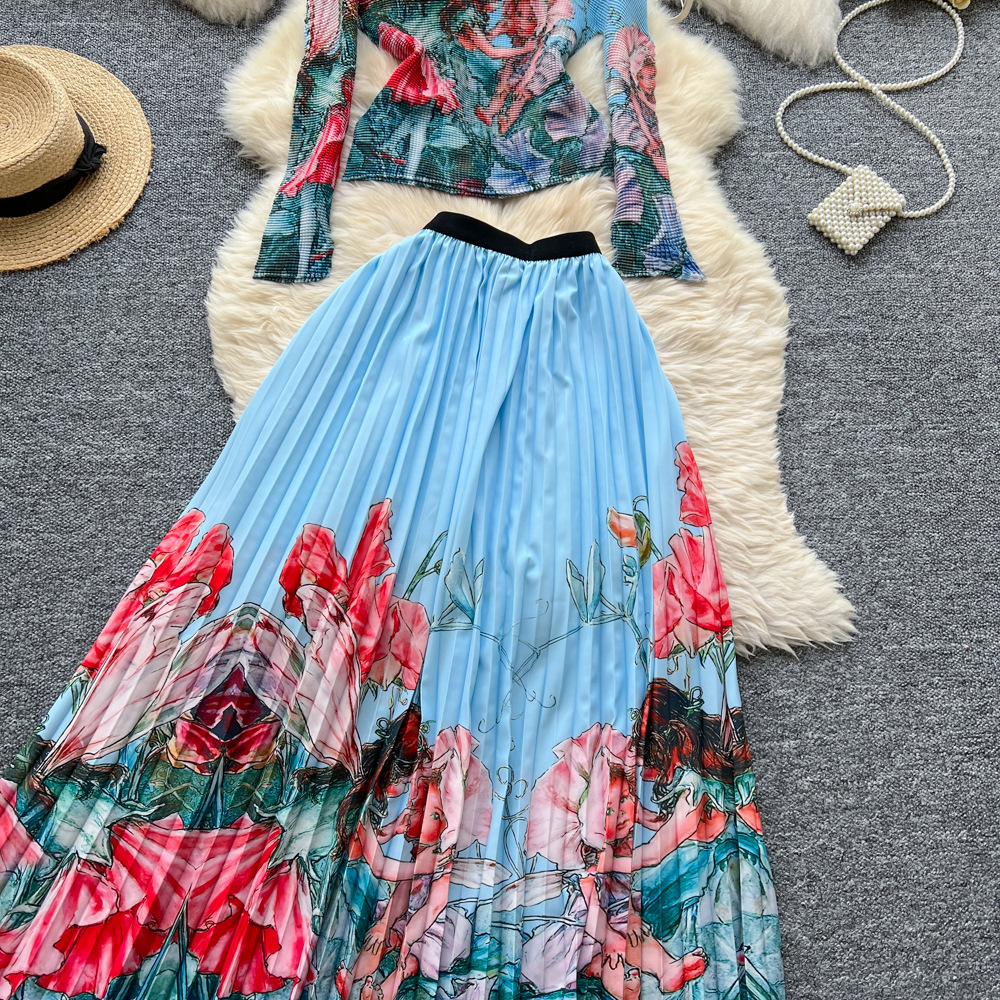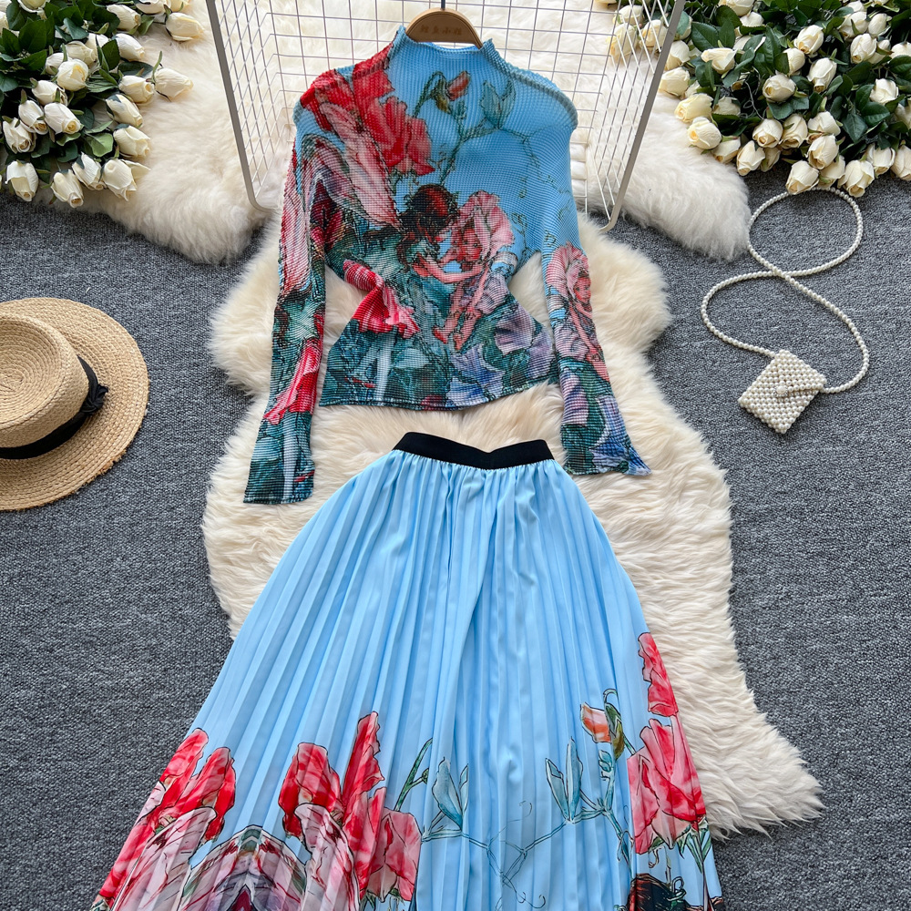 欧美名媛优雅褶皱印花中领长袖上衣女高腰显瘦百褶半身裙秋季套D
