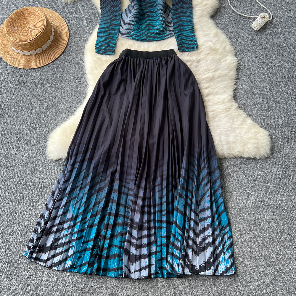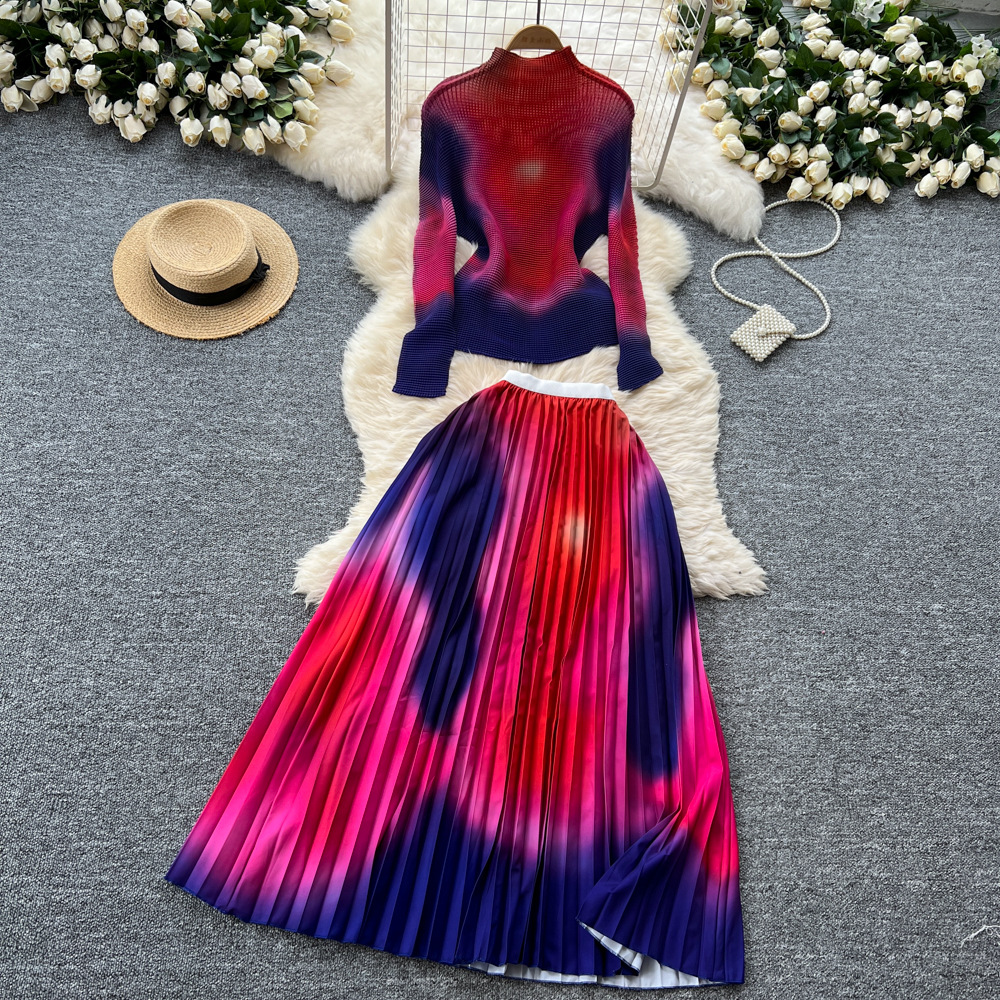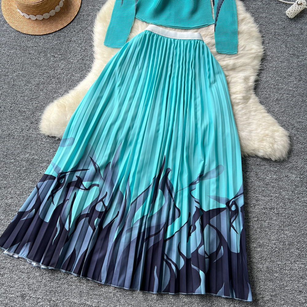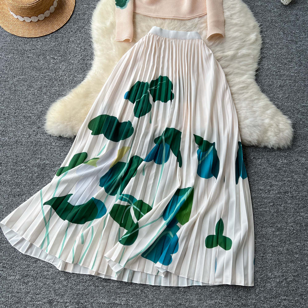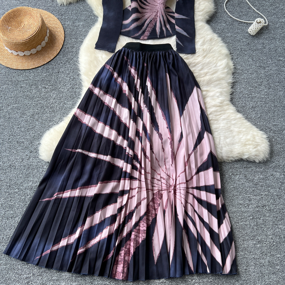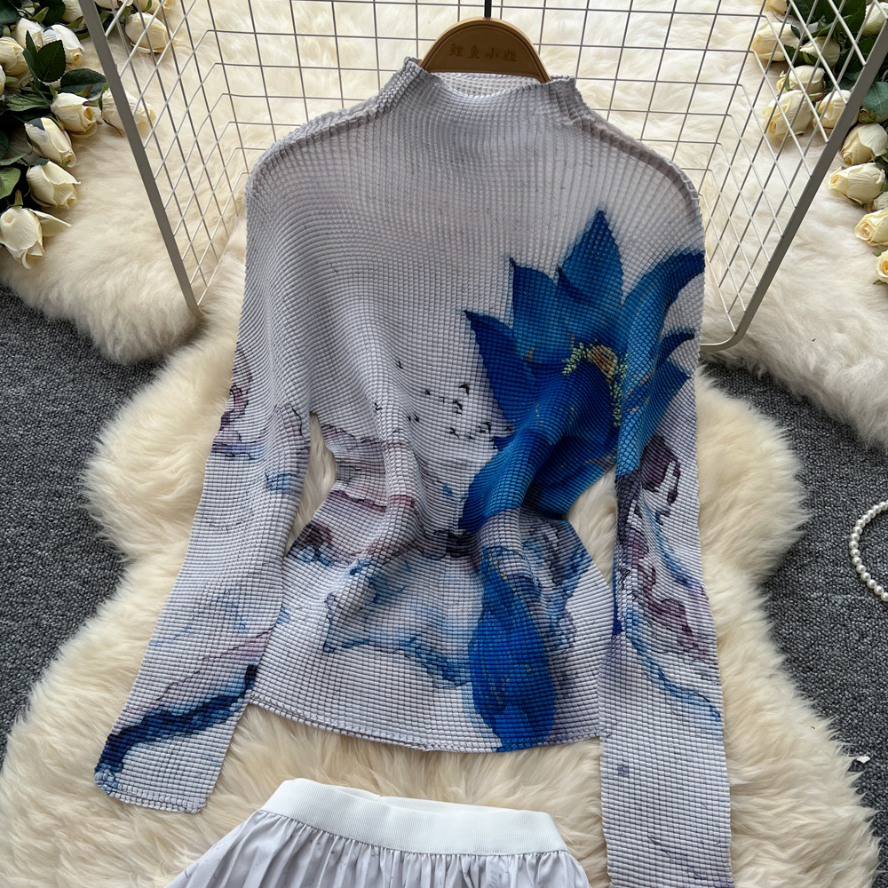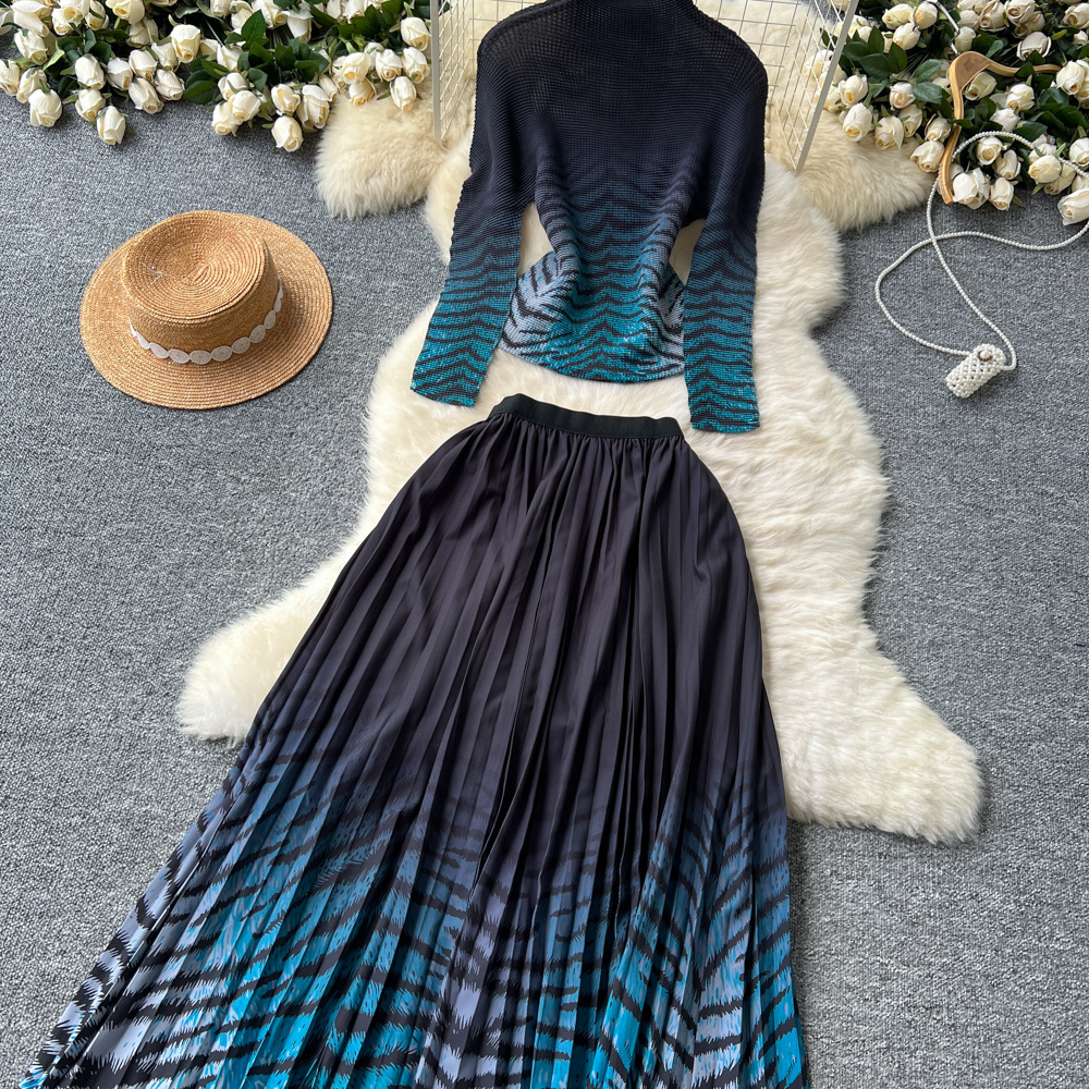 欧美名媛优雅褶皱印花中领长袖上衣女高腰显瘦百褶半身裙秋季套D