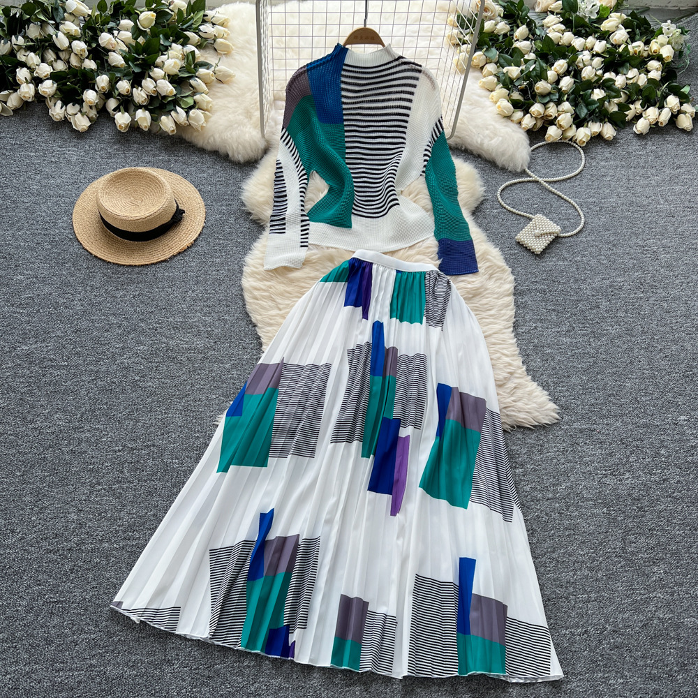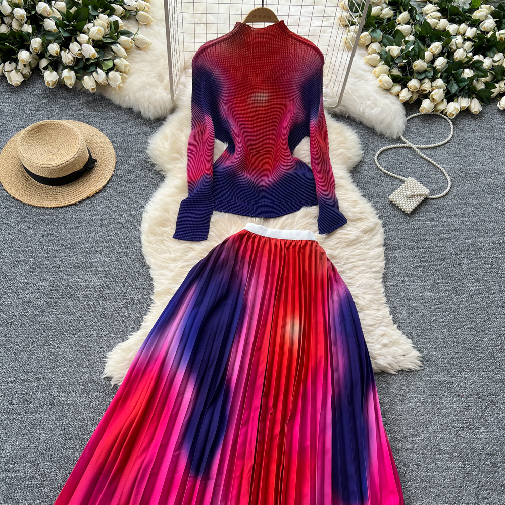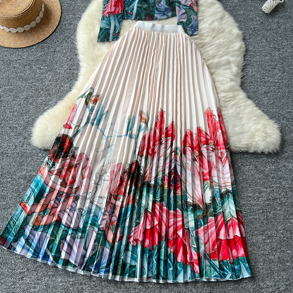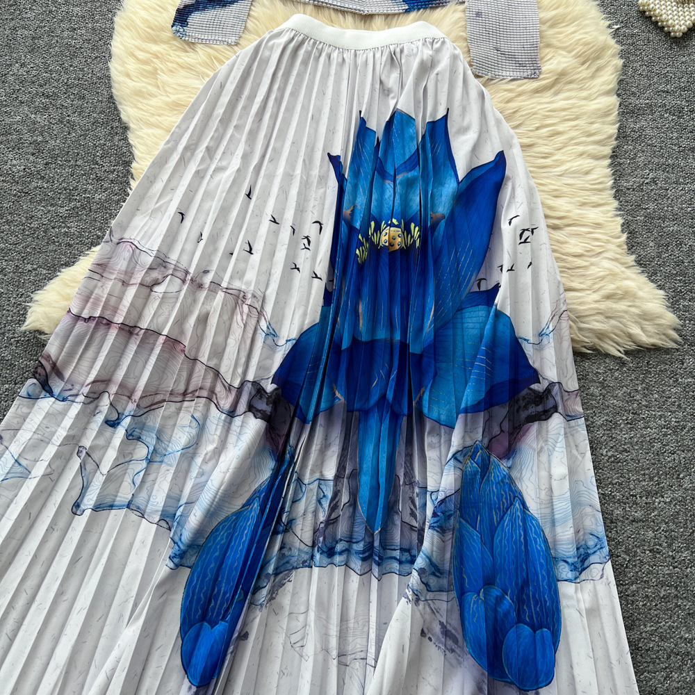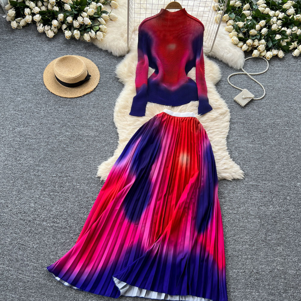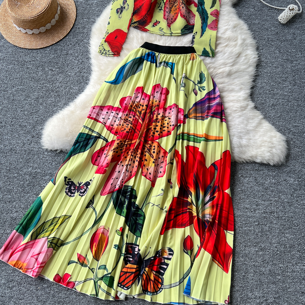 欧美名媛优雅褶皱印花中领长袖上衣女高腰显瘦百褶半身裙秋季套D