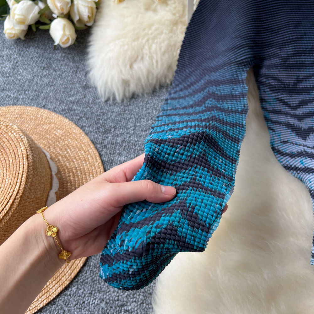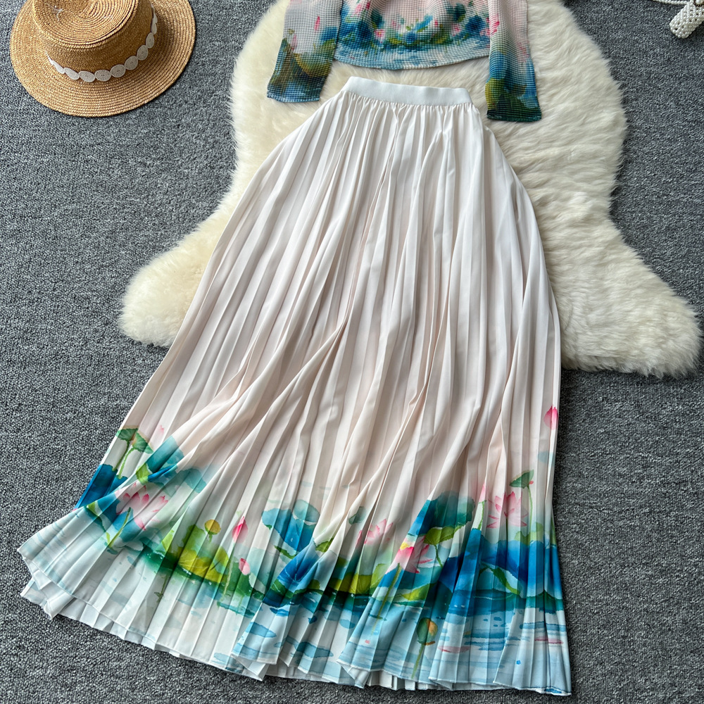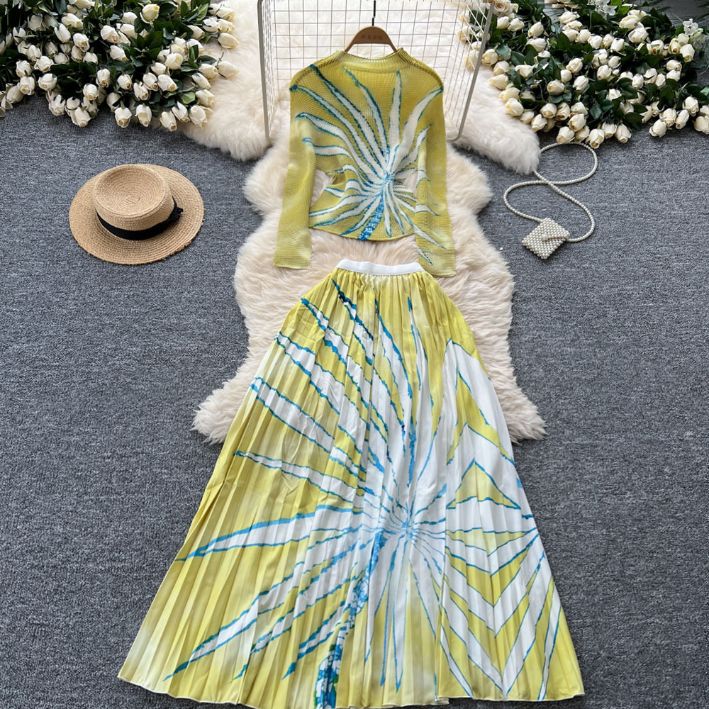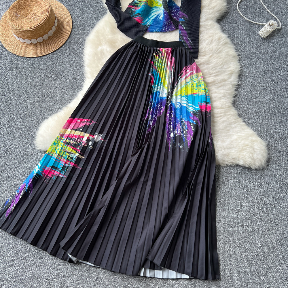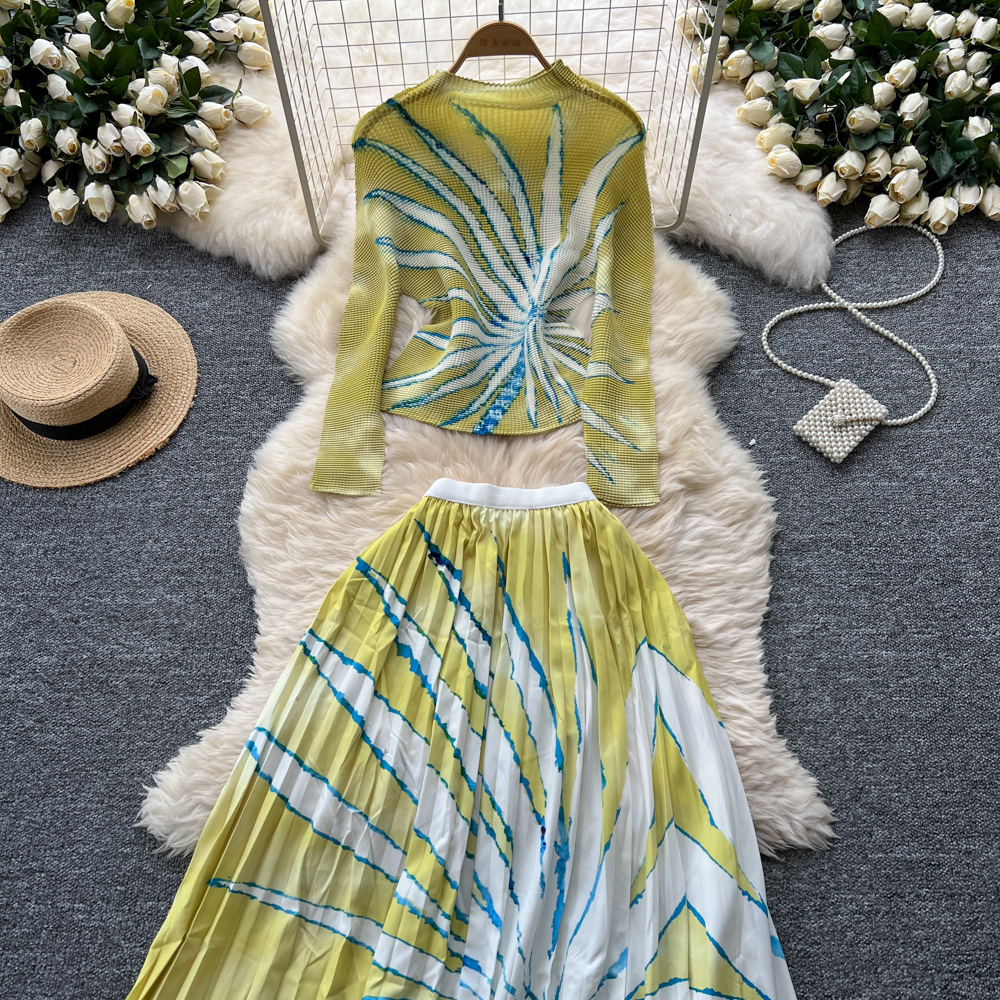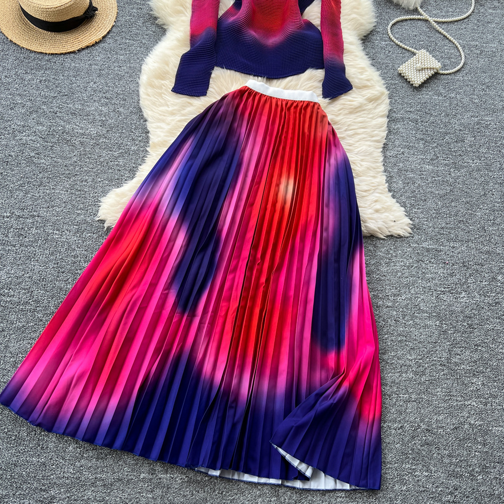 欧美名媛优雅褶皱印花中领长袖上衣女高腰显瘦百褶半身裙秋季套D
