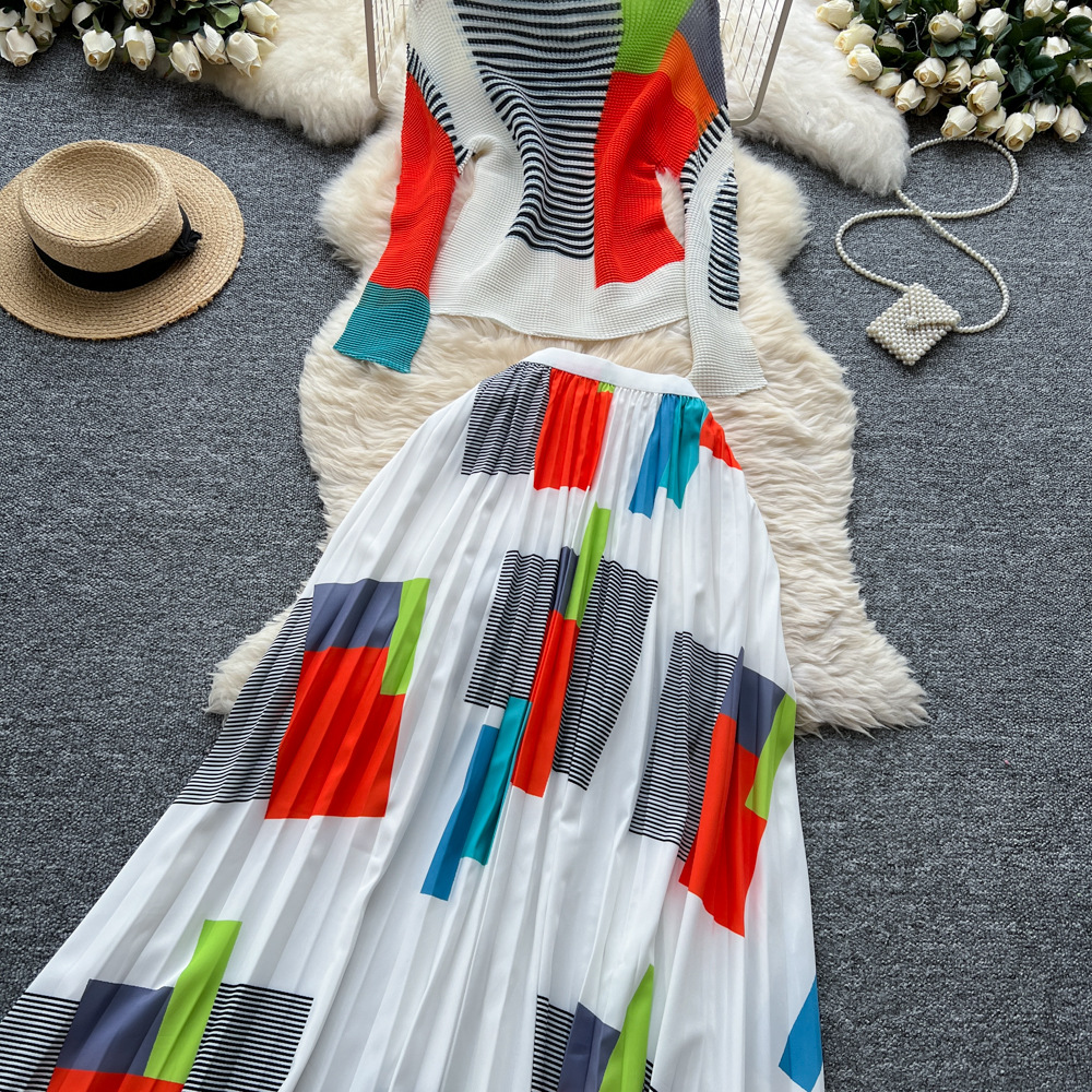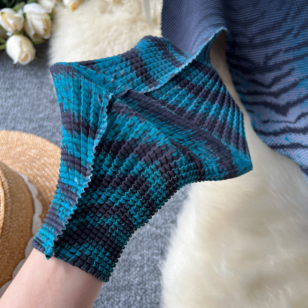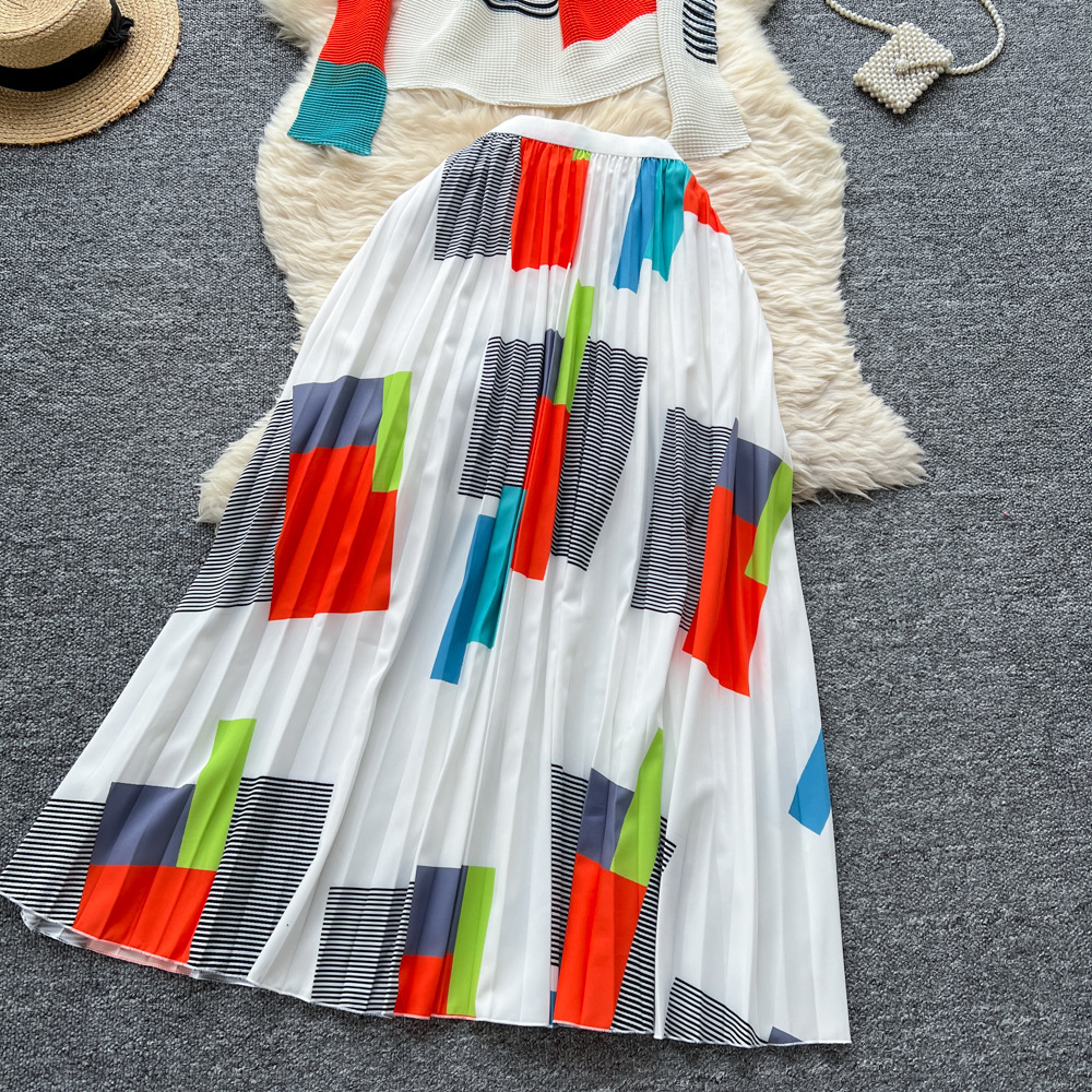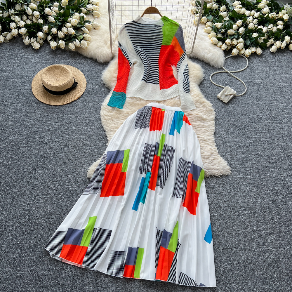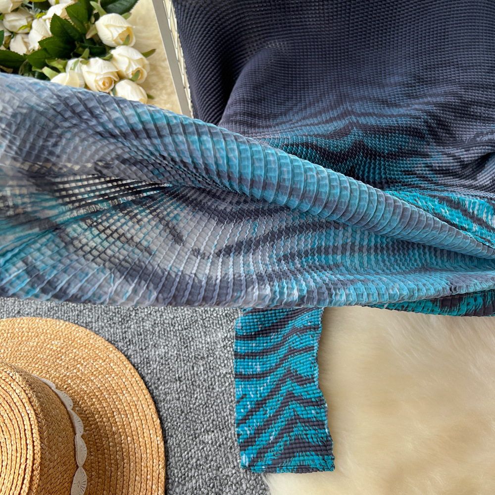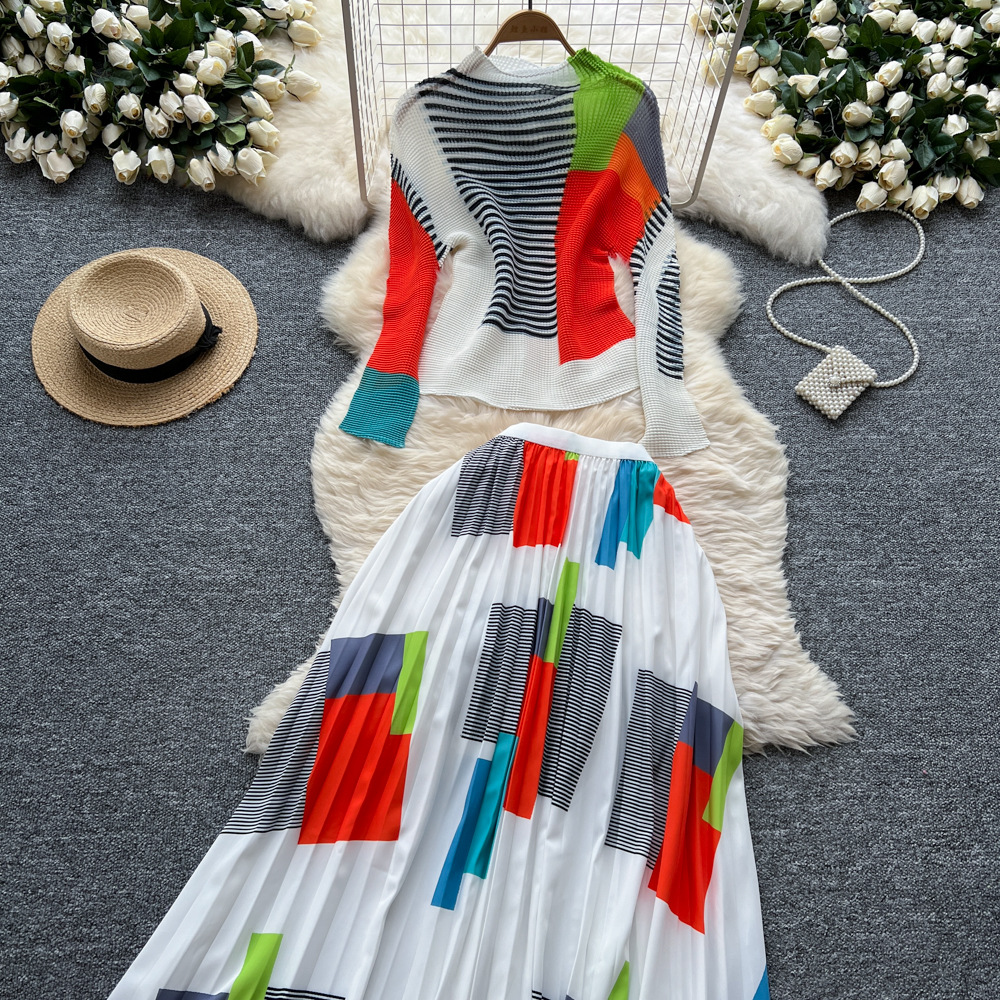 欧美名媛优雅褶皱印花中领长袖上衣女高腰显瘦百褶半身裙秋季套D