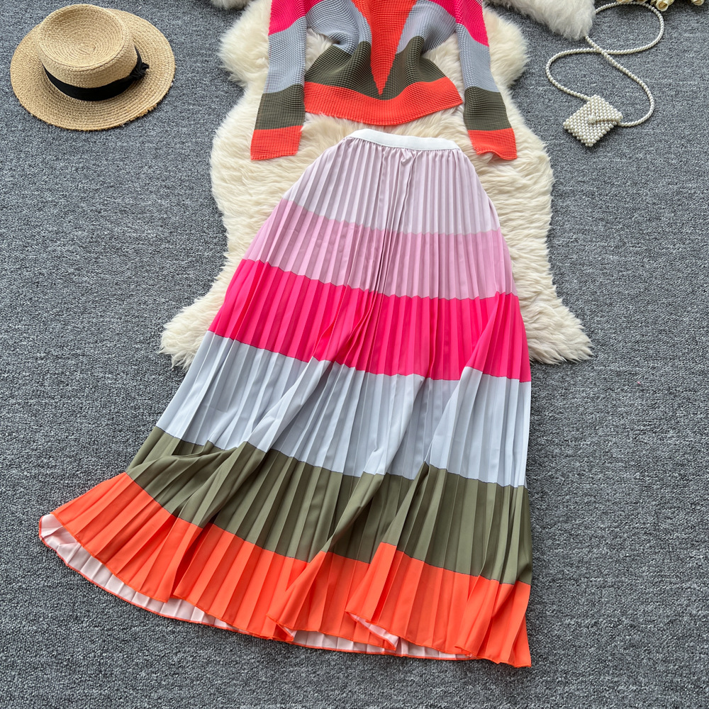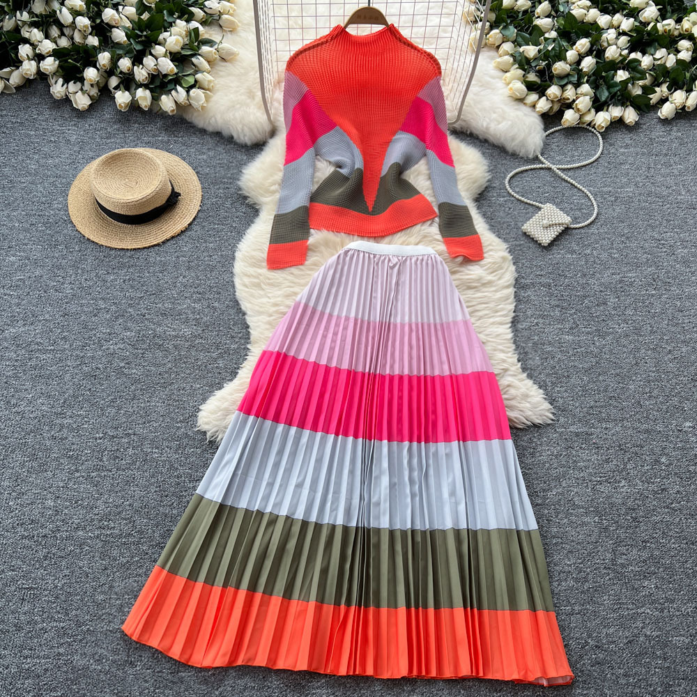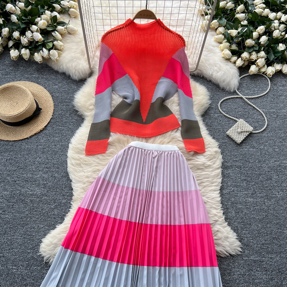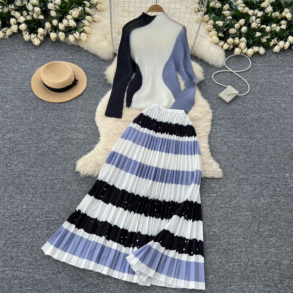 유럽과 미국의 사교계 우아한 주름 장식 중간 칼라 긴 소매 최고 여성의 높은 허리 슬리밍 주름 치마 가을 세트 D