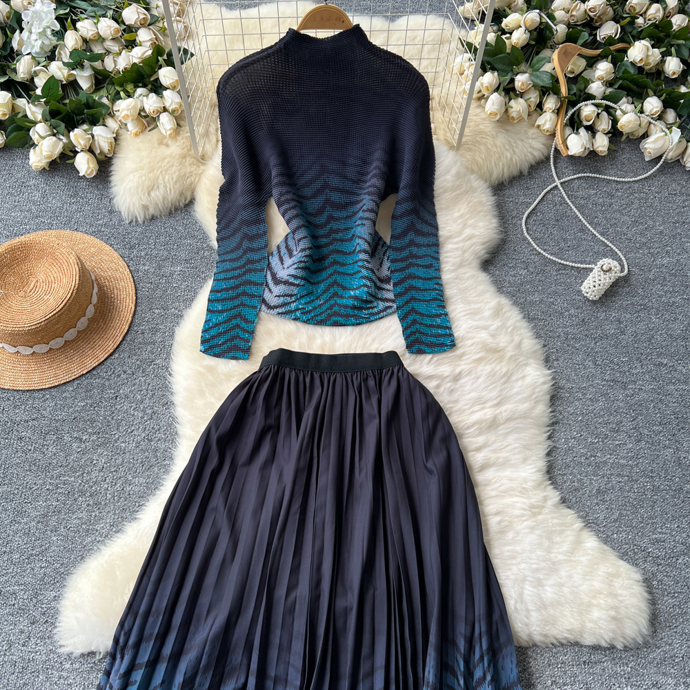 유럽과 미국의 사교계 우아한 주름 장식 중간 칼라 긴 소매 최고 여성의 높은 허리 슬리밍 주름 치마 가을 세트 D스토어 가기