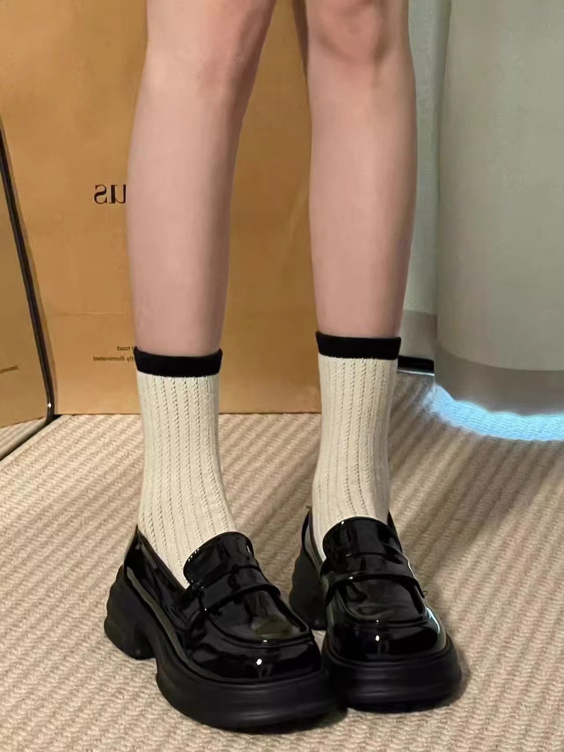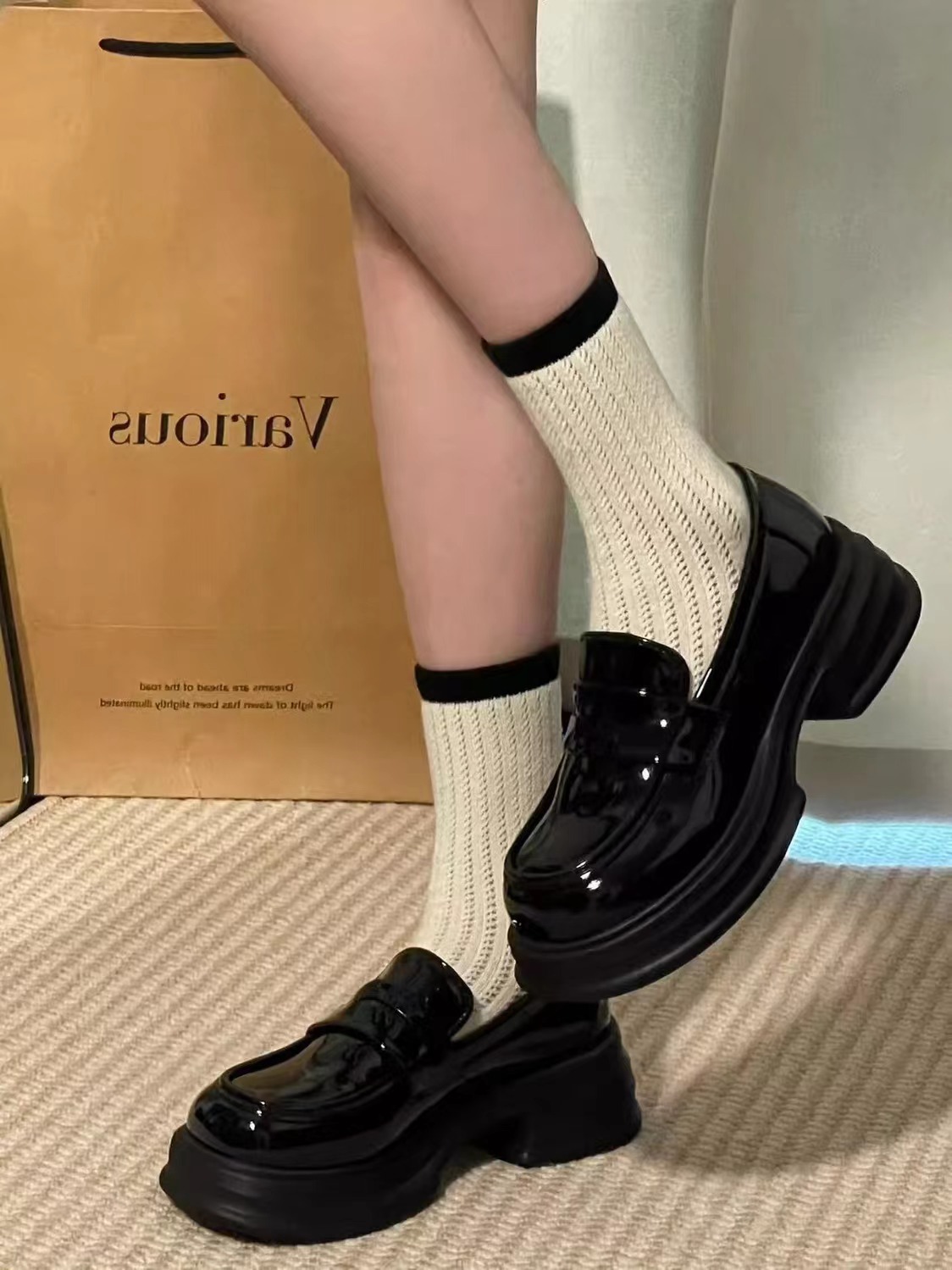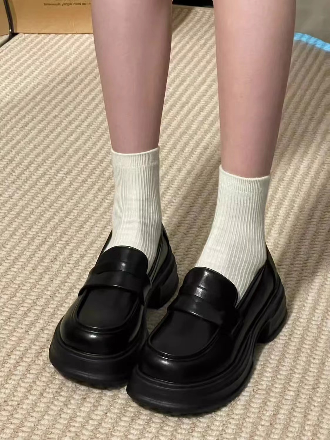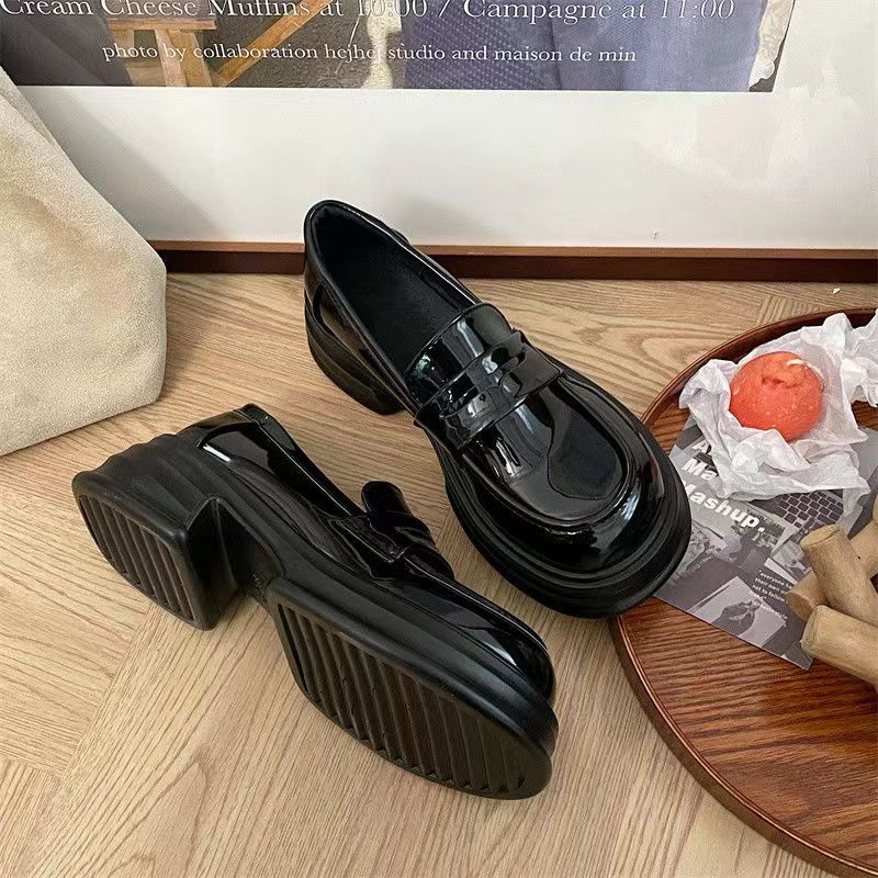 검은 굵은 가죽 신발 여성의 영국 2024 새로운 봄 복고풍 Jk 균일 한 싱글 레이어 신발 두꺼운 밑바닥 로퍼 증가스토어 가기
