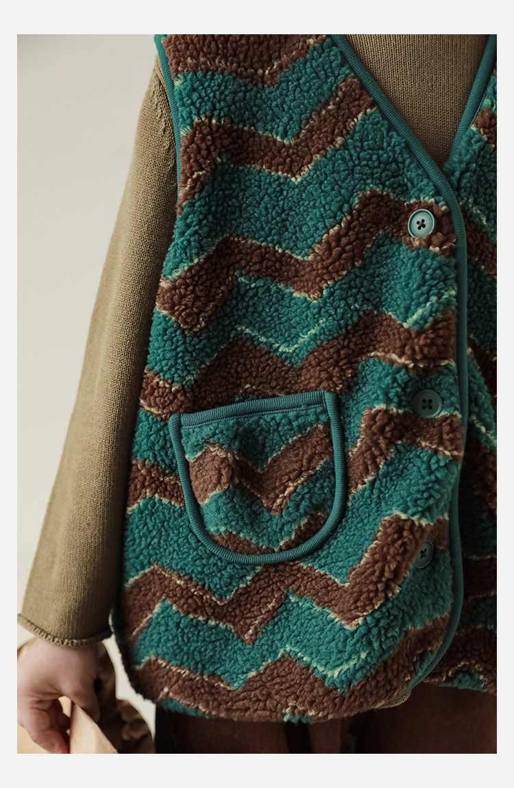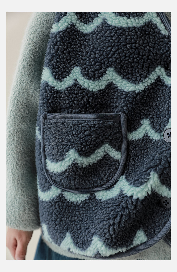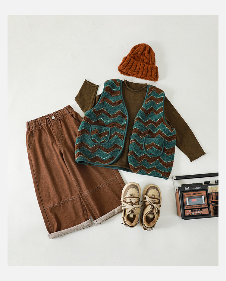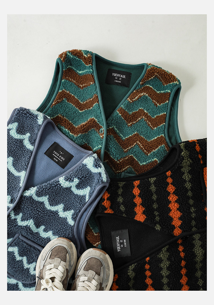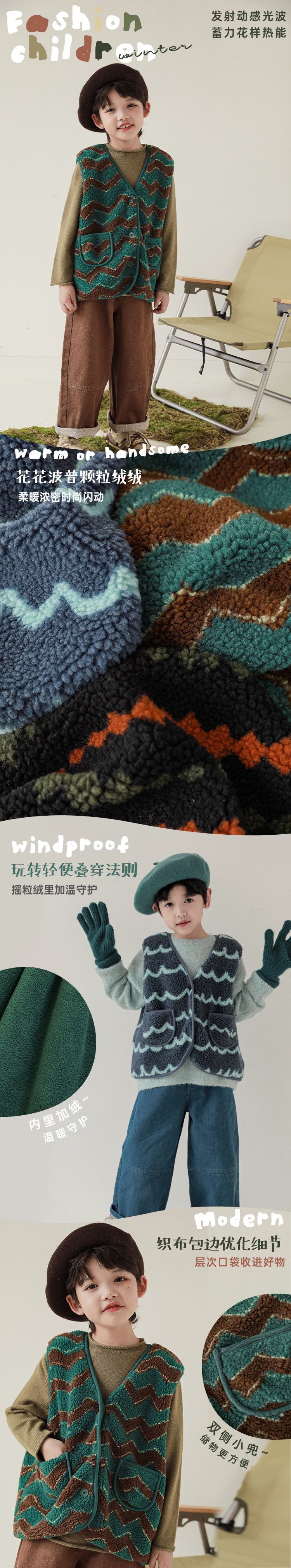 Wulibuyi 겨울 어린이 다채로운 골판지 직물 가장자리 더블 포켓 플러스 벨벳 조끼 소년 캐주얼 조끼 두꺼운