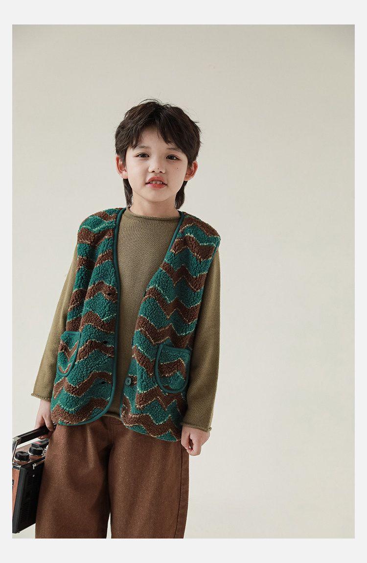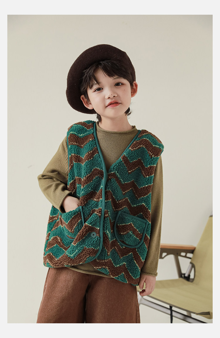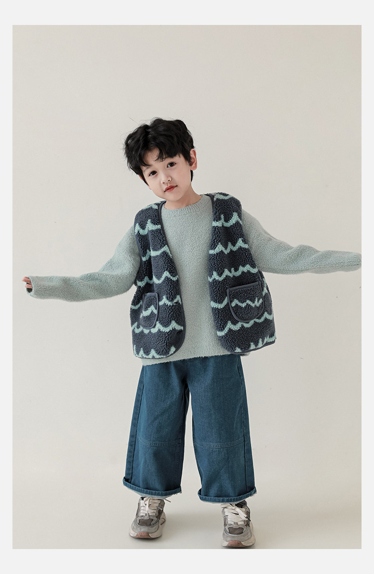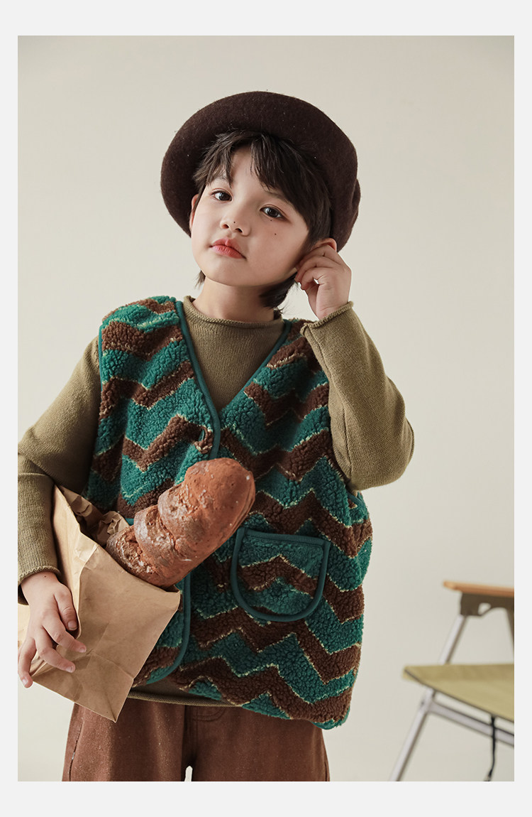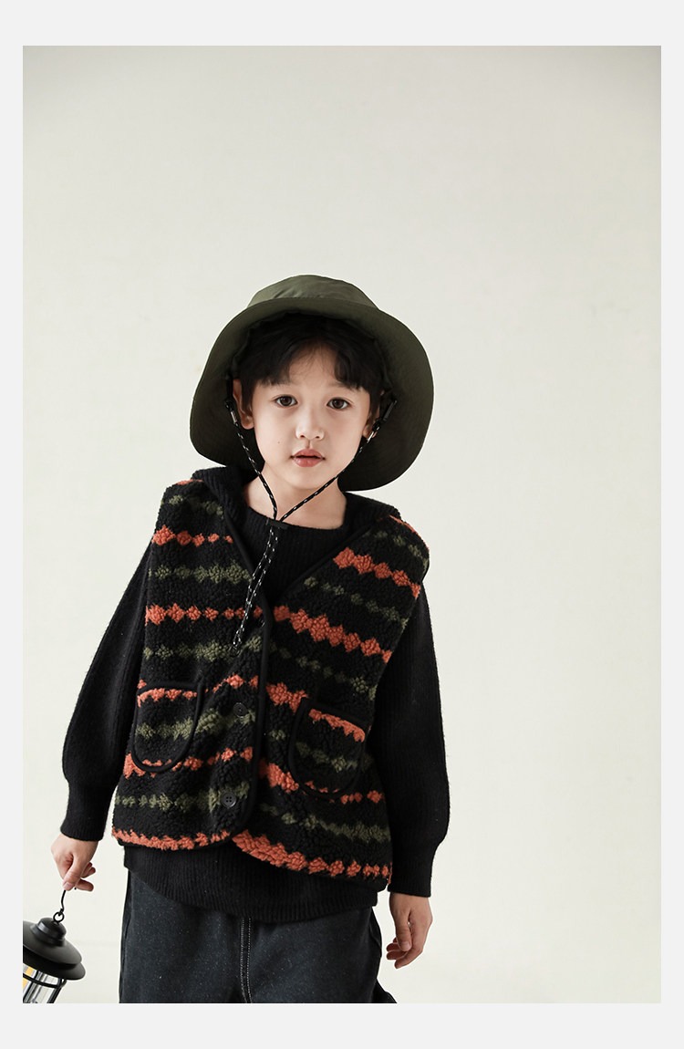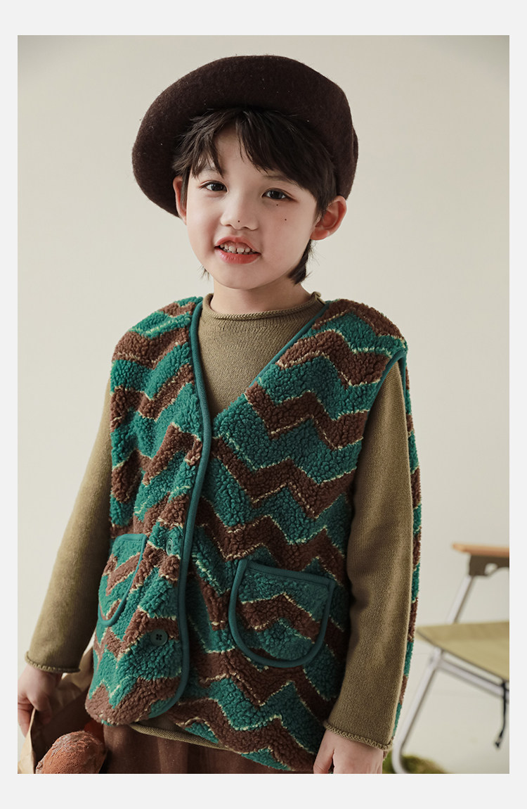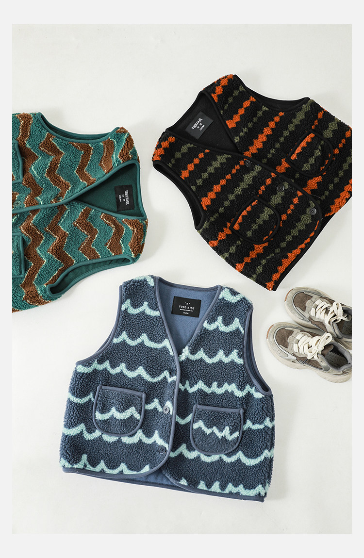 Wulibuyi 겨울 어린이 다채로운 골판지 직물 가장자리 더블 포켓 플러스 벨벳 조끼 소년 캐주얼 조끼 두꺼운스토어 가기