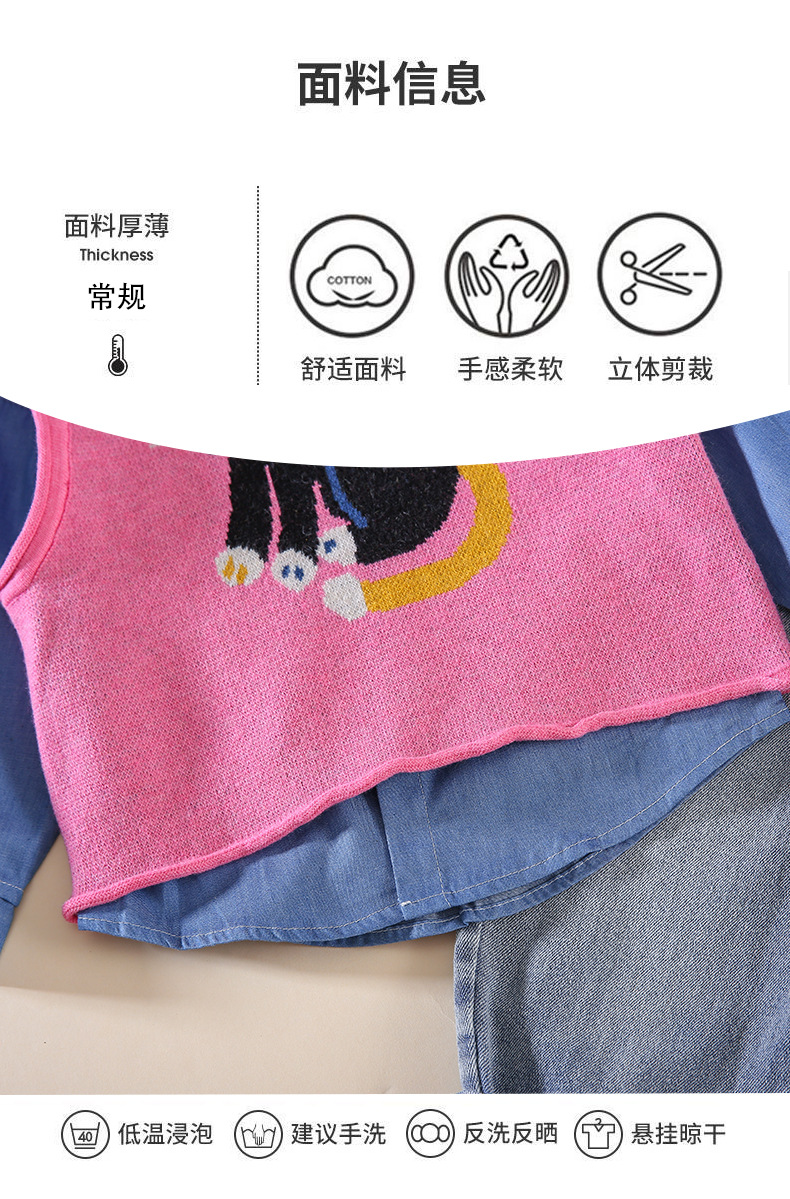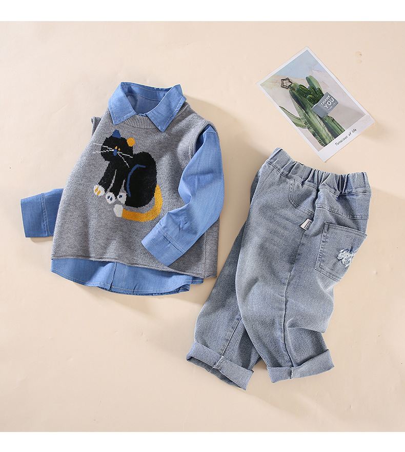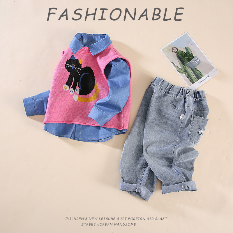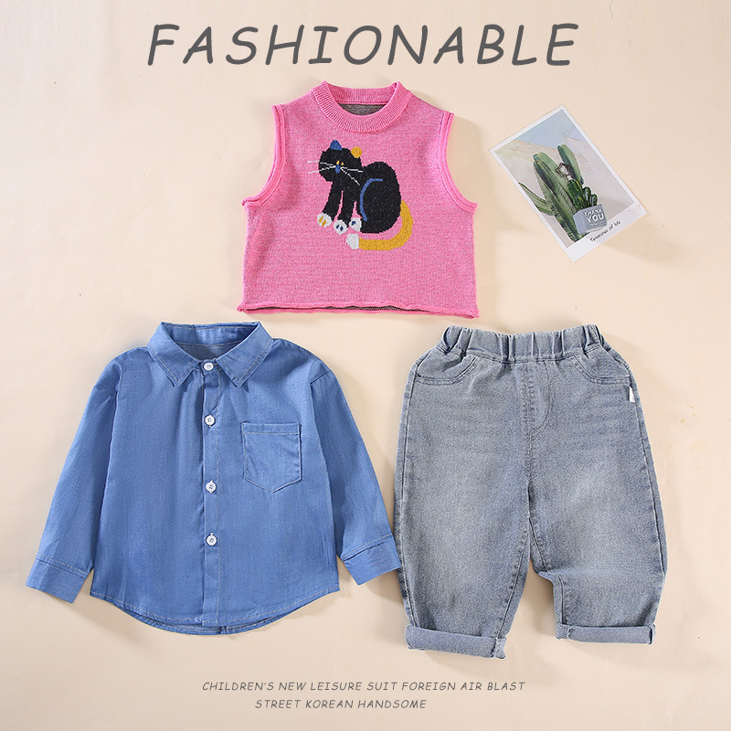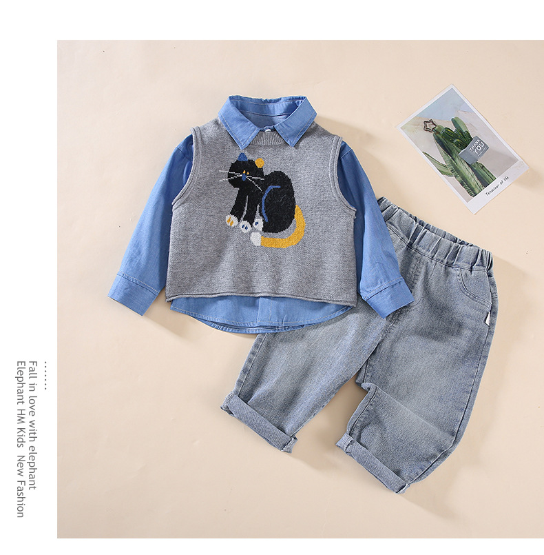 어린이 착용 소년 봄과 가을 세트 소년 아기 2024 가을 새로운 캐주얼 니트 셔츠 3 피스 세트 트렌디스토어 가기
