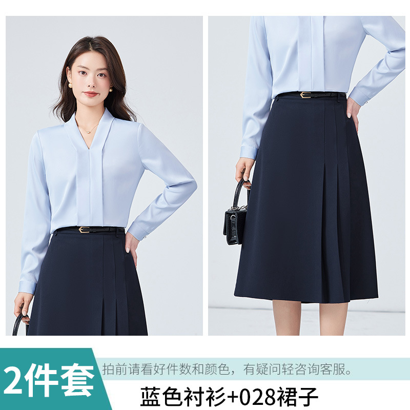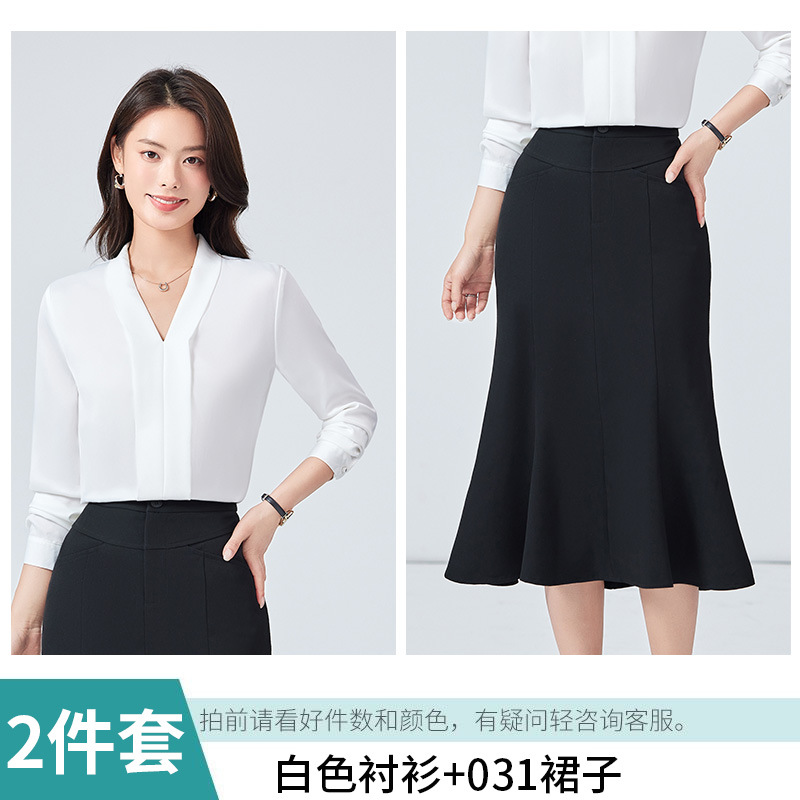 화이트 V 넥 긴 소매 셔츠 여성의 2024 봄과 가을 새로운 디자인 감각 틈새 OL 셔츠 피쉬 테일 스커트 전문 세트스토어 가기