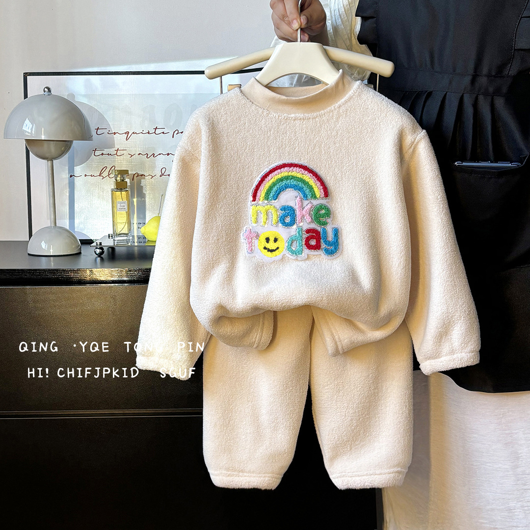 가을/겨울 새 기모 패딩 된 어린이 잠옷 남학생과 여학생을위한 한국어 버전의 따뜻한 잠옷 세트 한 세대의 머리카락