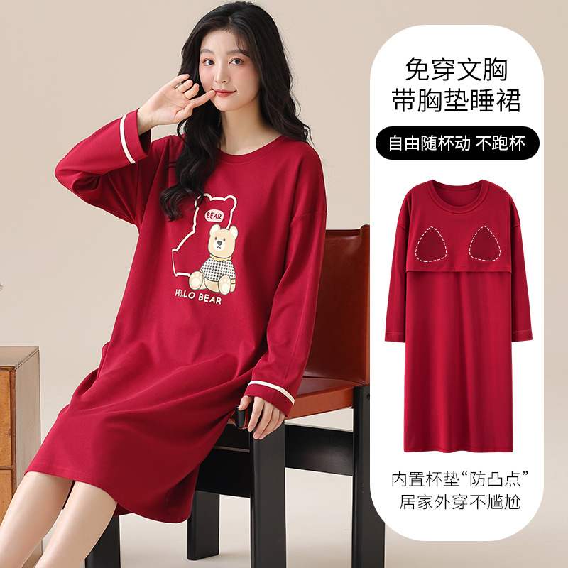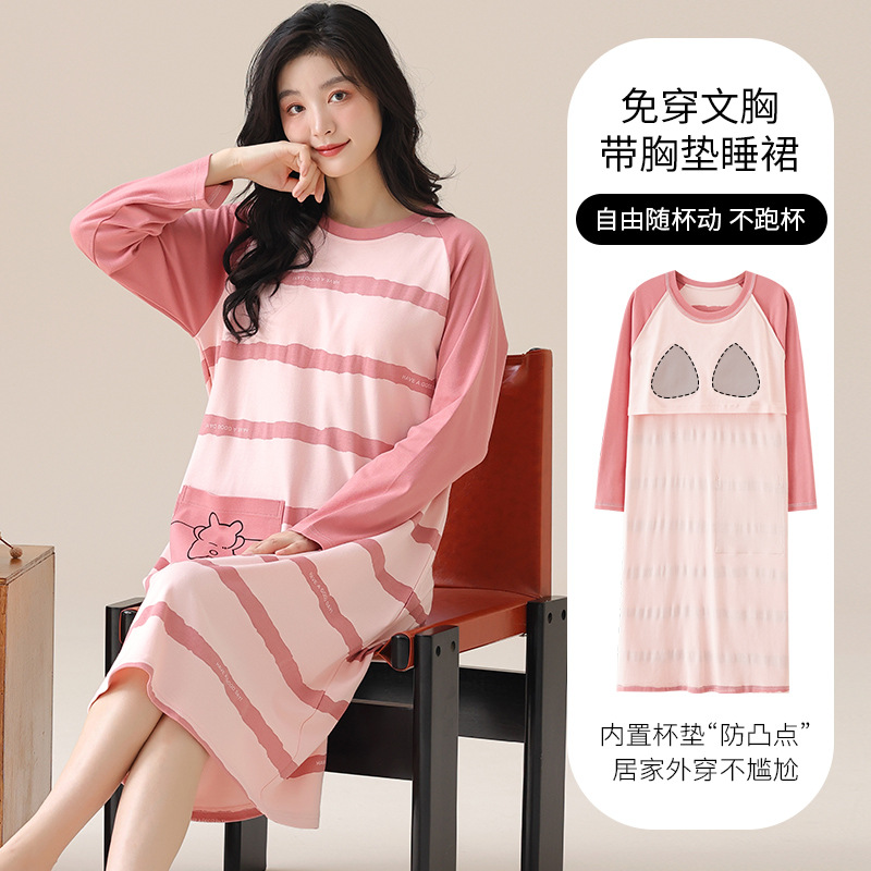 가슴 패드 원피스 긴 소매 순수 코튼 새로운 5xl 플러스 사이즈 한국 스타일 편안한 원피스 나이트 드레스
