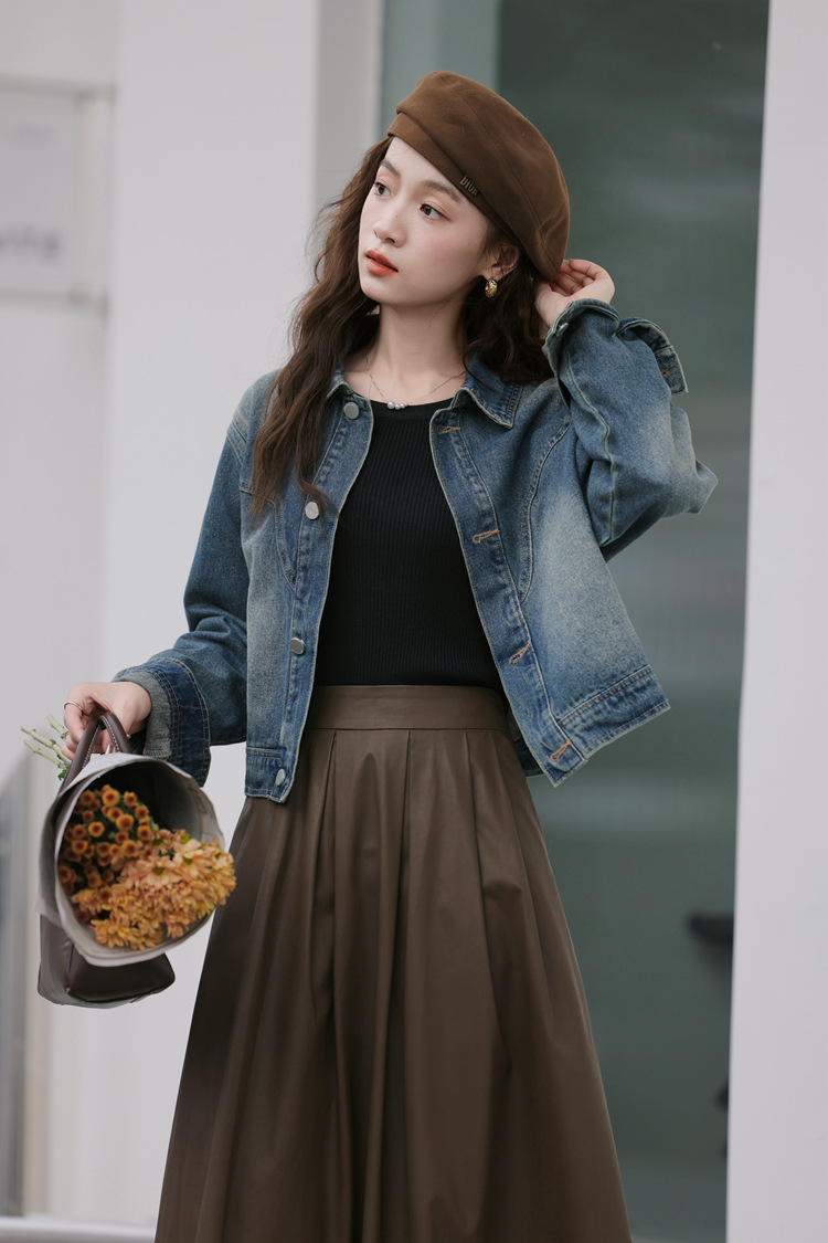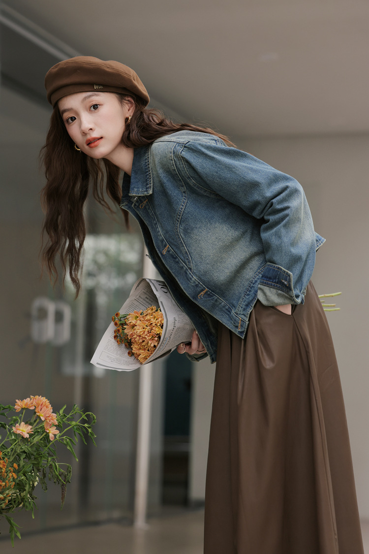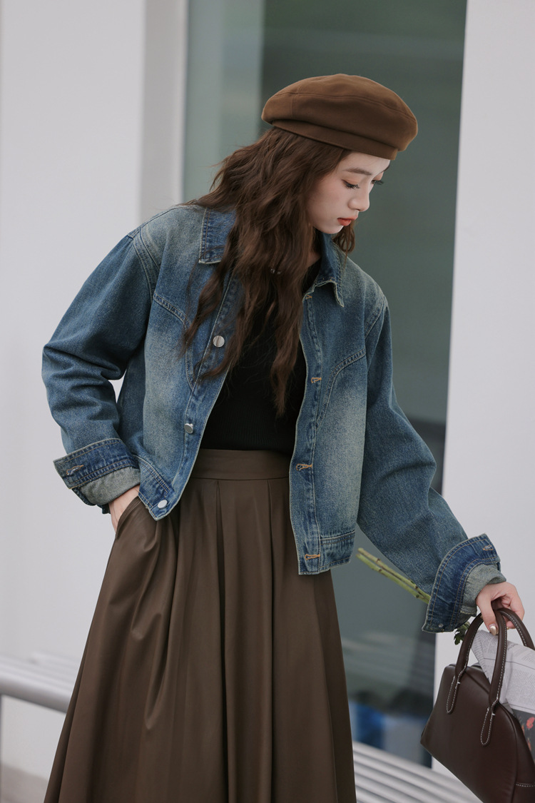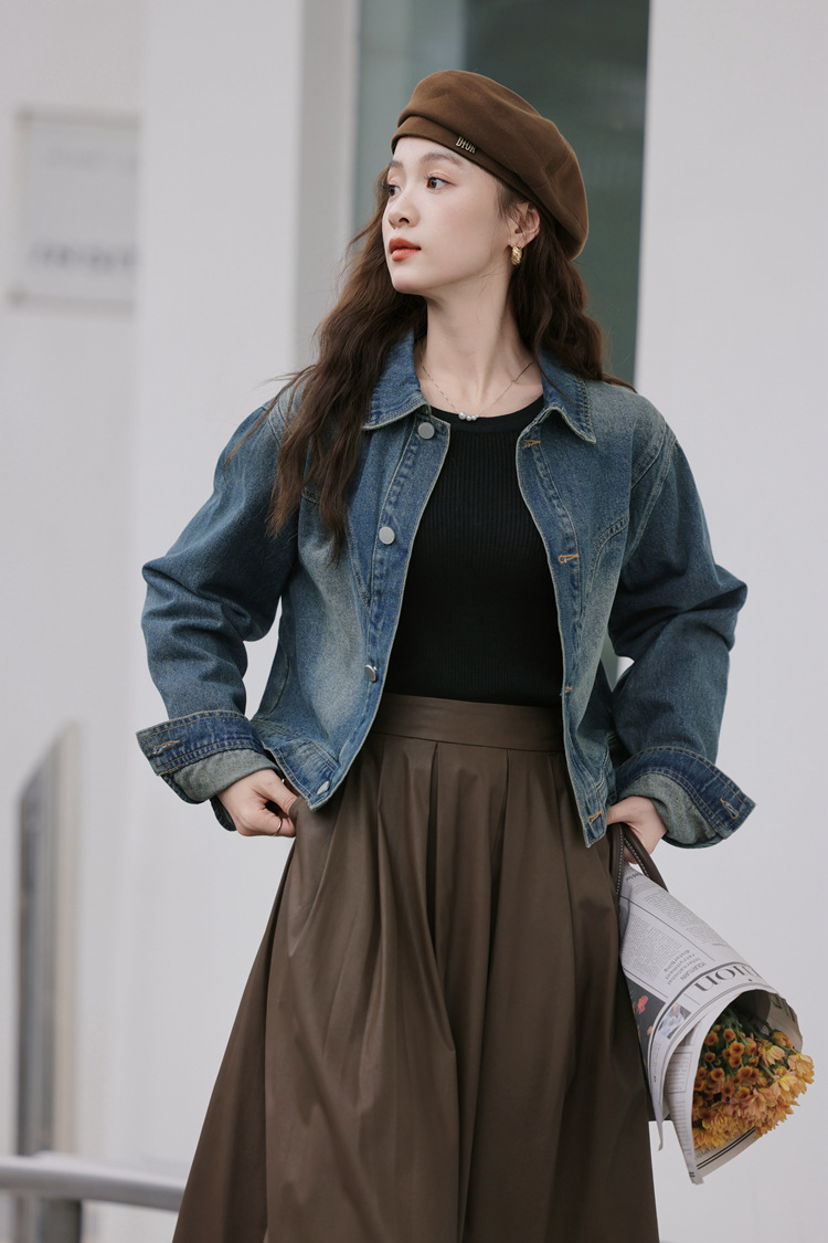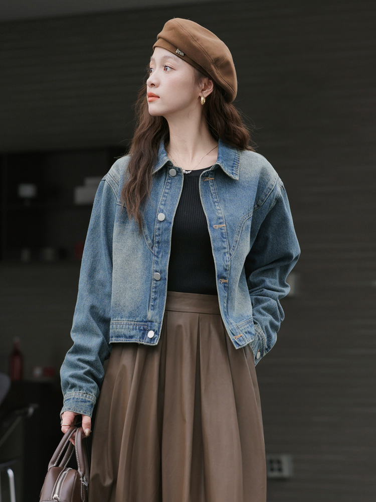 한국 스타일의 빈티지 옷깃 긴 소매 데님 코트 여성의 2024 가을 새로운 짧은 재킷 탑