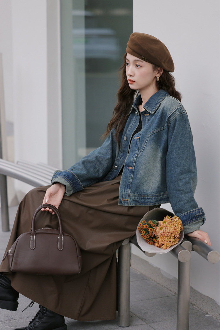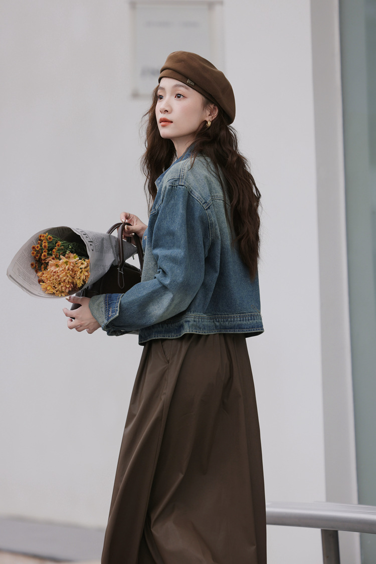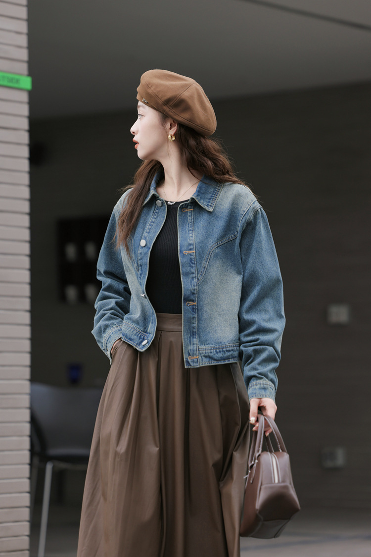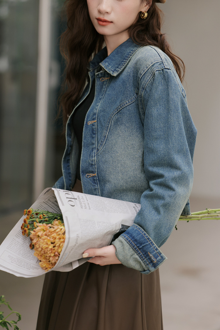 한국 스타일의 빈티지 옷깃 긴 소매 데님 코트 여성의 2024 가을 새로운 짧은 재킷 탑스토어 가기