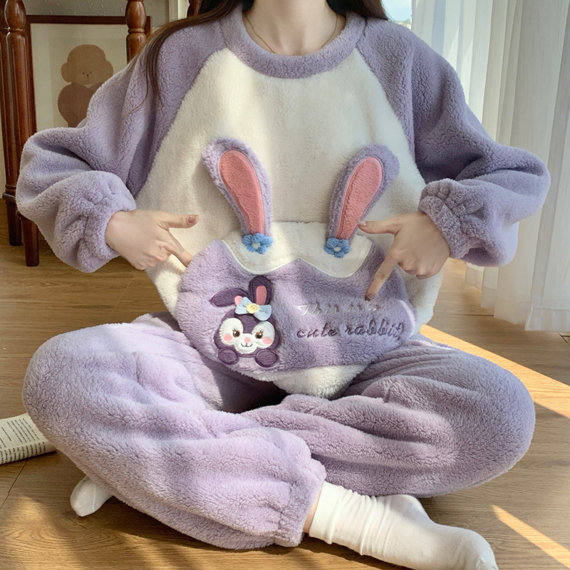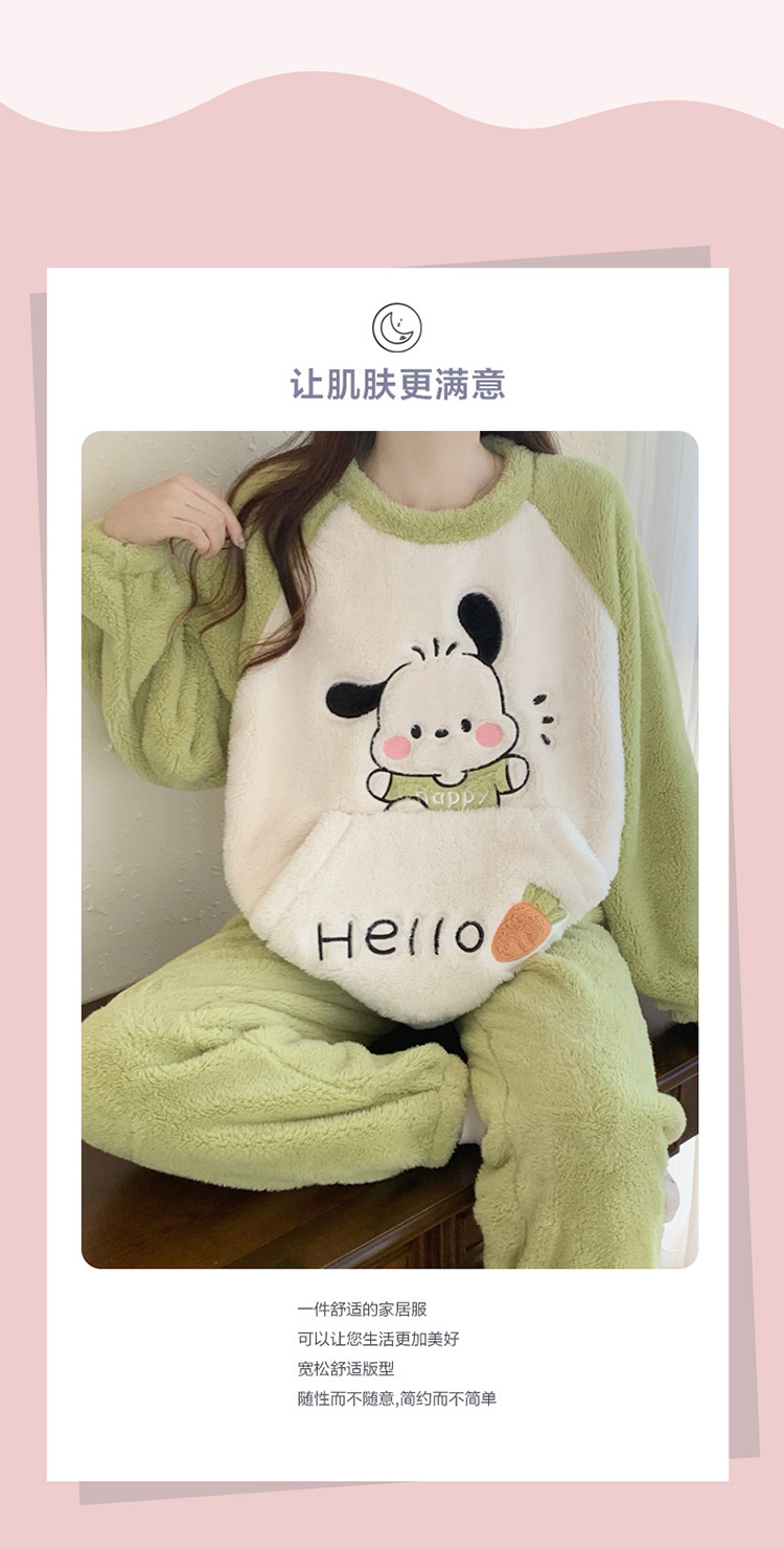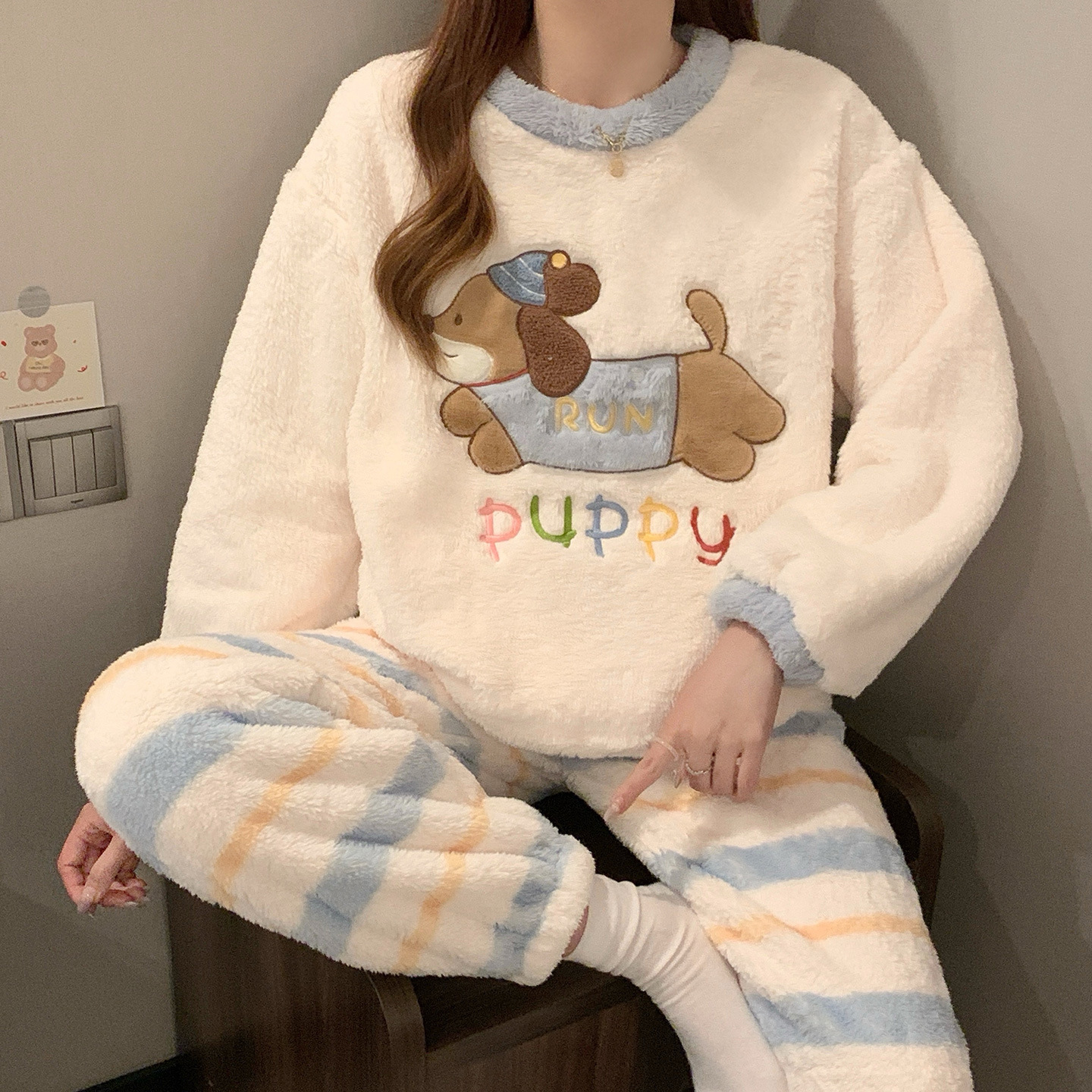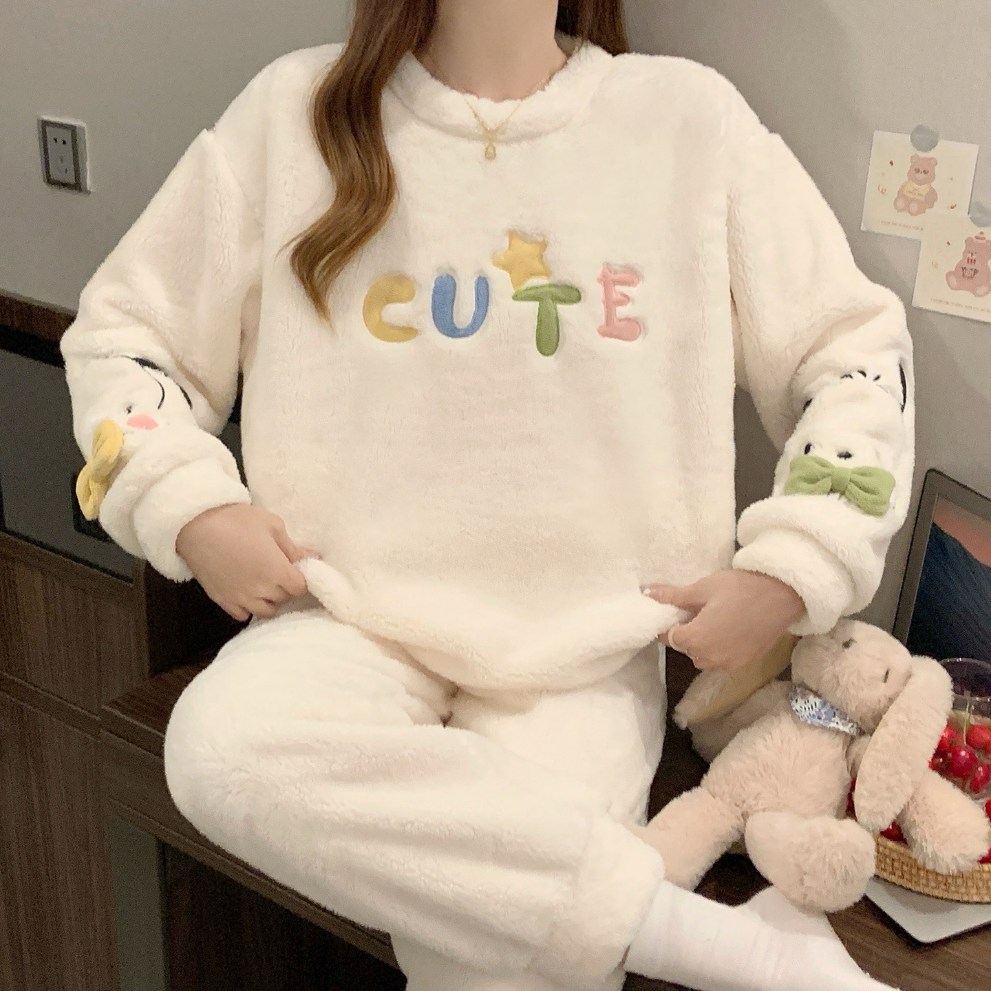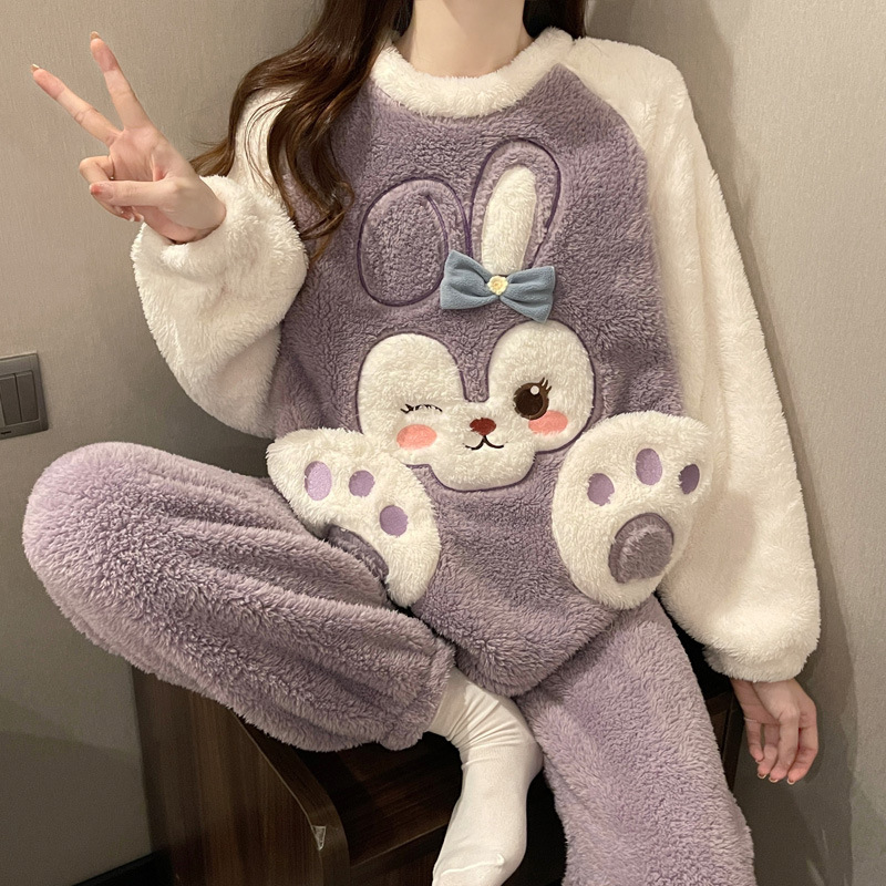 2025년 신상 여성용 잠옷 가을 겨울 귀여운 만화 캐릭터 두꺼운 산호 벨벳 홈웨어 캐주얼 플란넬 세트스토어 가기