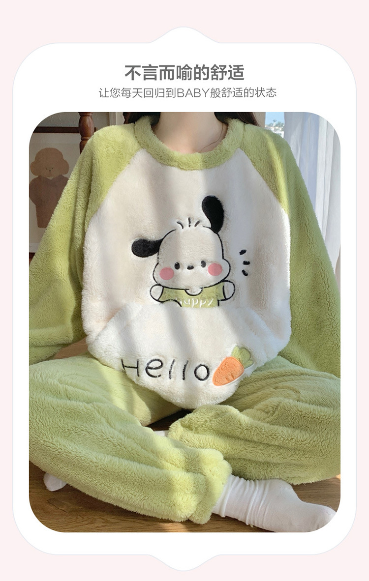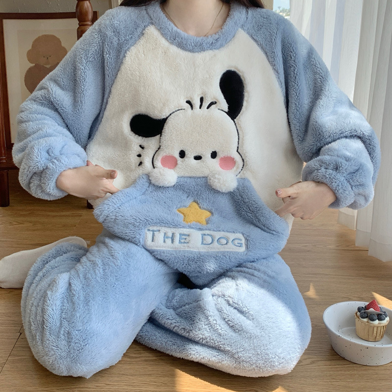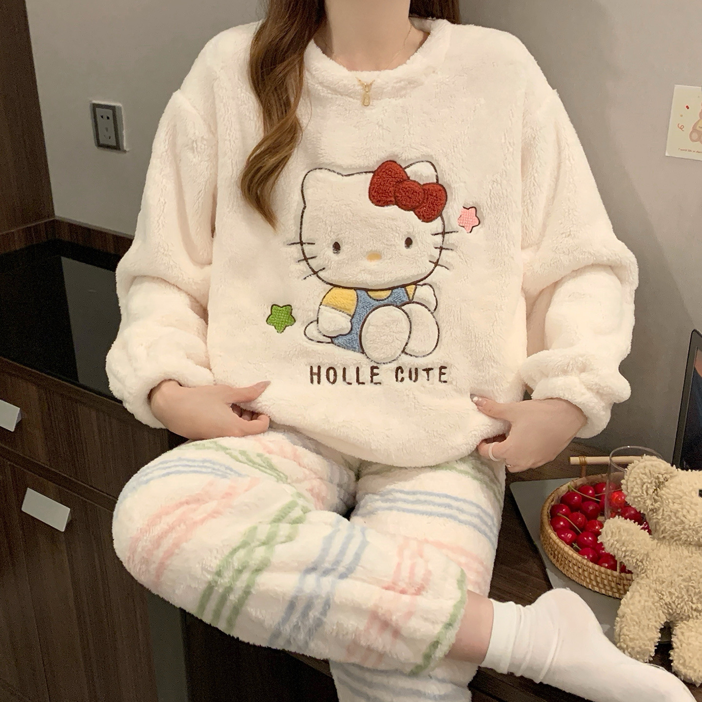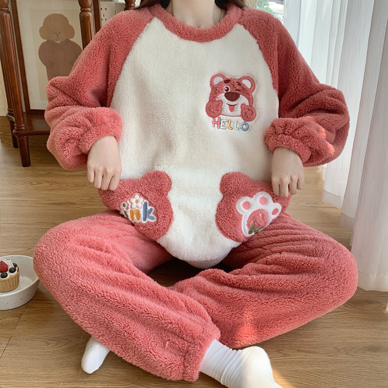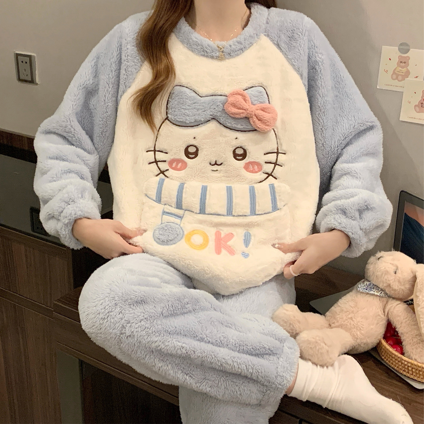 2025년 신상 여성용 잠옷 가을 겨울 귀여운 만화 캐릭터 두꺼운 산호 벨벳 홈웨어 캐주얼 플란넬 세트스토어 가기