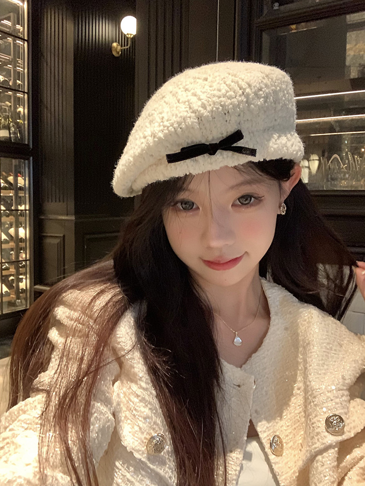 일본 활 봉제 베레 여자 가을 겨울 2024 새로운 달콤한 분위기 모든 경기 화가의 모자는 작은 얼굴을 보여줍니다스토어 가기