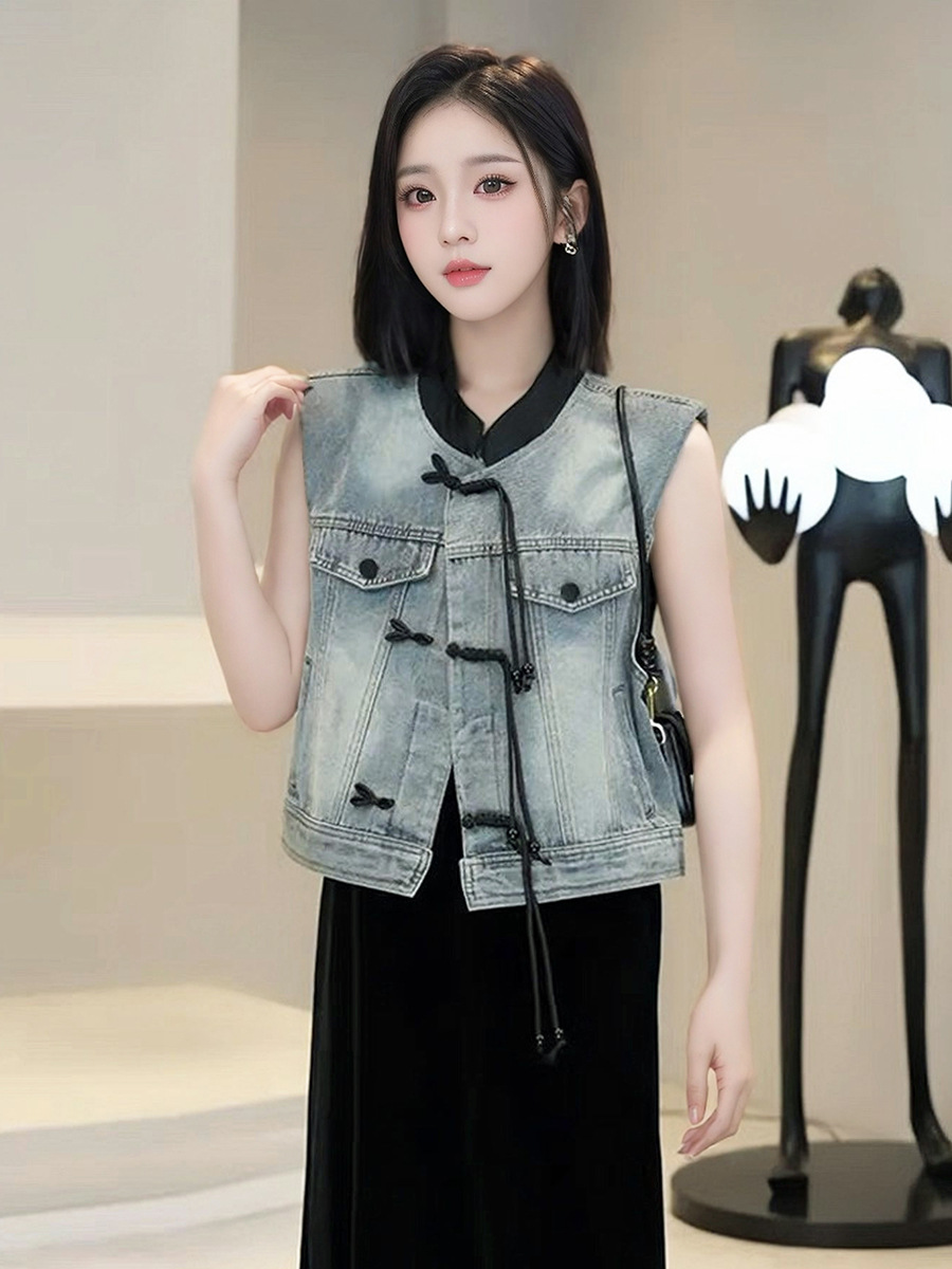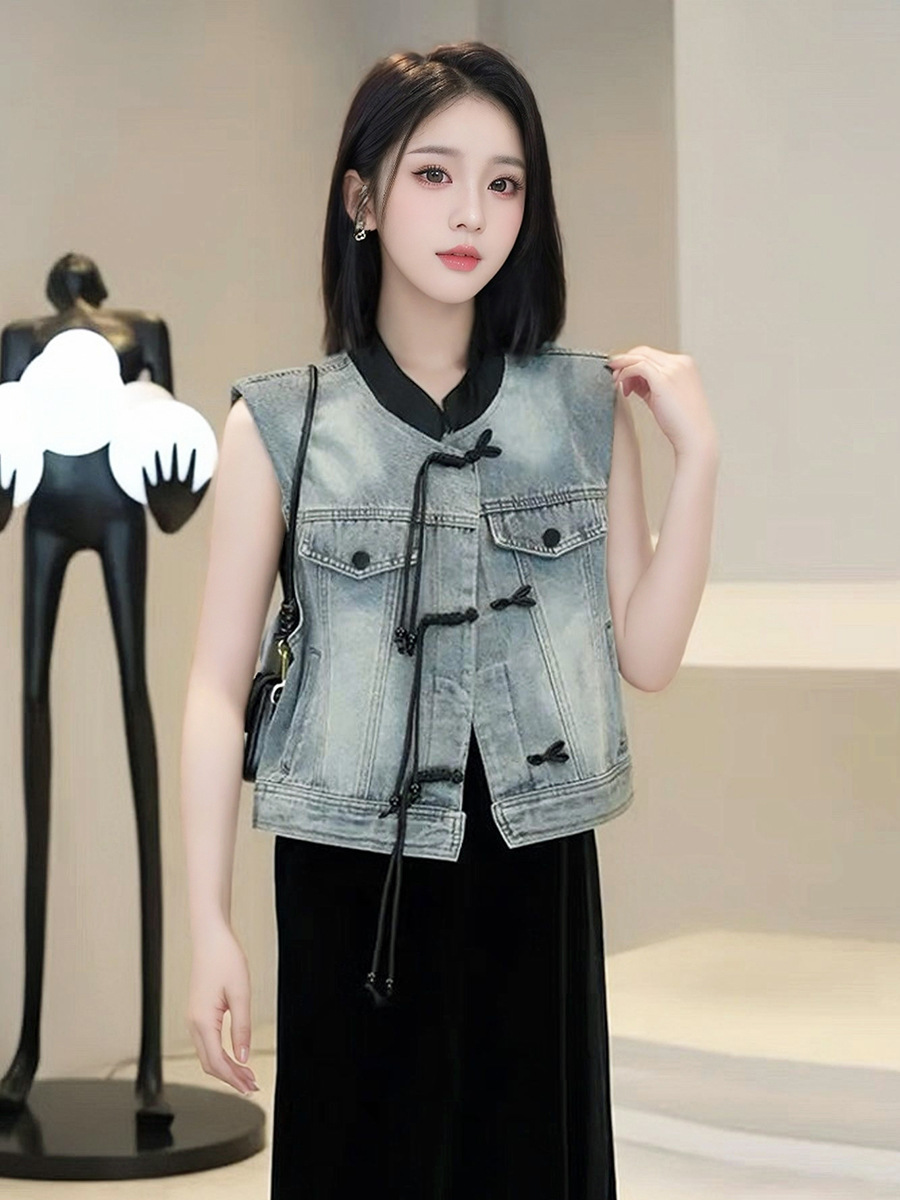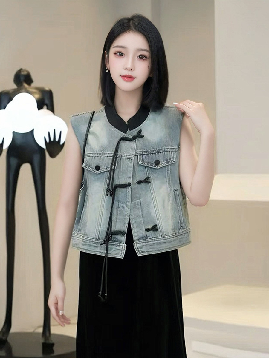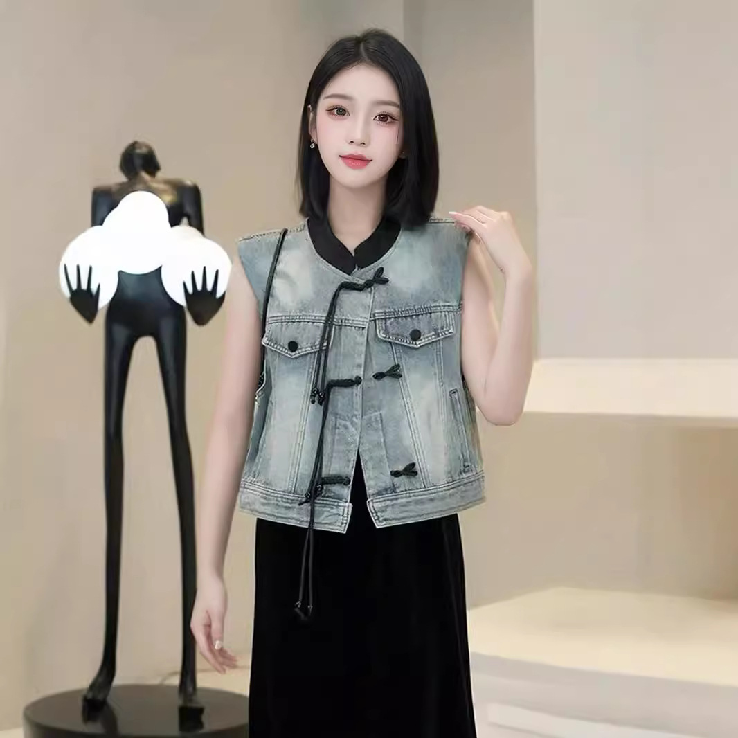 새로운 중국 스타일 국가 스타일 데님 조끼 코트 여성의 2024 새로운 빈티지 짧은 소매 재킷스토어 가기