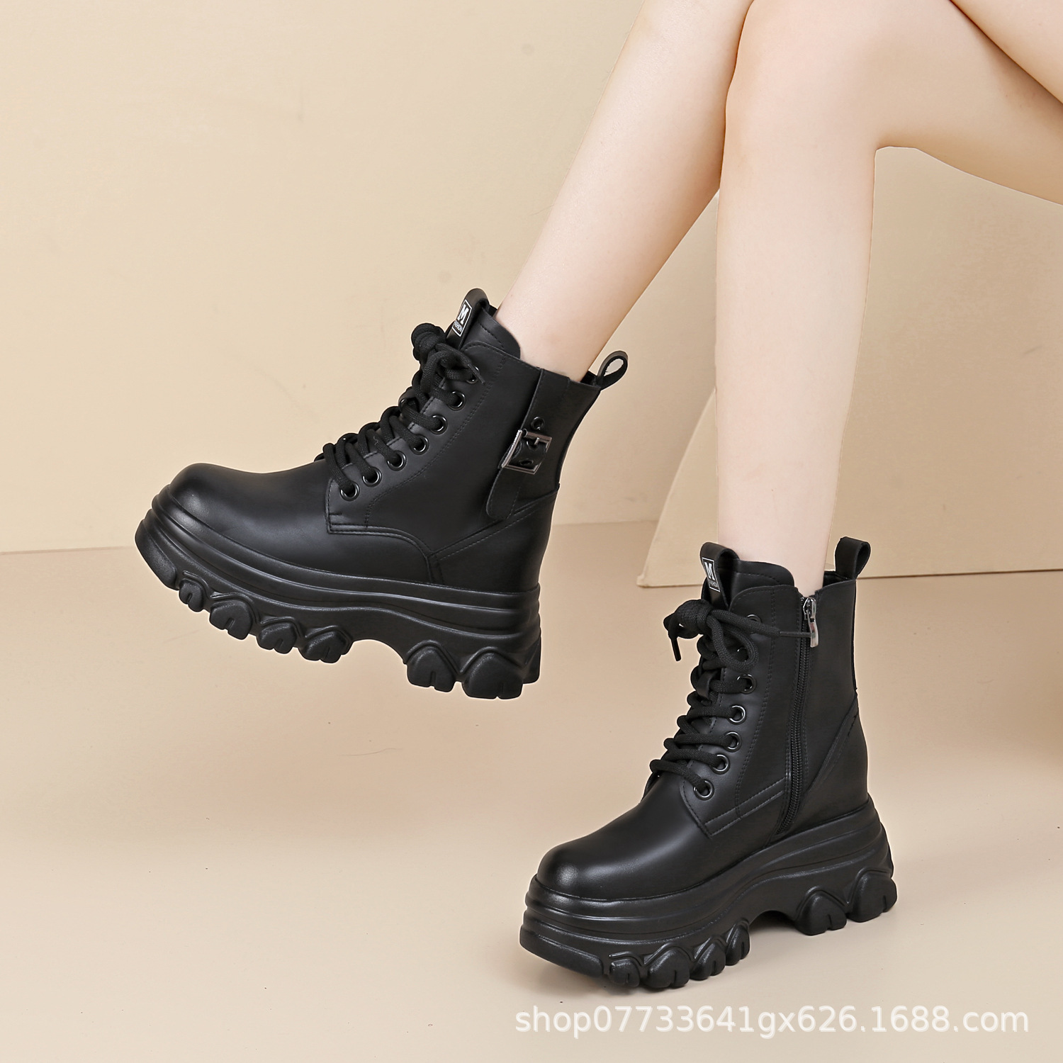 내부 강화 마틴 부츠 여성용 두꺼운 밑창 짧은 하이힐 짧은 부츠 웨지 힐 편안한 싱글 레이어 부츠 여성용 겨울 기모 가죽 부츠스토어 가기