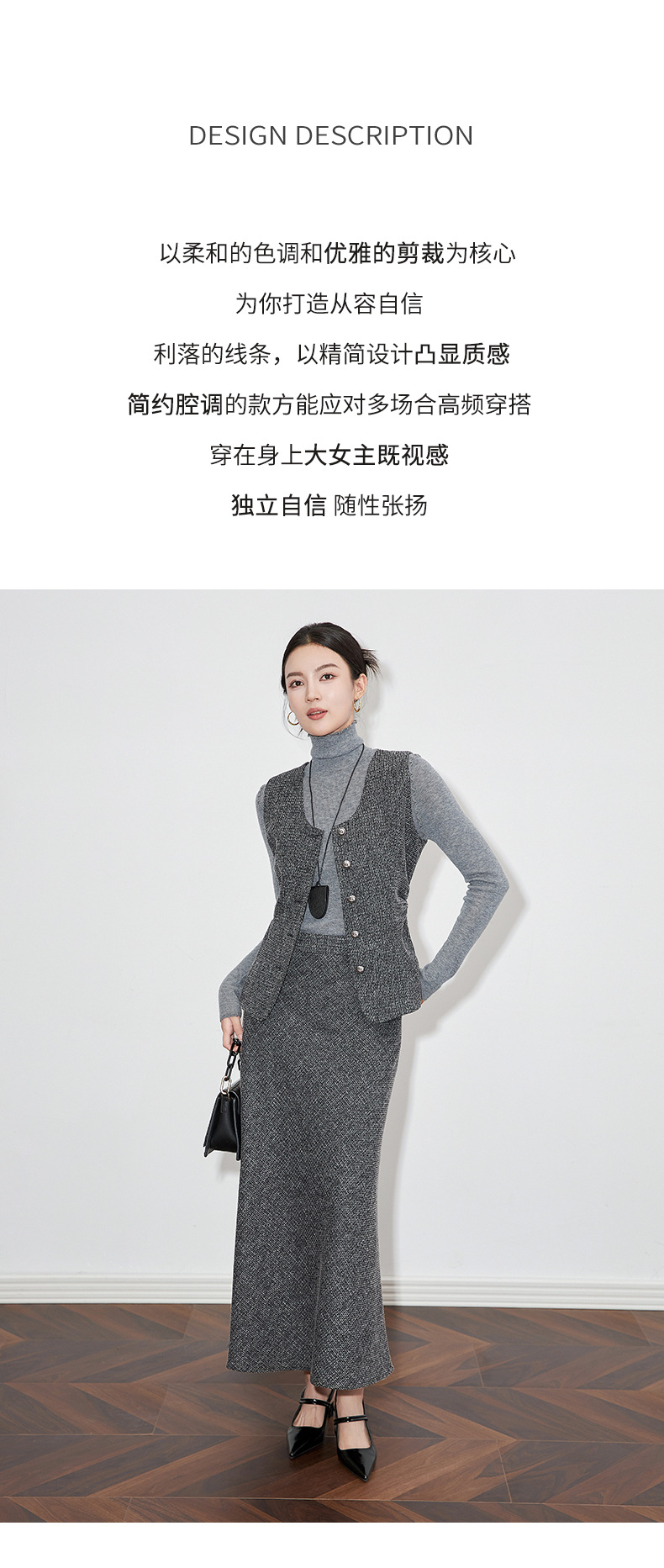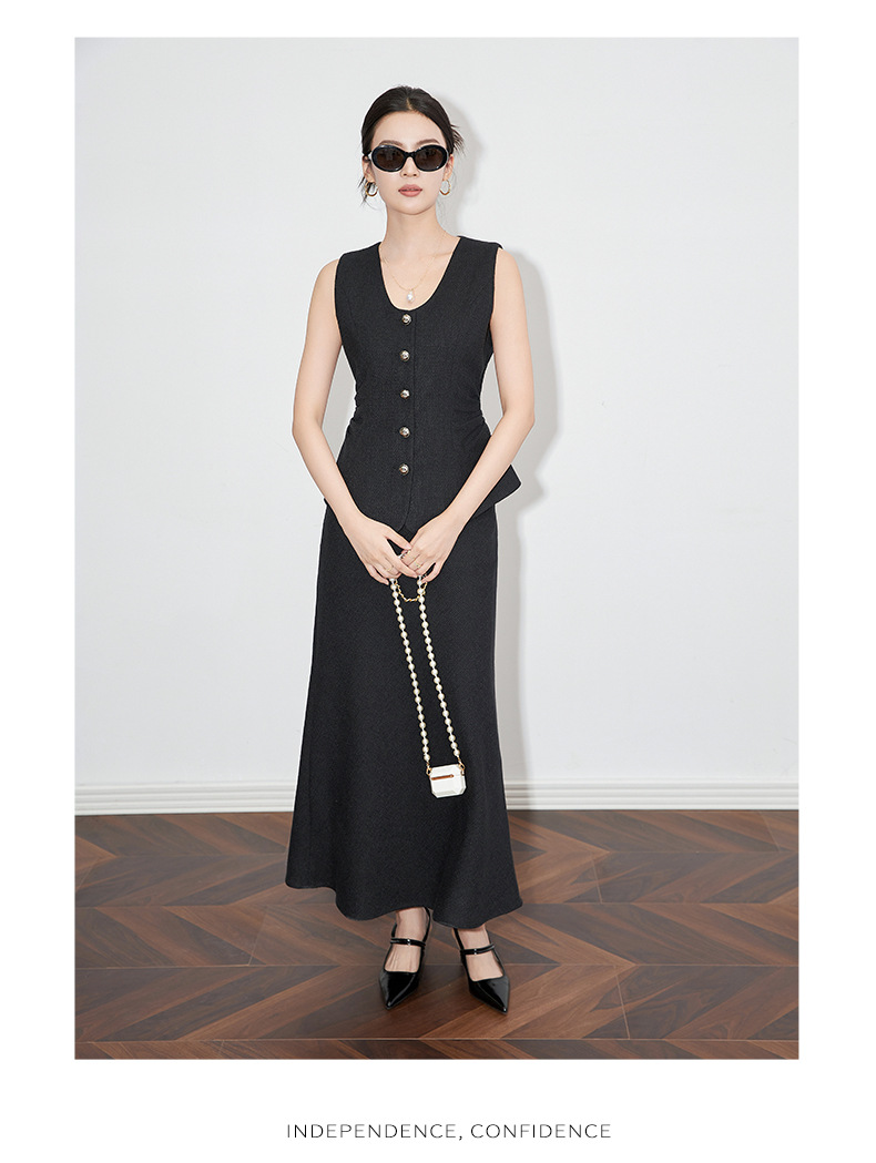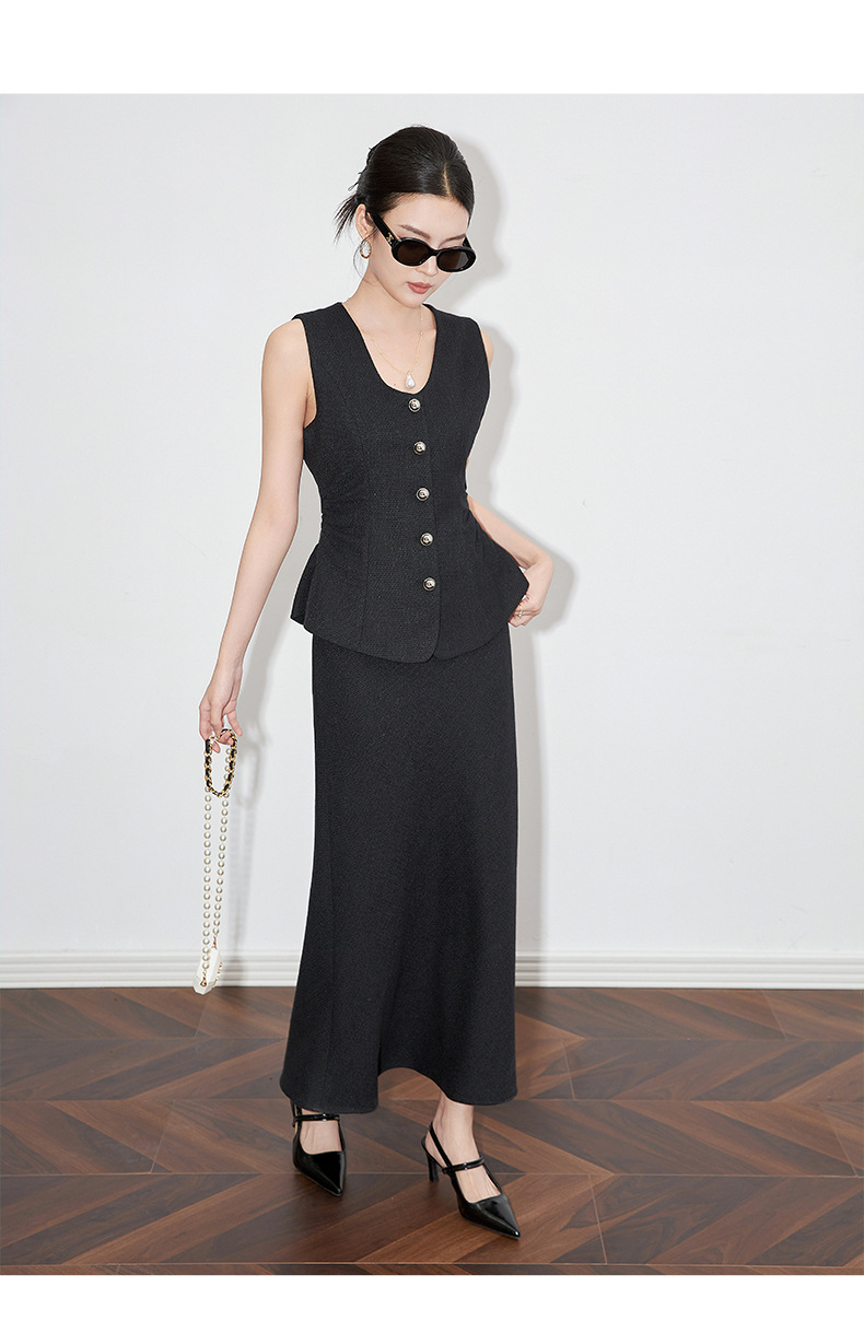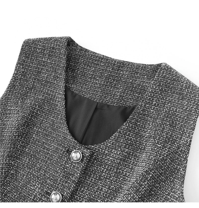2430411-중공업 럭셔리 예비 원사 소재 올드 머니 패션 민소매 자켓 피쉬 오버 스커트 투피스 세트